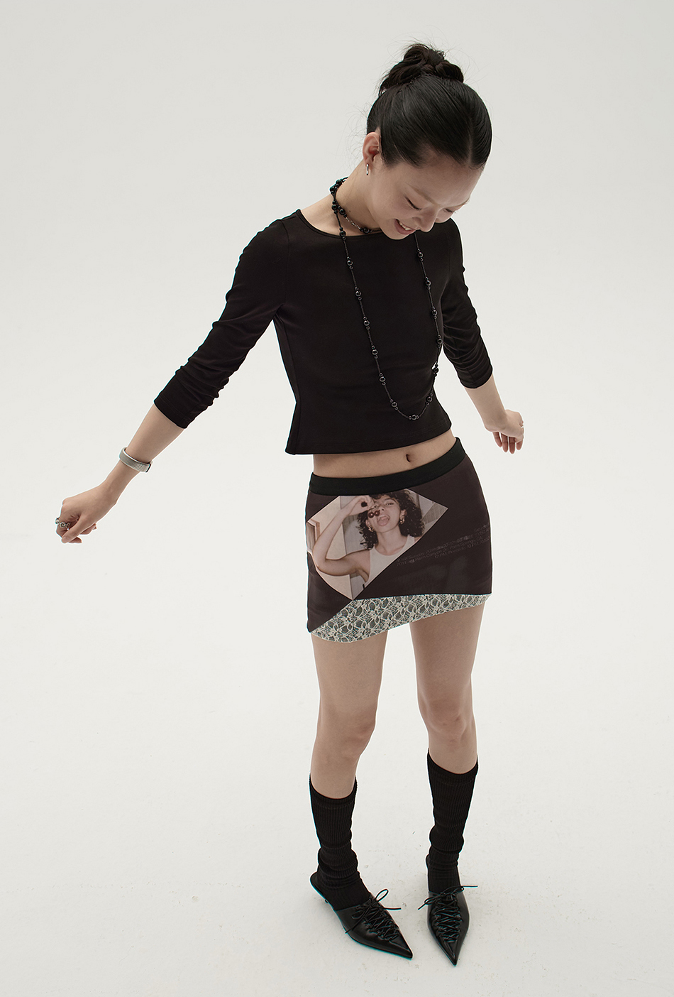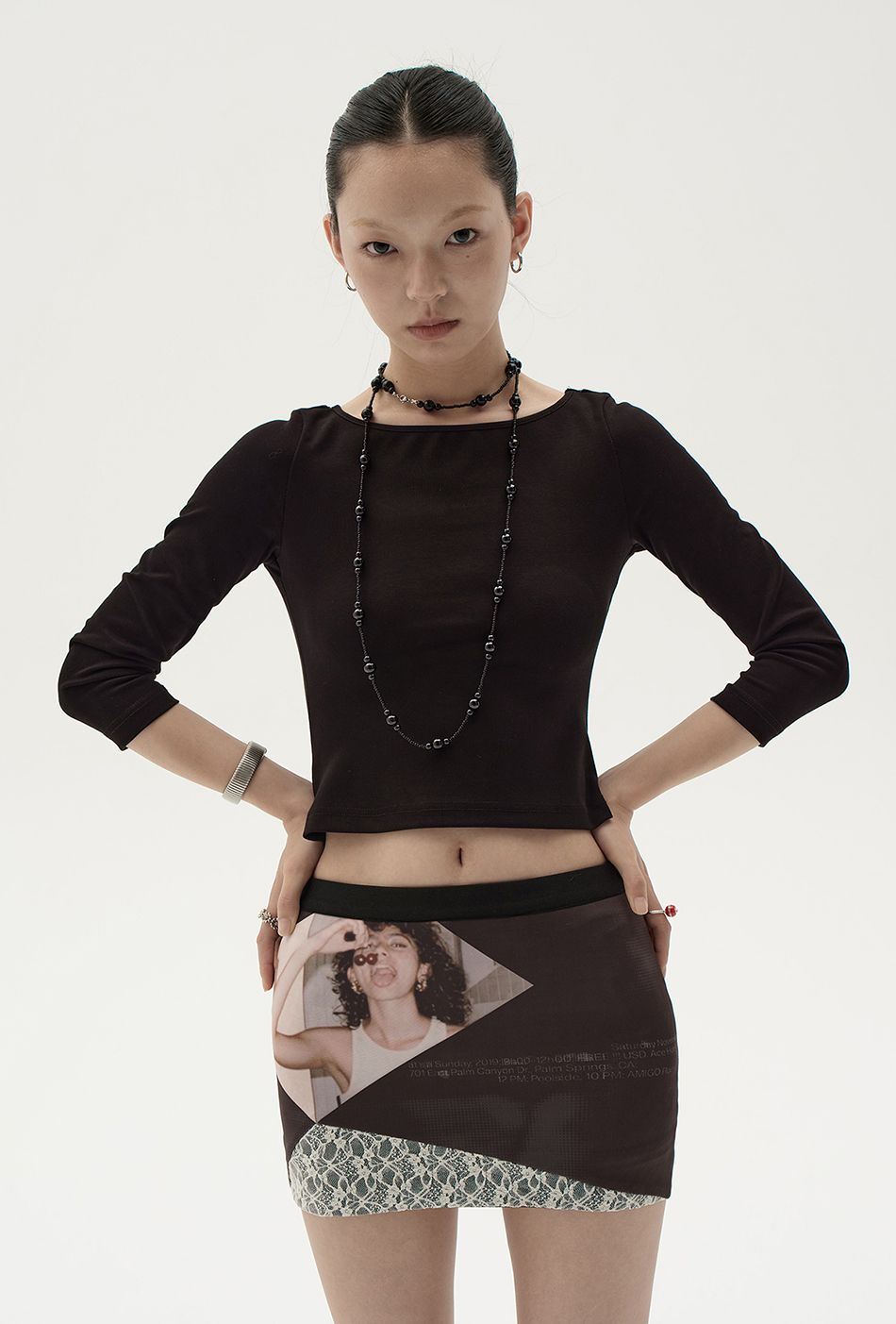 스판원단을 사용하여 바디라인을 살려주고 빈티지한 프린팅과