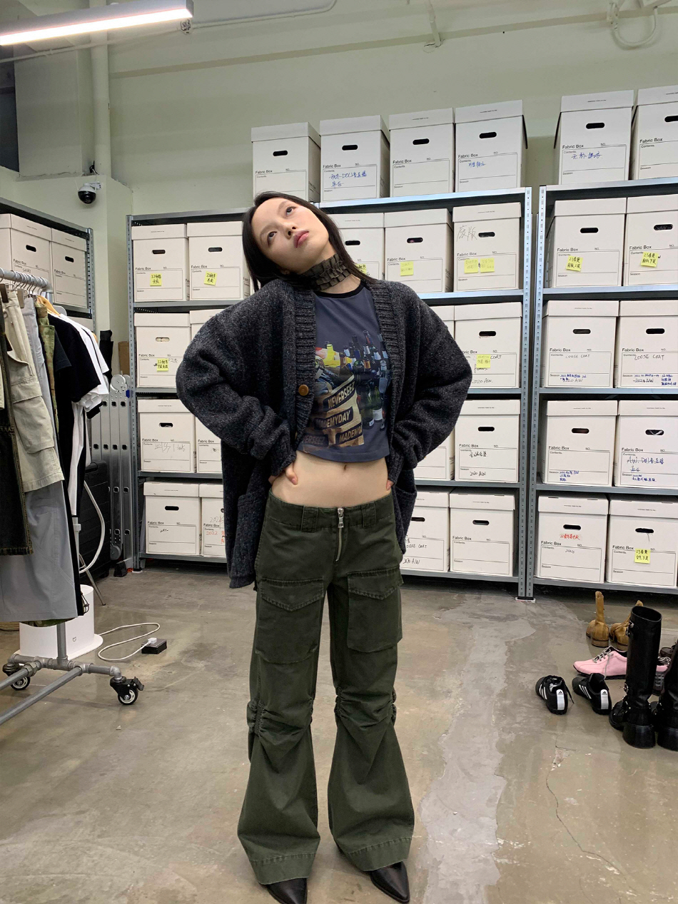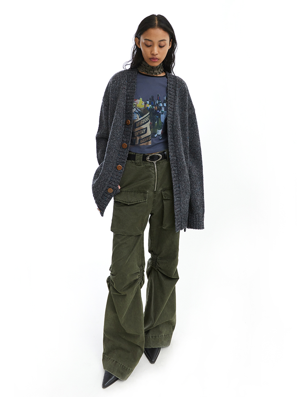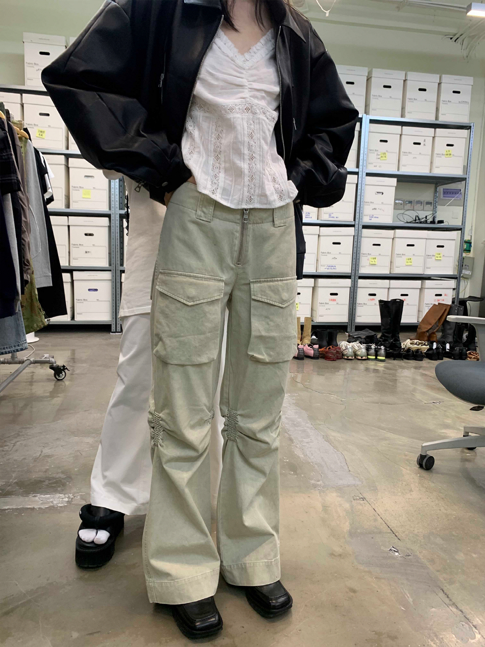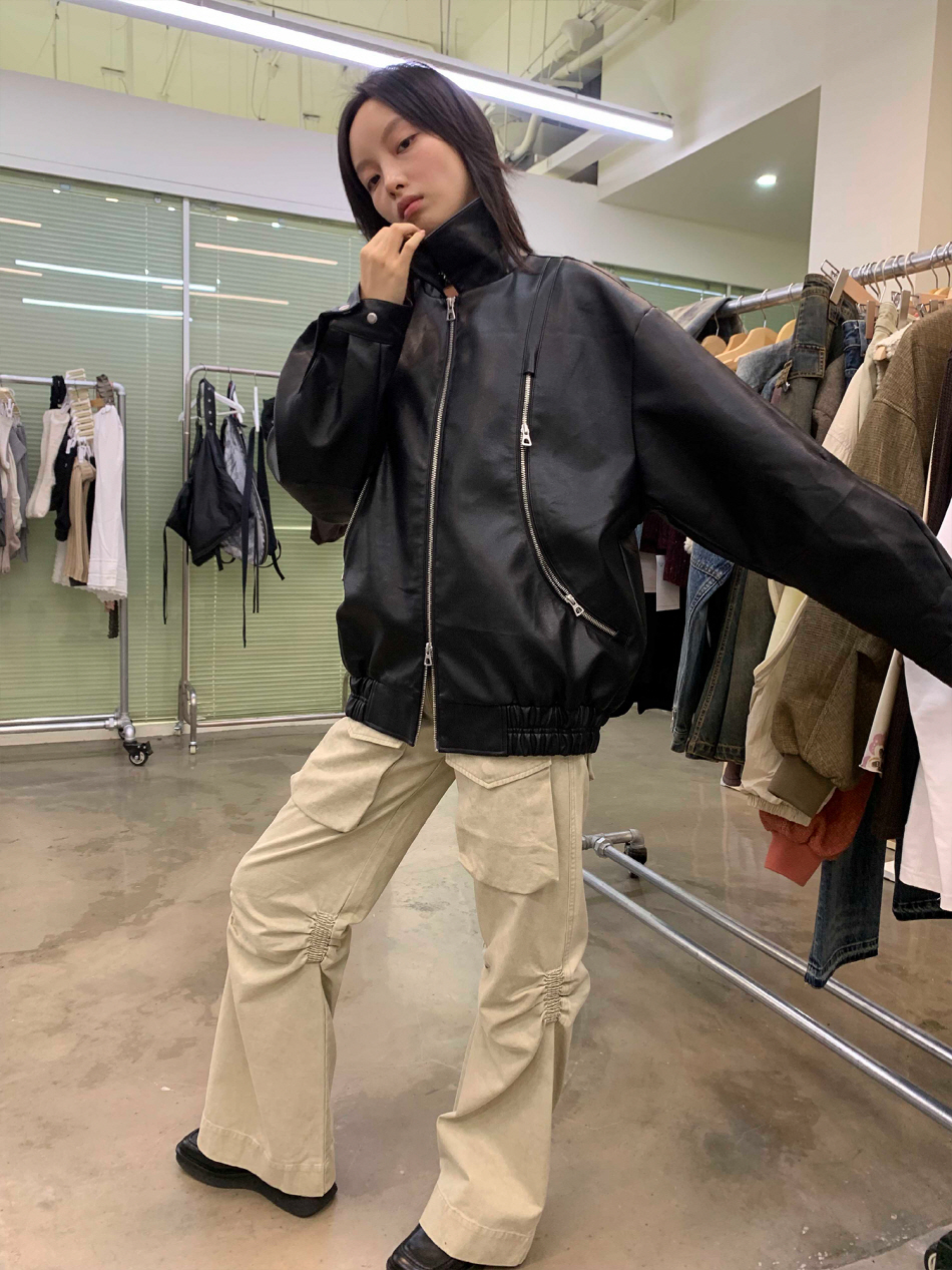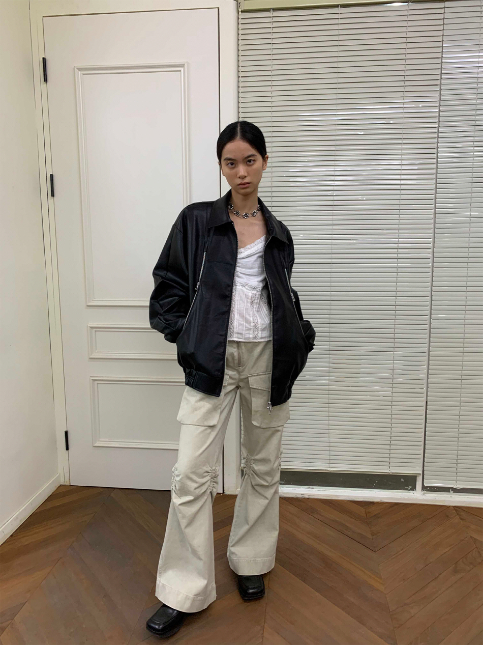 오픈된 형태의 지퍼, 포켓 디자인, 무릎 부분 플리츠 디테일을 추가하여 유니크한 비주얼을 보여줍니다.