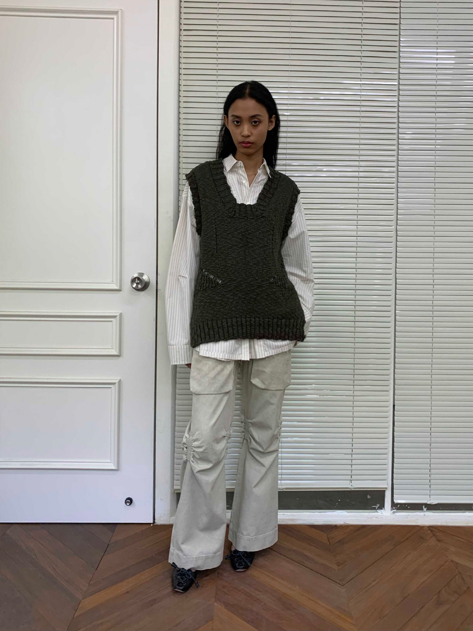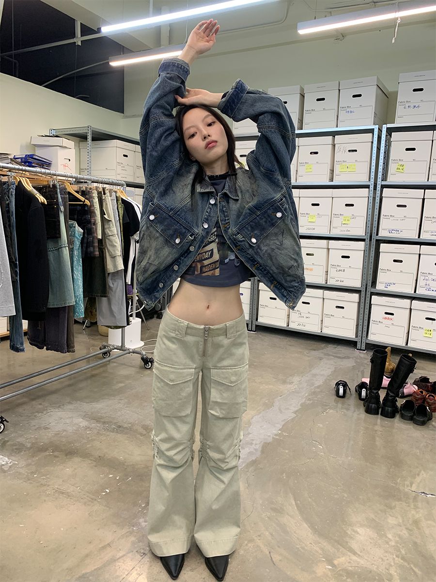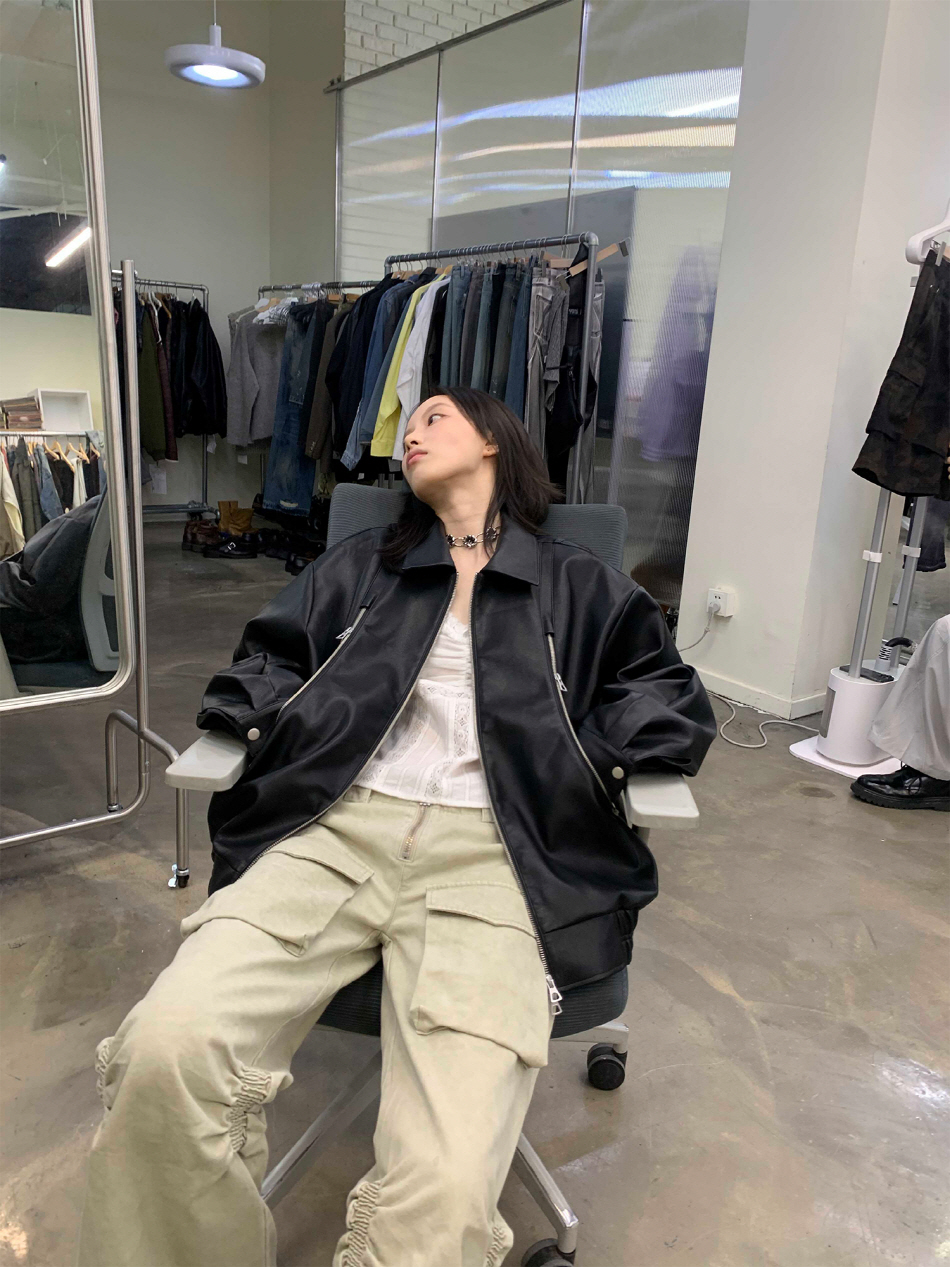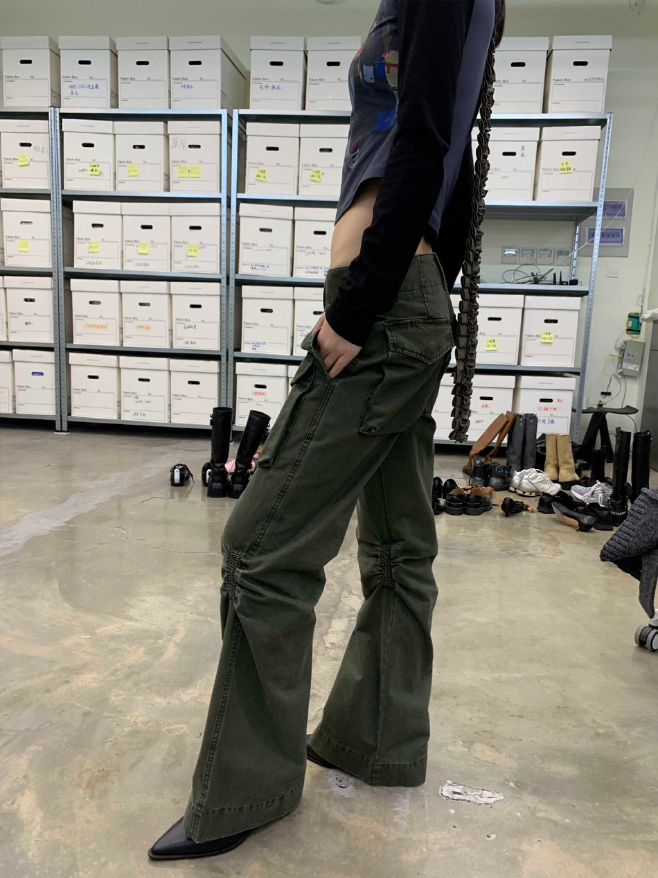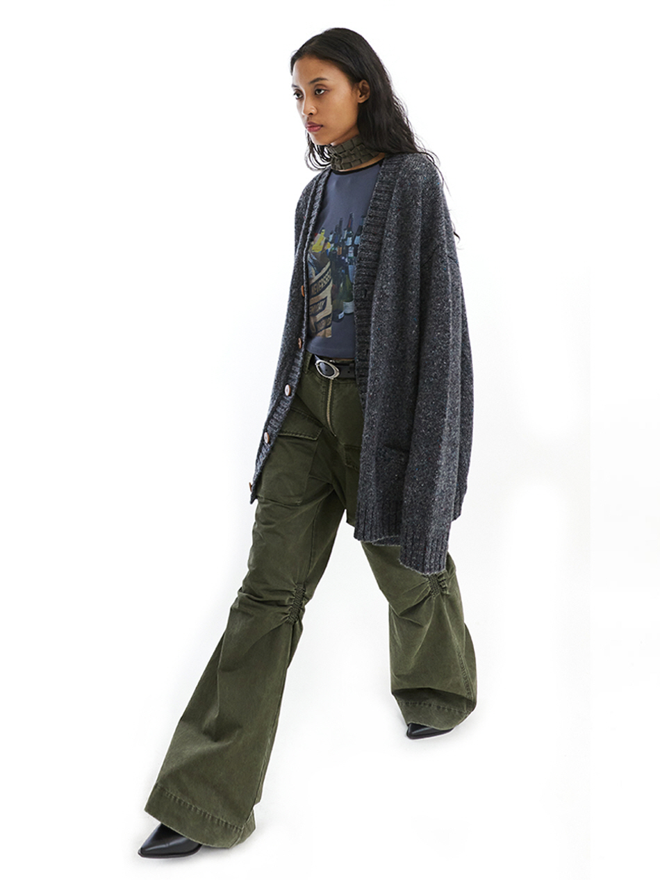 오픈된 형태의 지퍼, 포켓 디자인, 무릎 부분 플리츠 디테일을 추가하여 유니크한 비주얼을 보여줍니다.