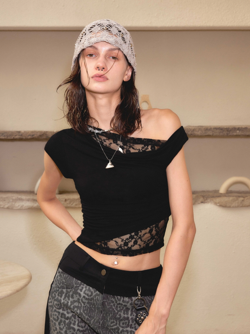 Straight shoulder lace short-sleeved T-shirt