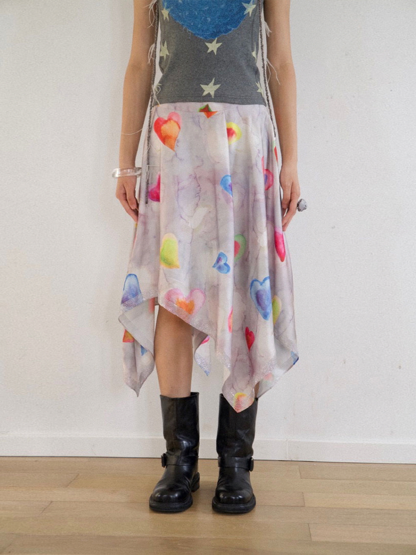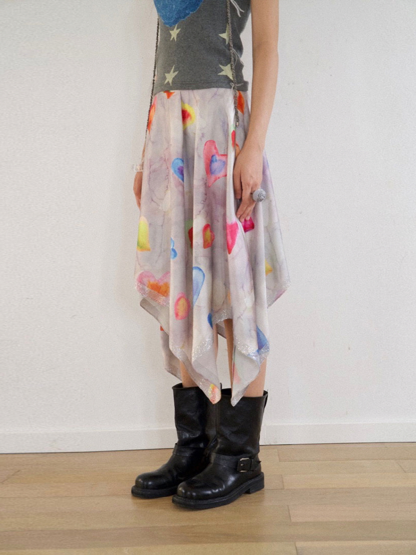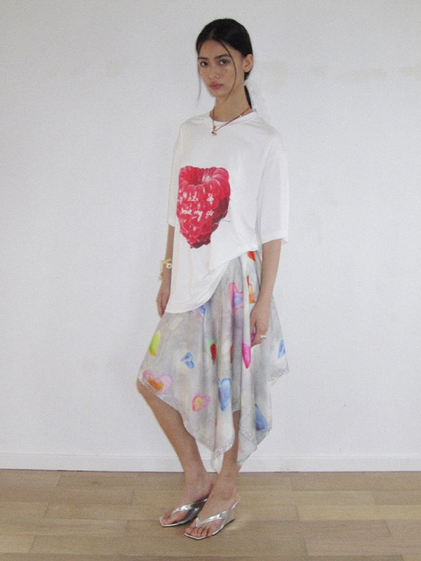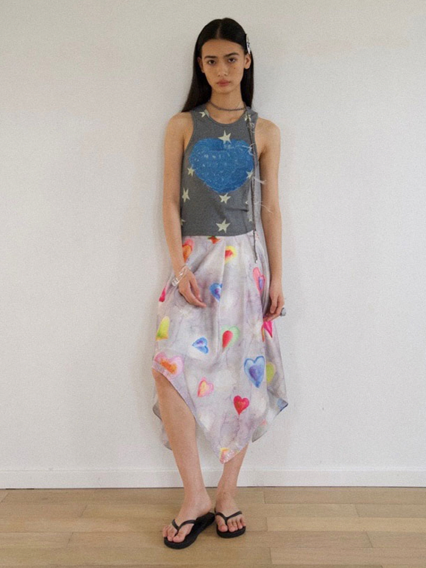 하트 디테일이 들어간 실크 드레이프 형태, 편안한 허리 밴드, 언밸런스한 웨이브 모양의 밑단이 어우려져 귀여우면서도 고급스러운 스커트입니다.
