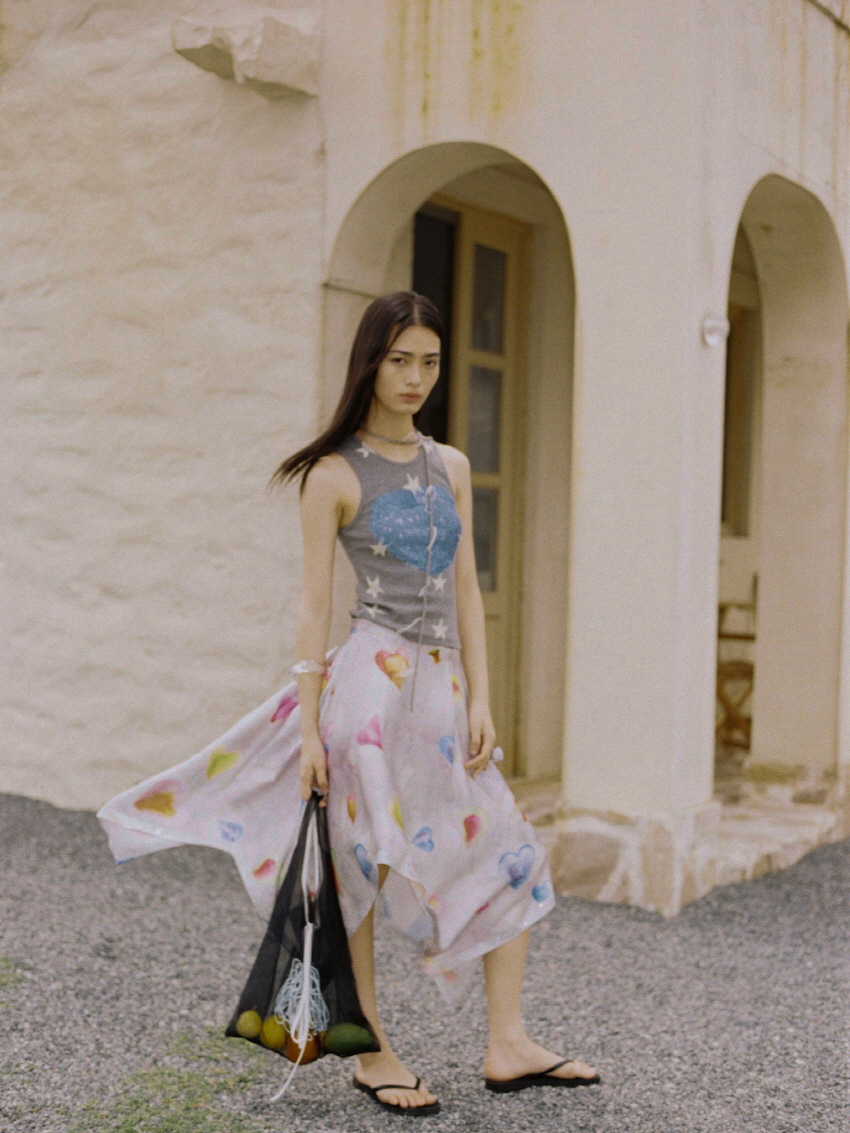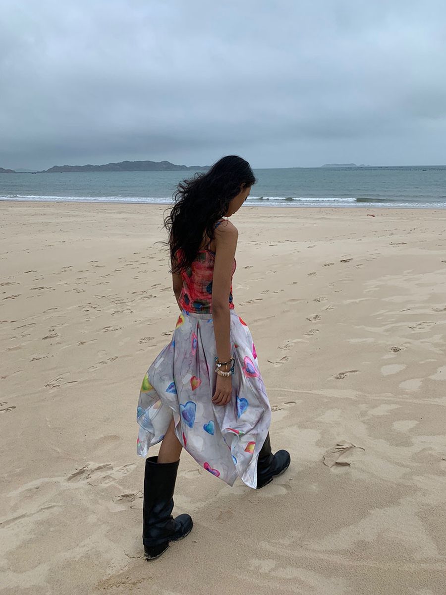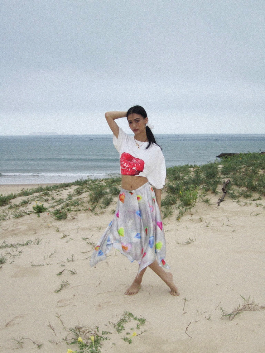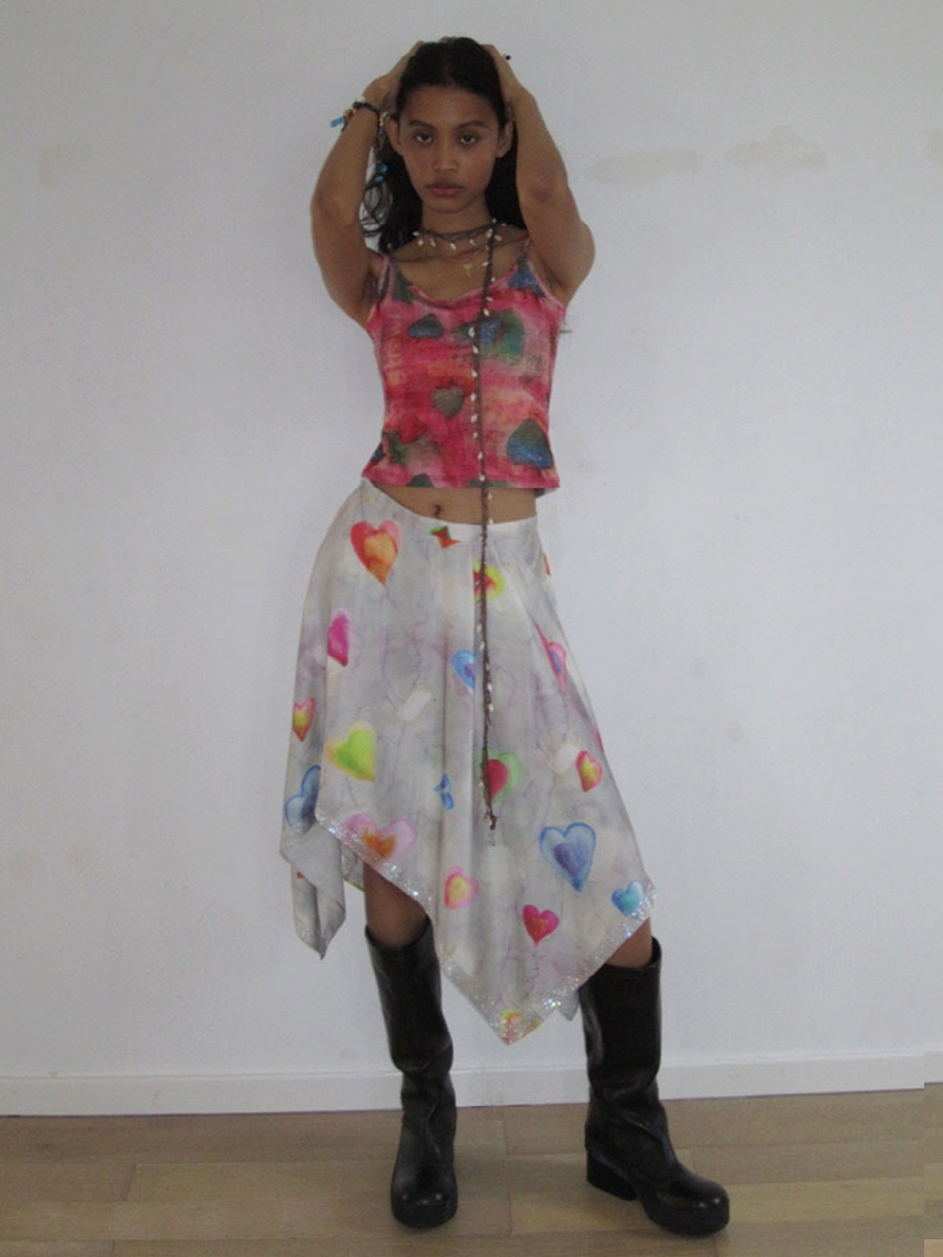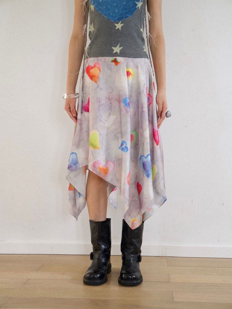 하트 디테일이 들어간 실크 드레이프 형태, 편안한 허리 밴드, 언밸런스한 웨이브 모양의 밑단이 어우려져 귀여우면서도 고급스러운 스커트입니다.