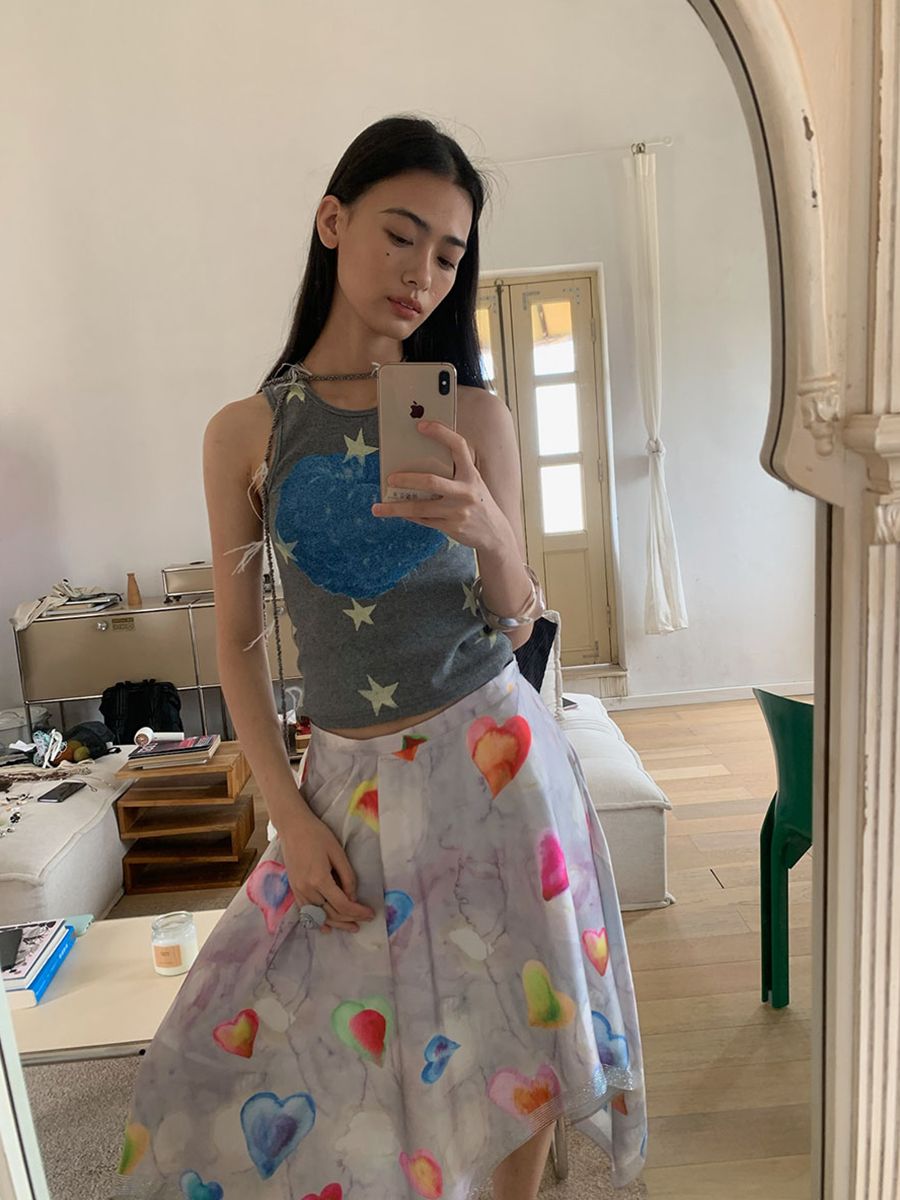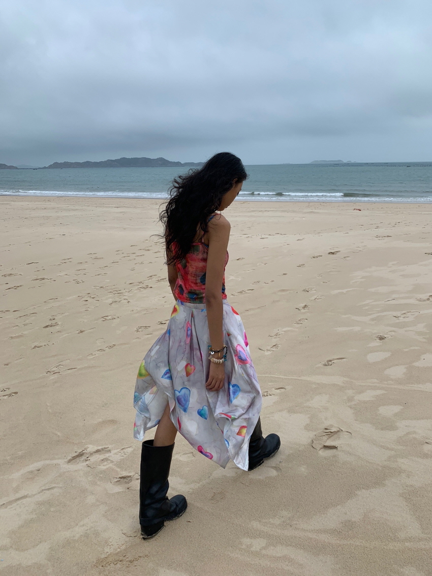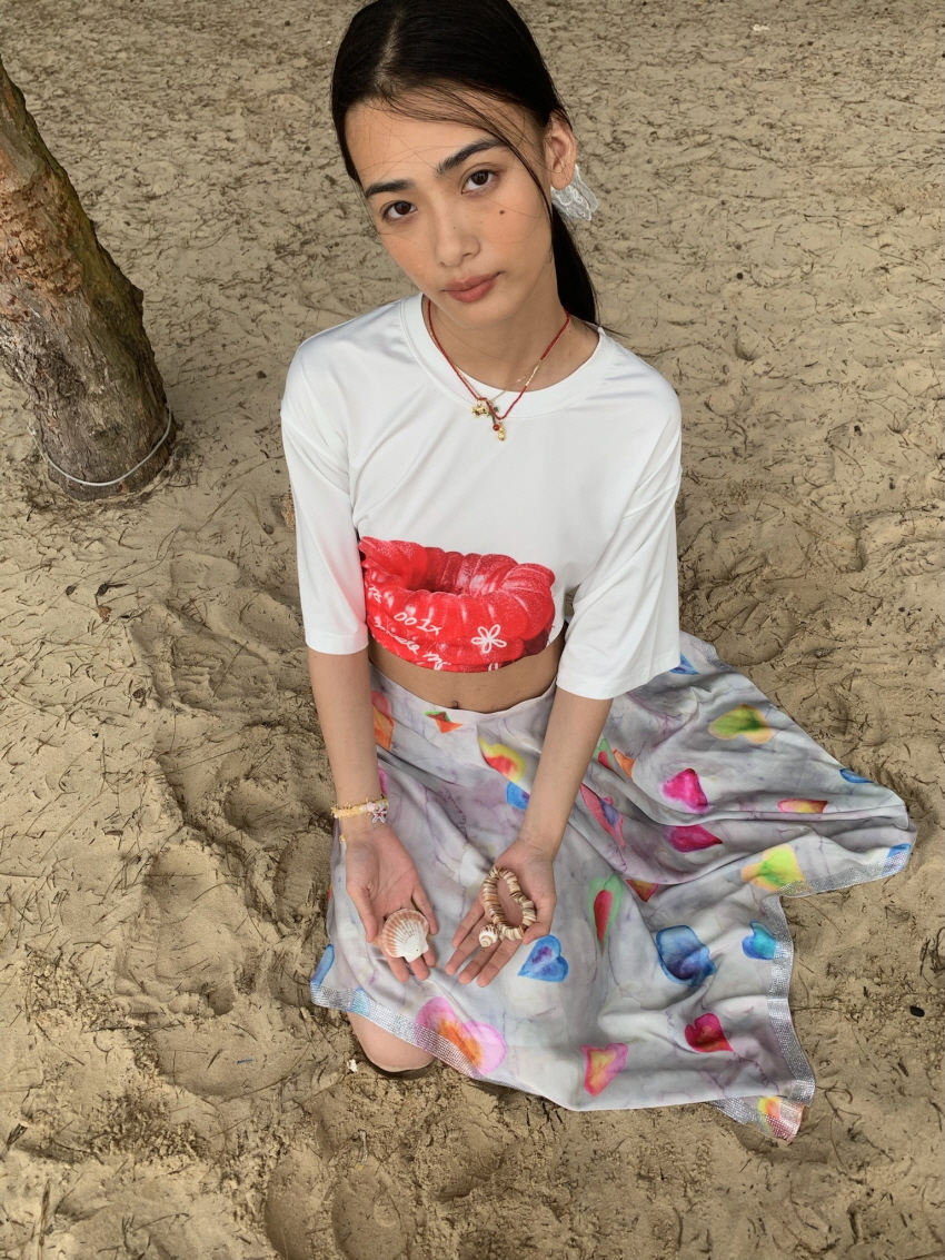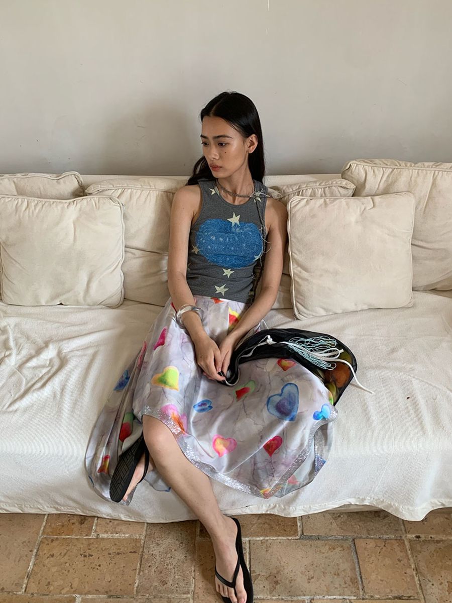 하트 디테일이 들어간 실크 드레이프 형태, 편안한 허리 밴드, 언밸런스한 웨이브 모양의 밑단이 어우려져 귀여우면서도 고급스러운 스커트입니다.