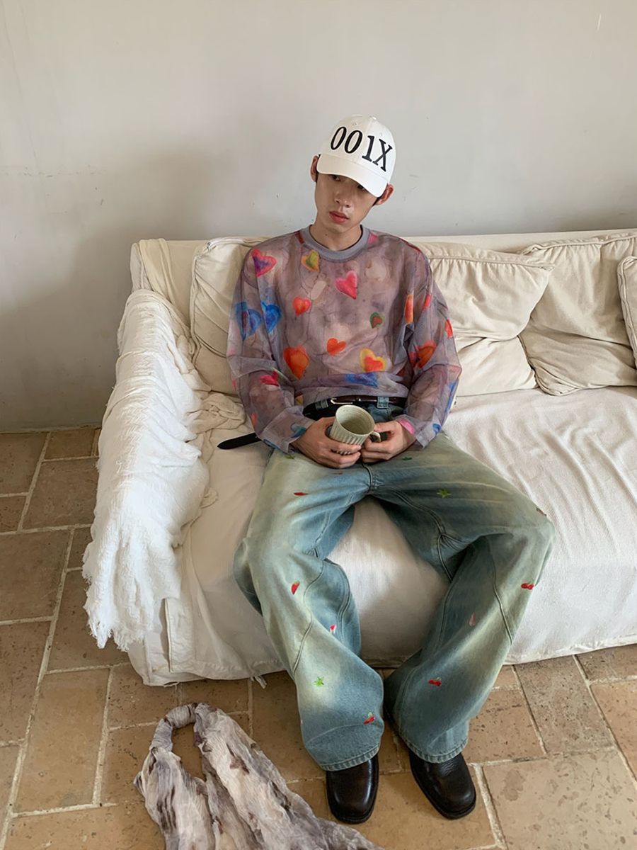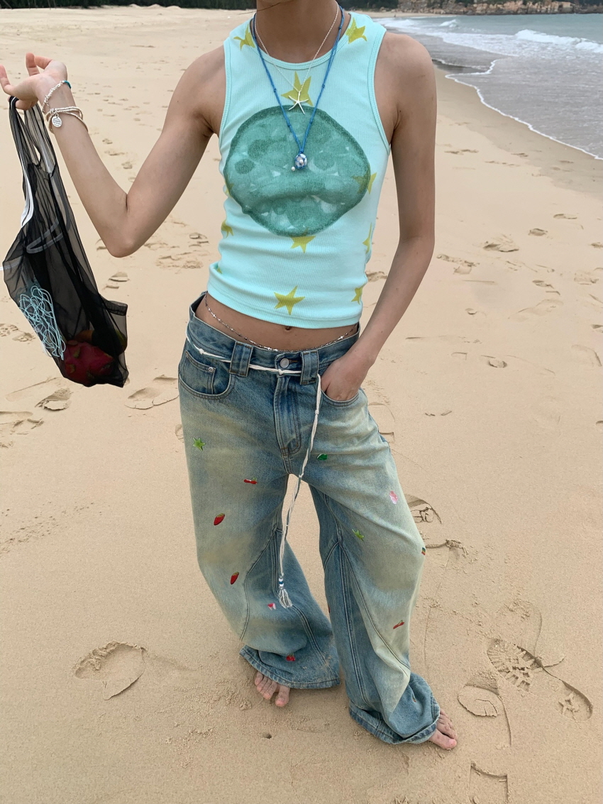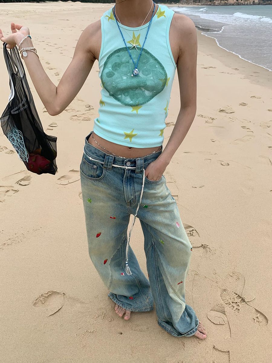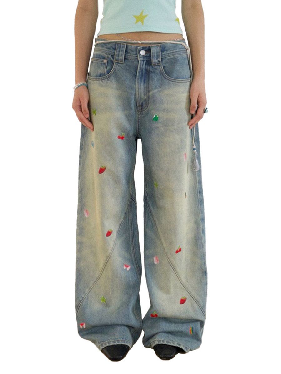 Fruit-Themed Printed Washed Jeans