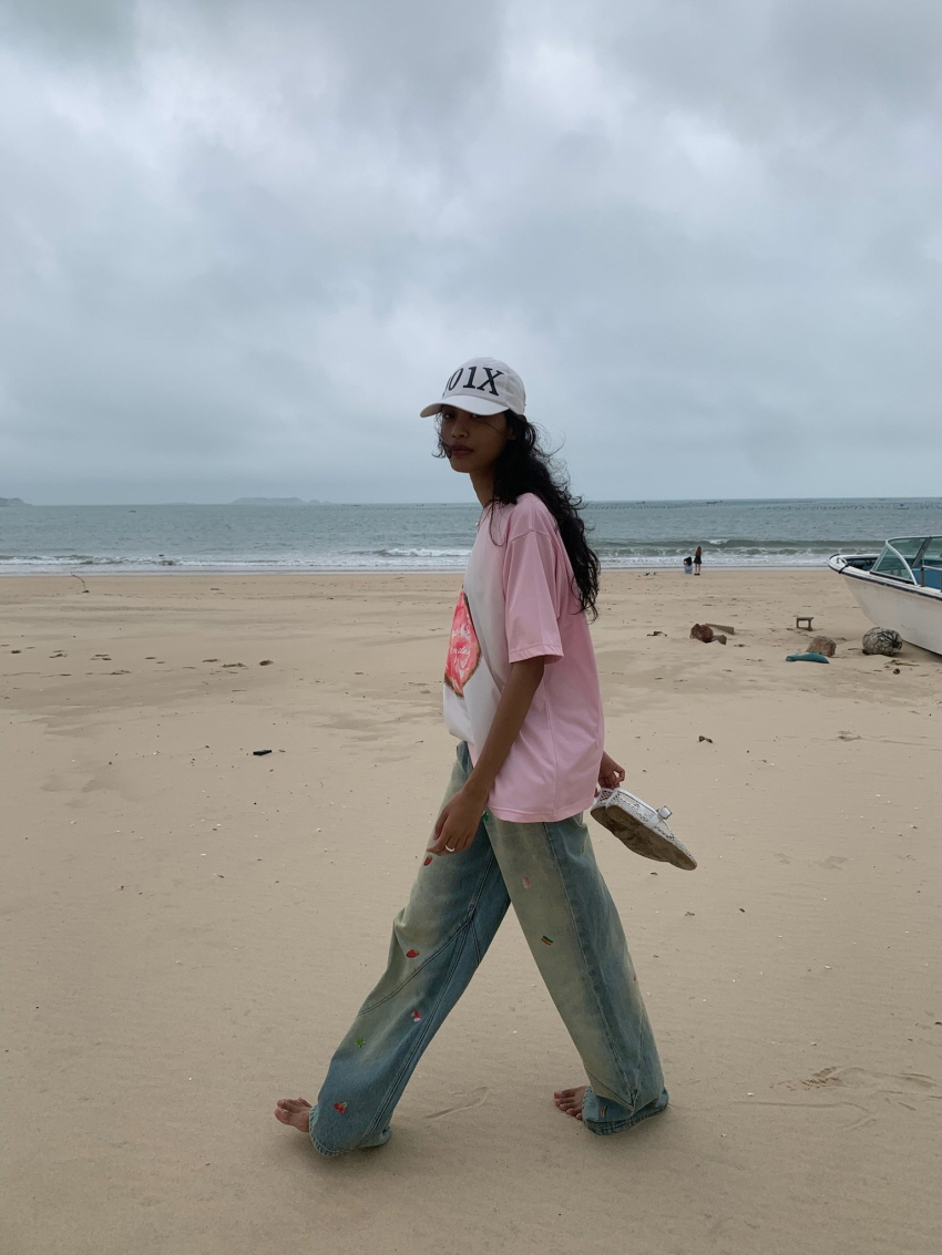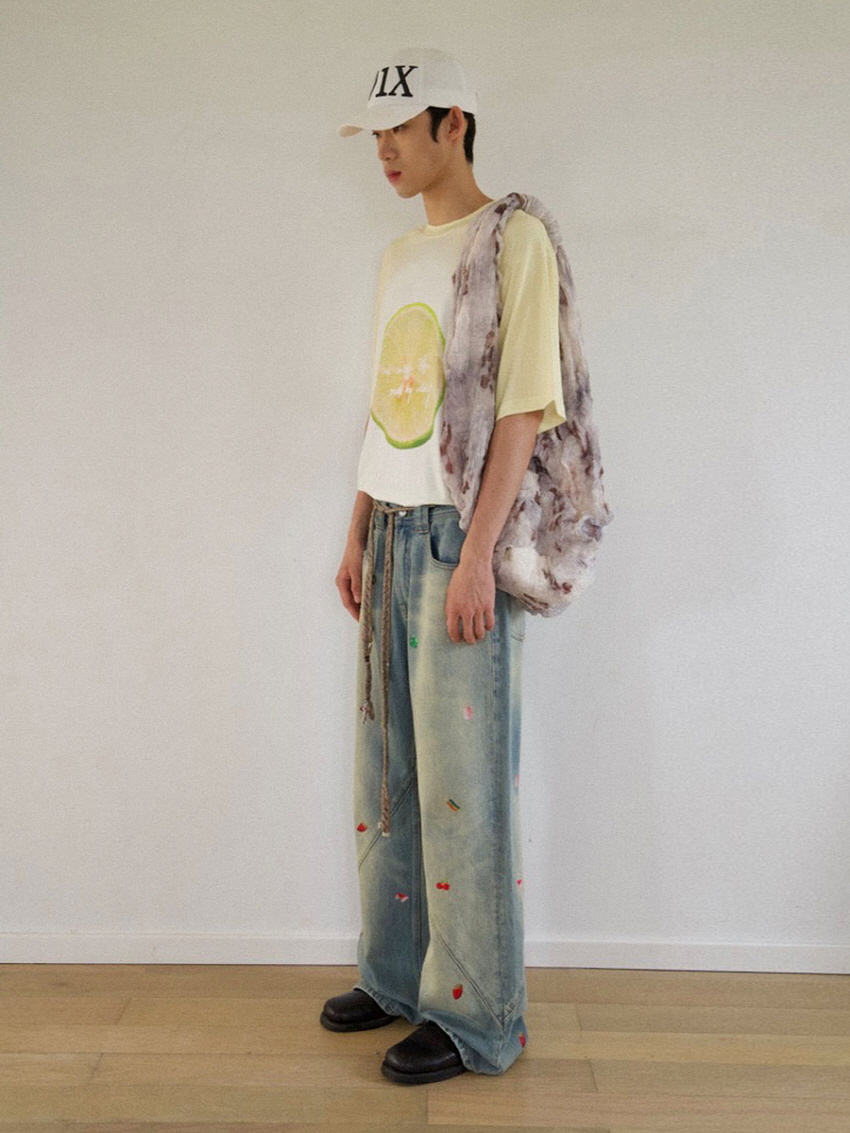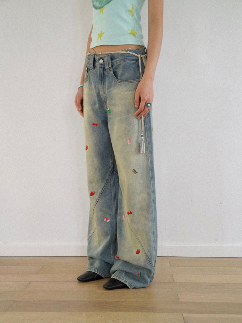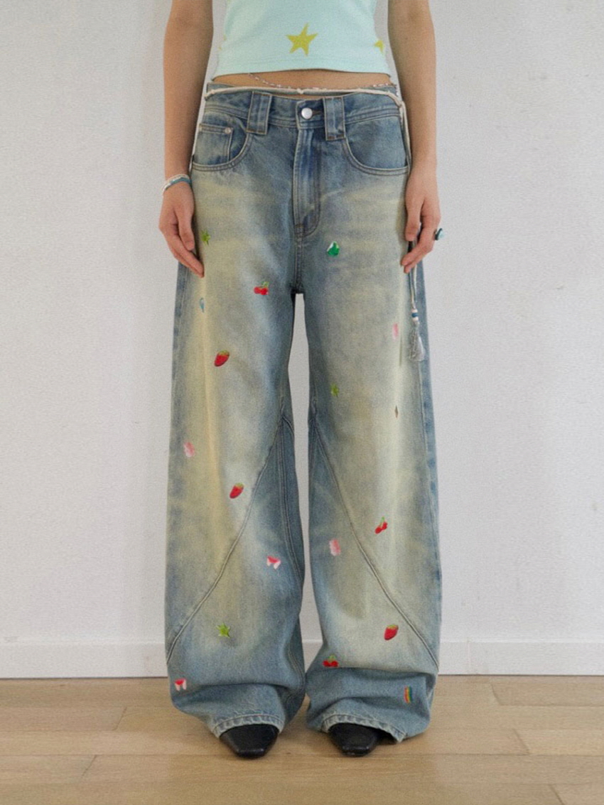 순면 데님 소재로 자연스러운 워싱과 사선주름으로 디테일을 주었으며 귀여운 과일 포인트가 더해진 일자 핏의 루즈한 데님 팬츠 입니다.