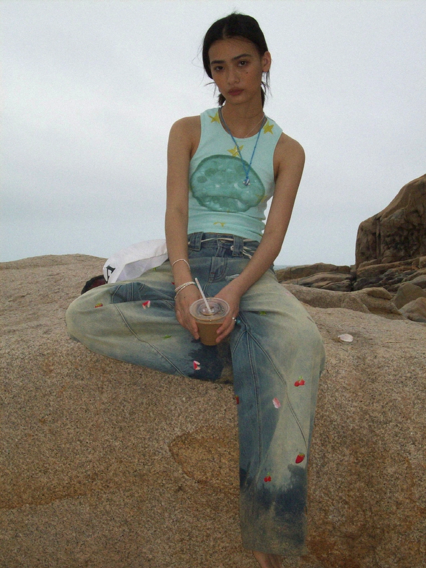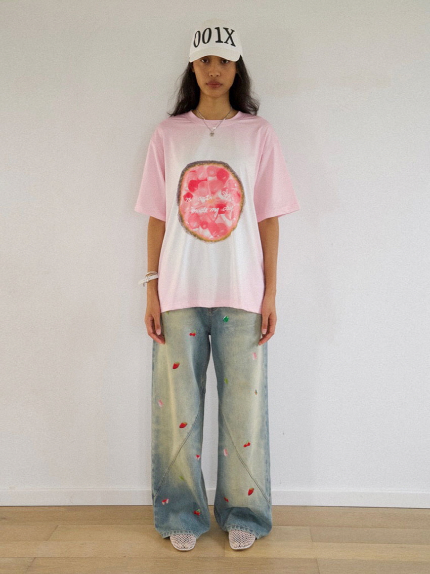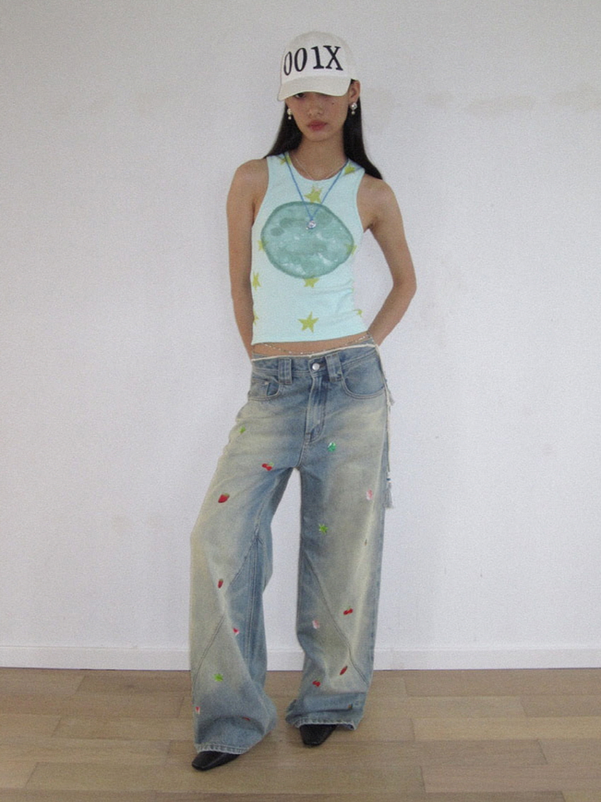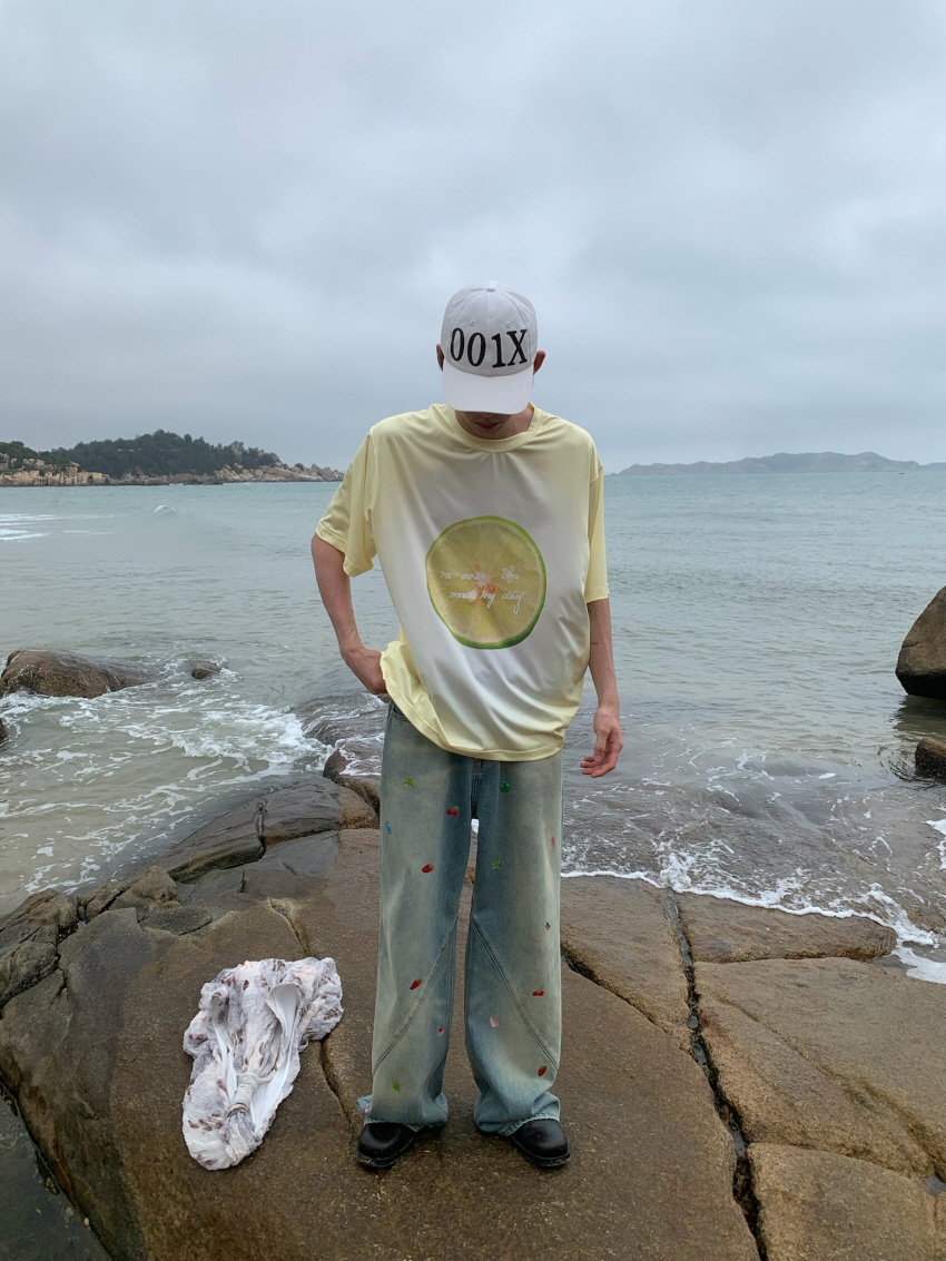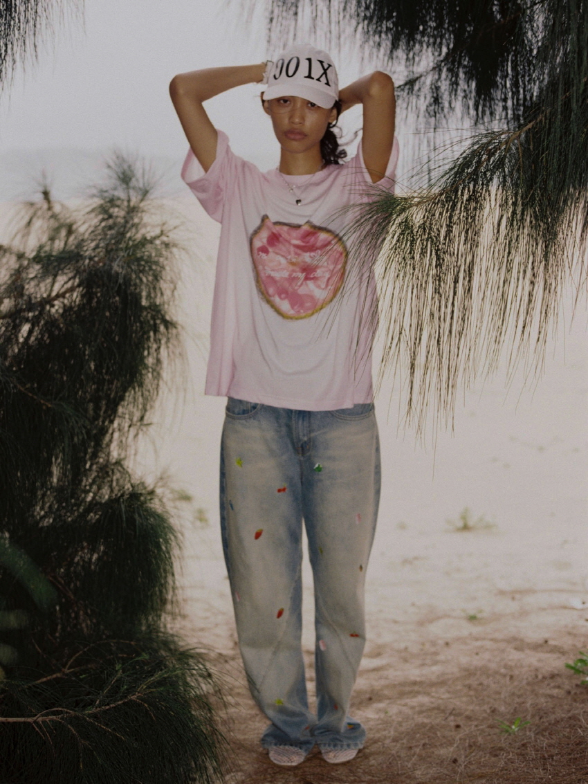 순면 데님 소재로 자연스러운 워싱과 사선주름으로 디테일을 주었으며 귀여운 과일 포인트가 더해진 일자 핏의 루즈한 데님 팬츠 입니다.