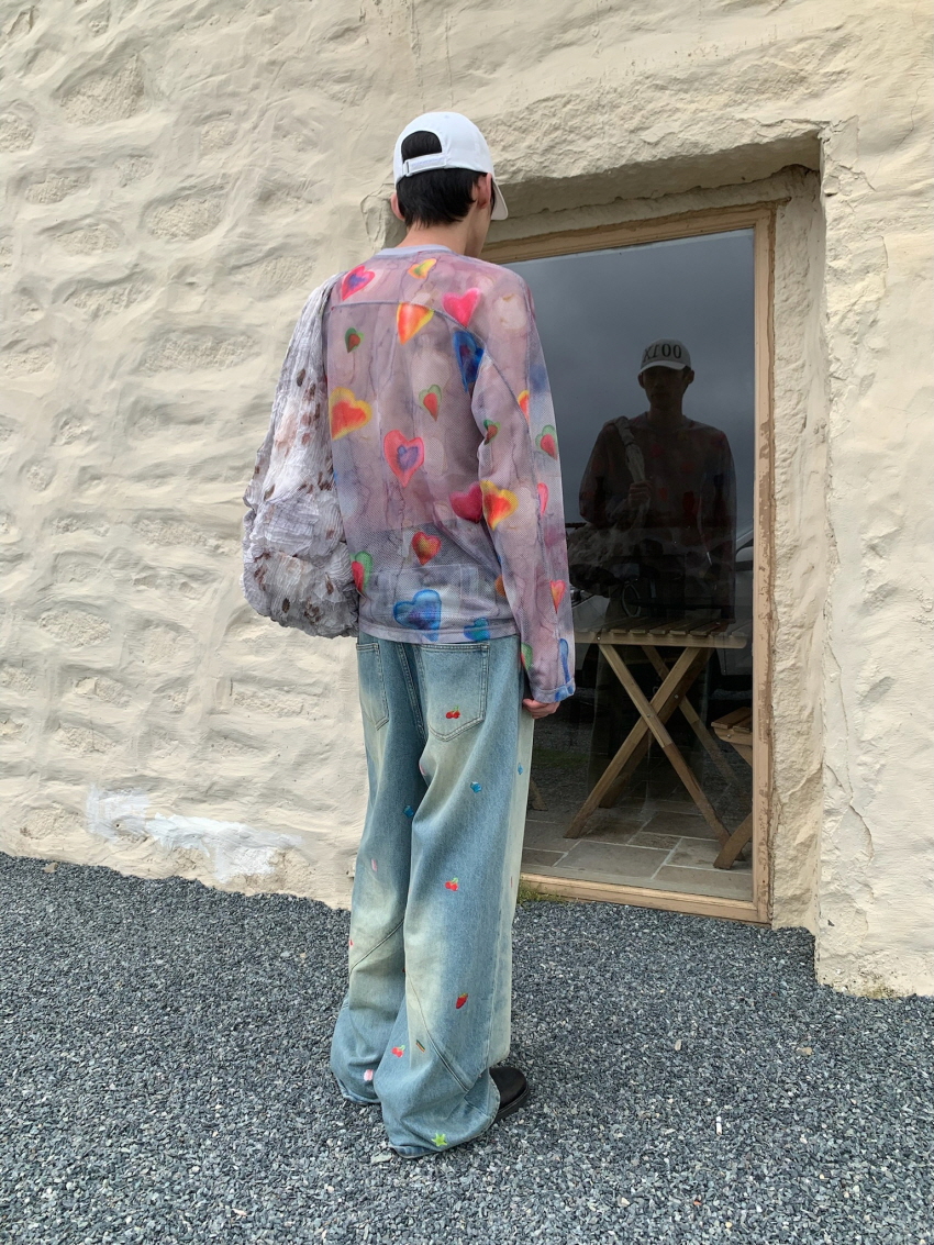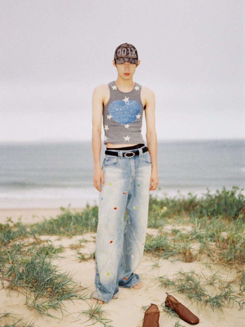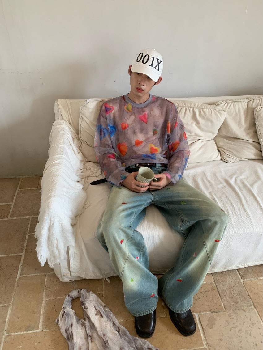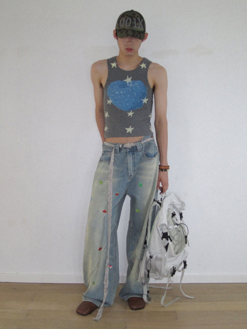 순면 데님 소재로 자연스러운 워싱과 사선주름으로 디테일을 주었으며 귀여운 과일 포인트가 더해진 일자 핏의 루즈한 데님 팬츠 입니다.
