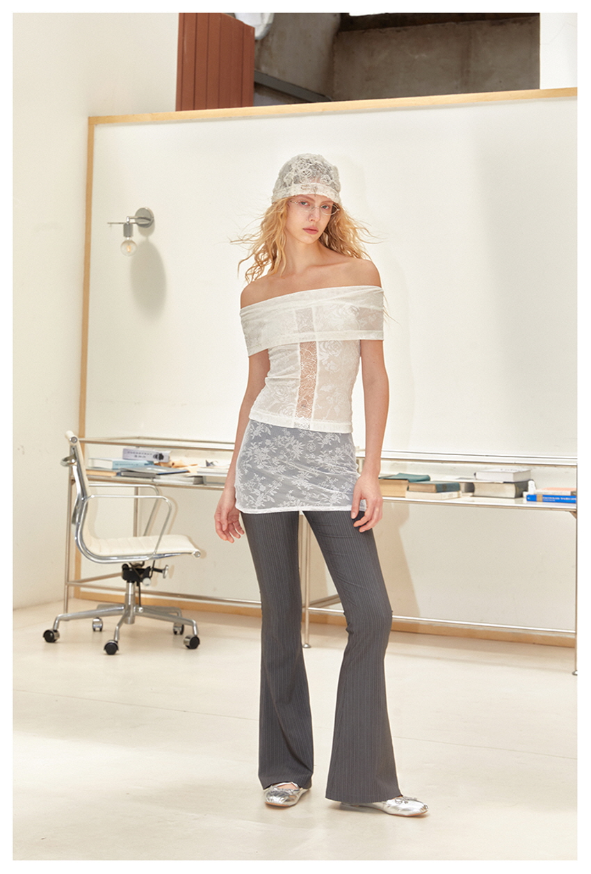플라워 프린트가 들어가 있는 시스루 오프숄더 탑입니다.