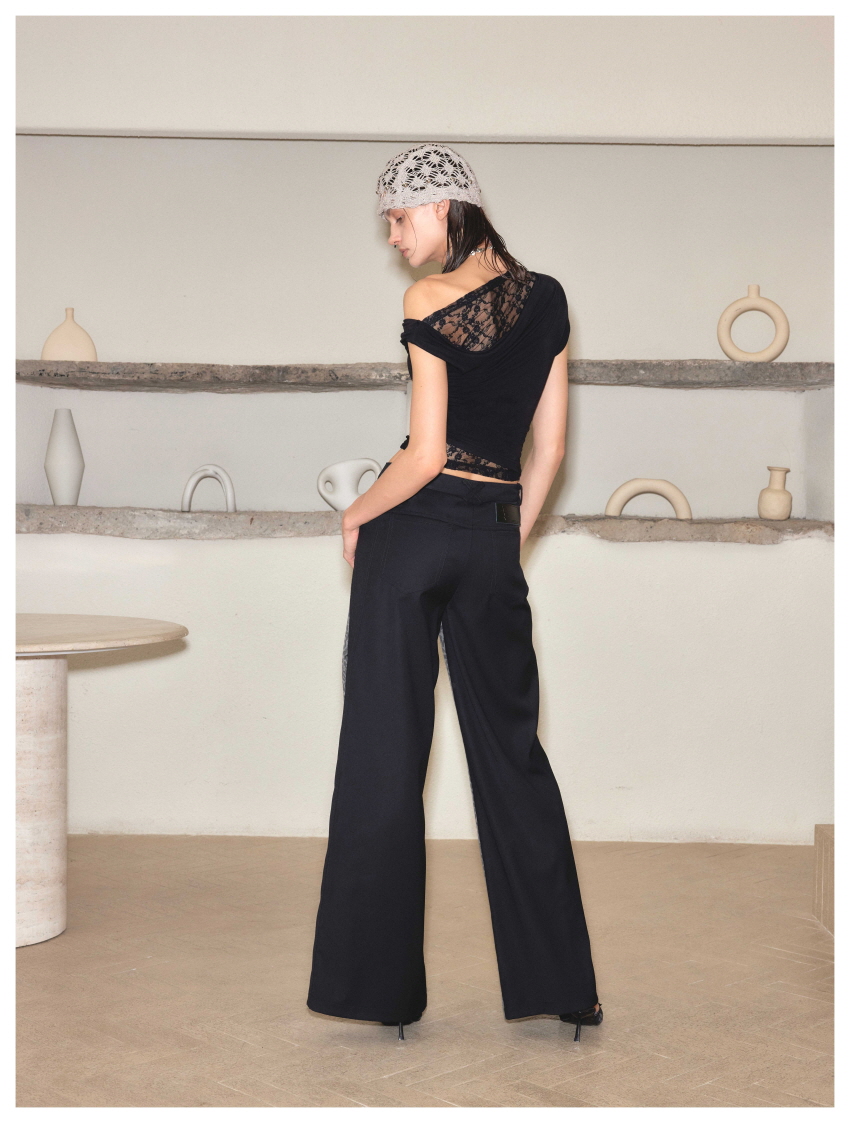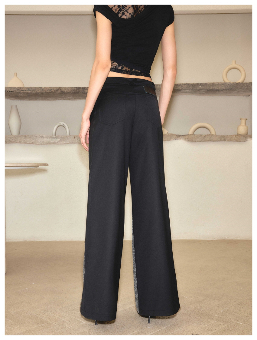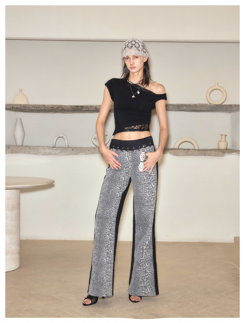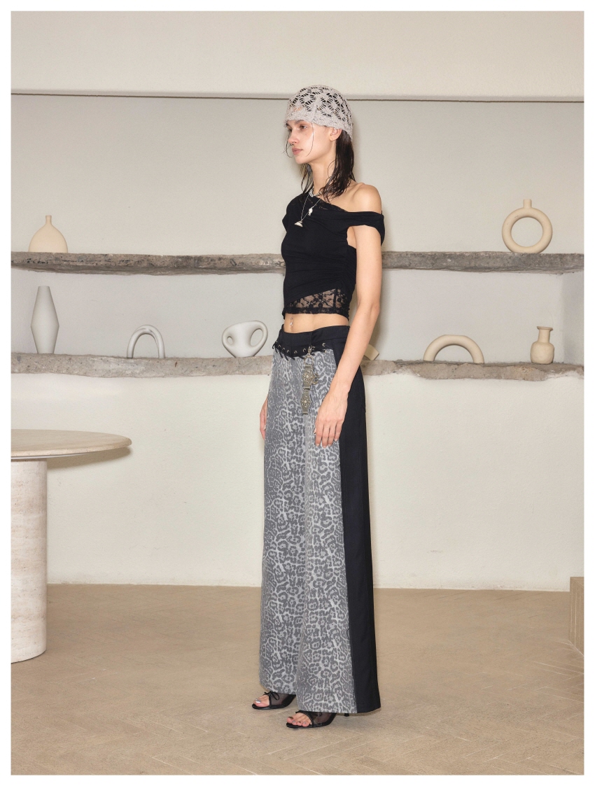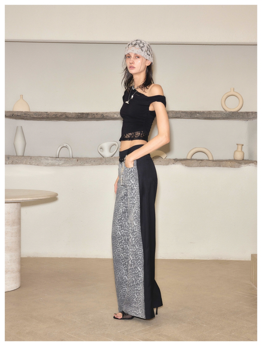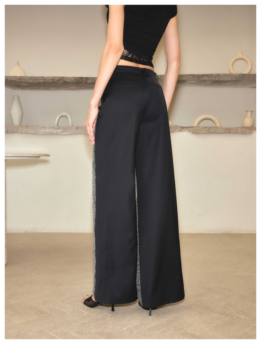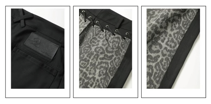 스트레이트핏이며 레오파드와 검정데님의 양면 배색으로 반전 포인트를 주었습니다.