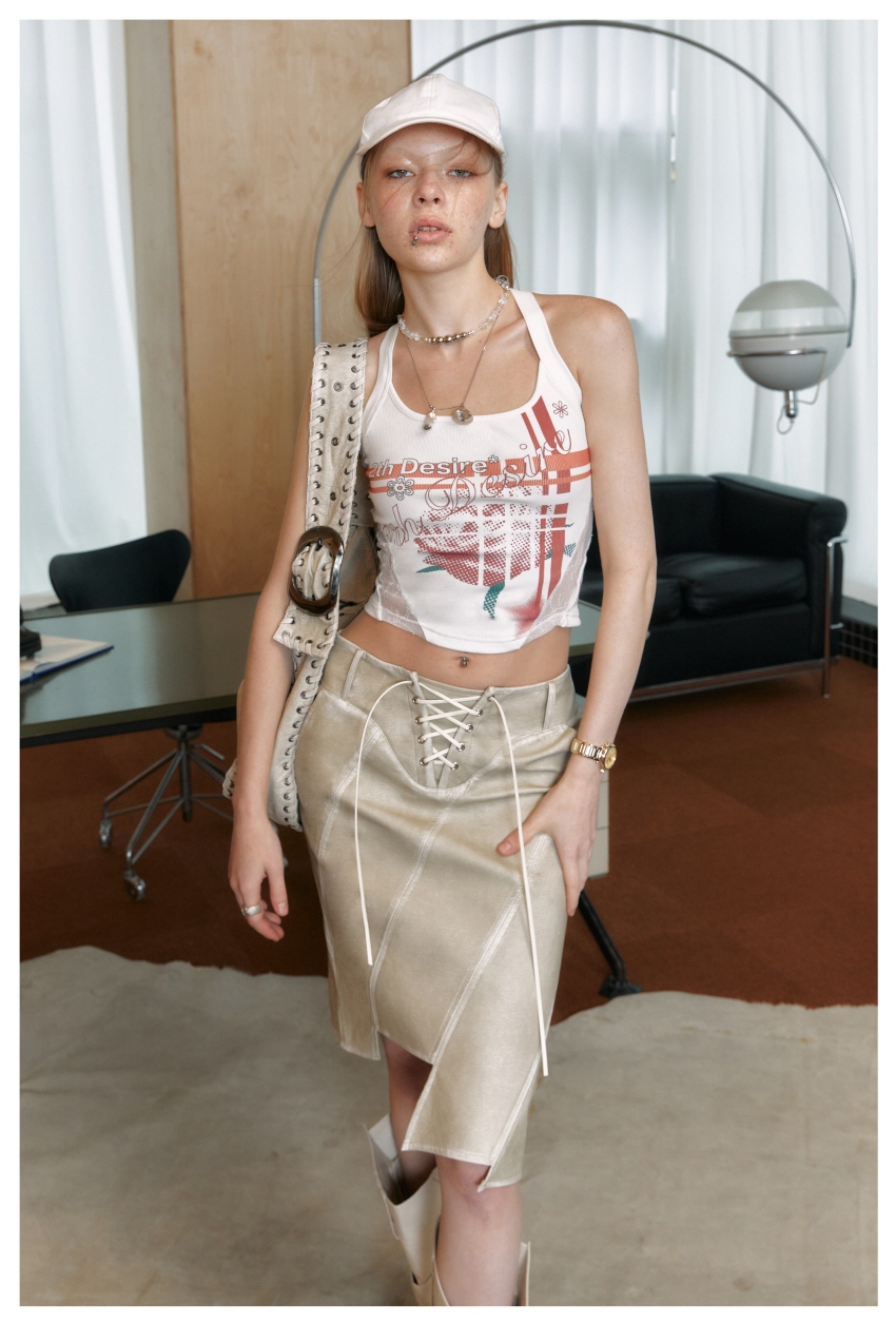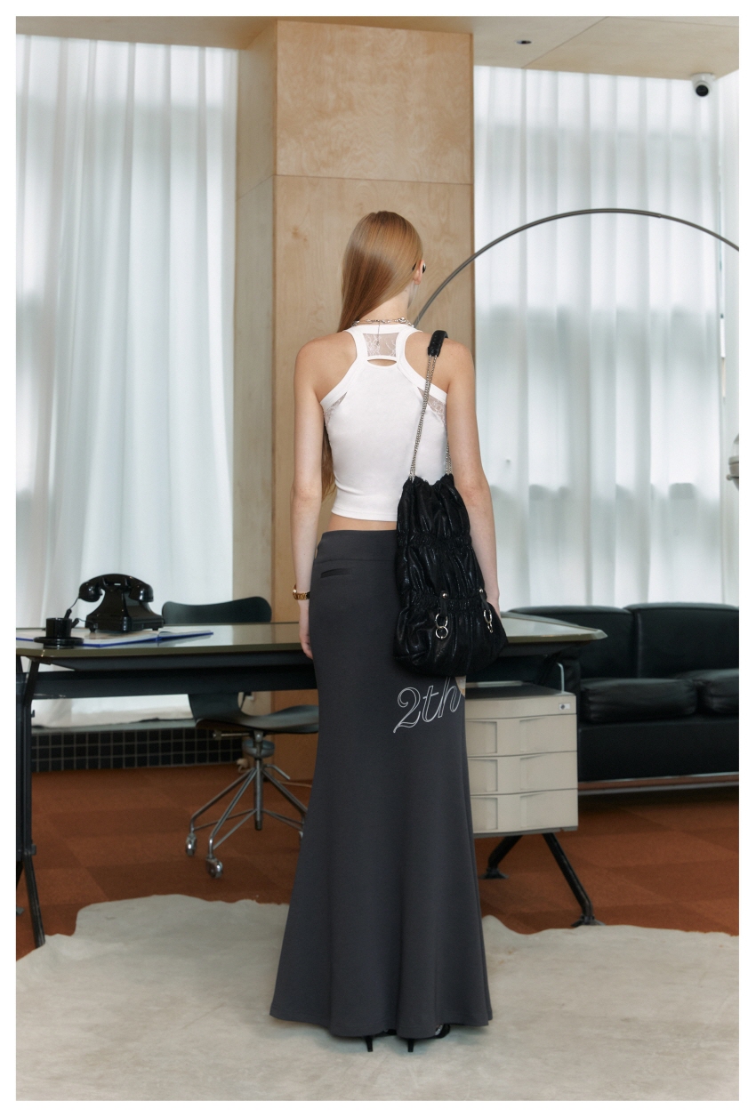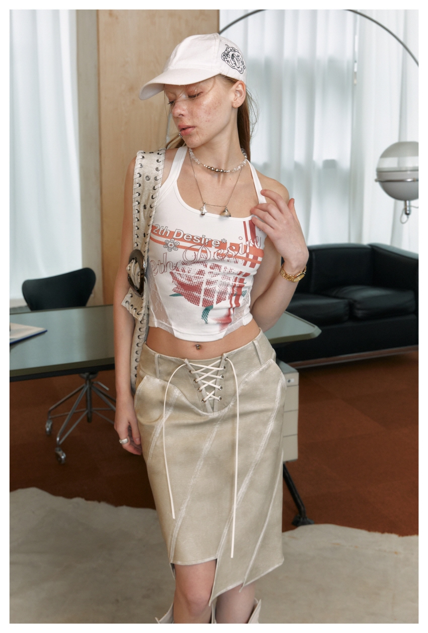 허리 옆면에 레이스 망사가 포인트인 레이싱 슬리브리스 탑입니다.