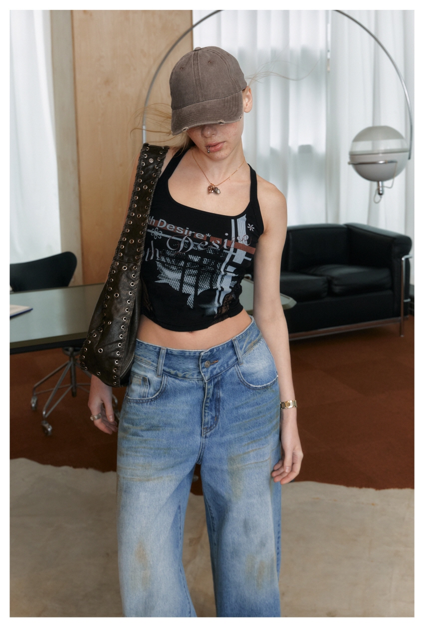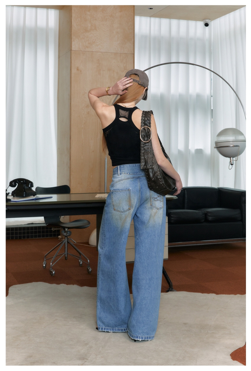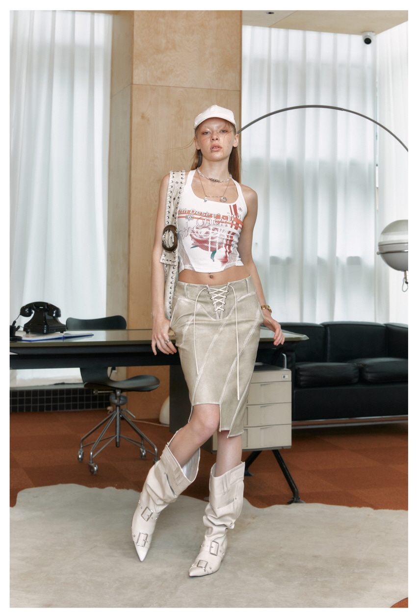 허리 옆면에 레이스 망사가 포인트인 레이싱 슬리브리스 탑입니다.
