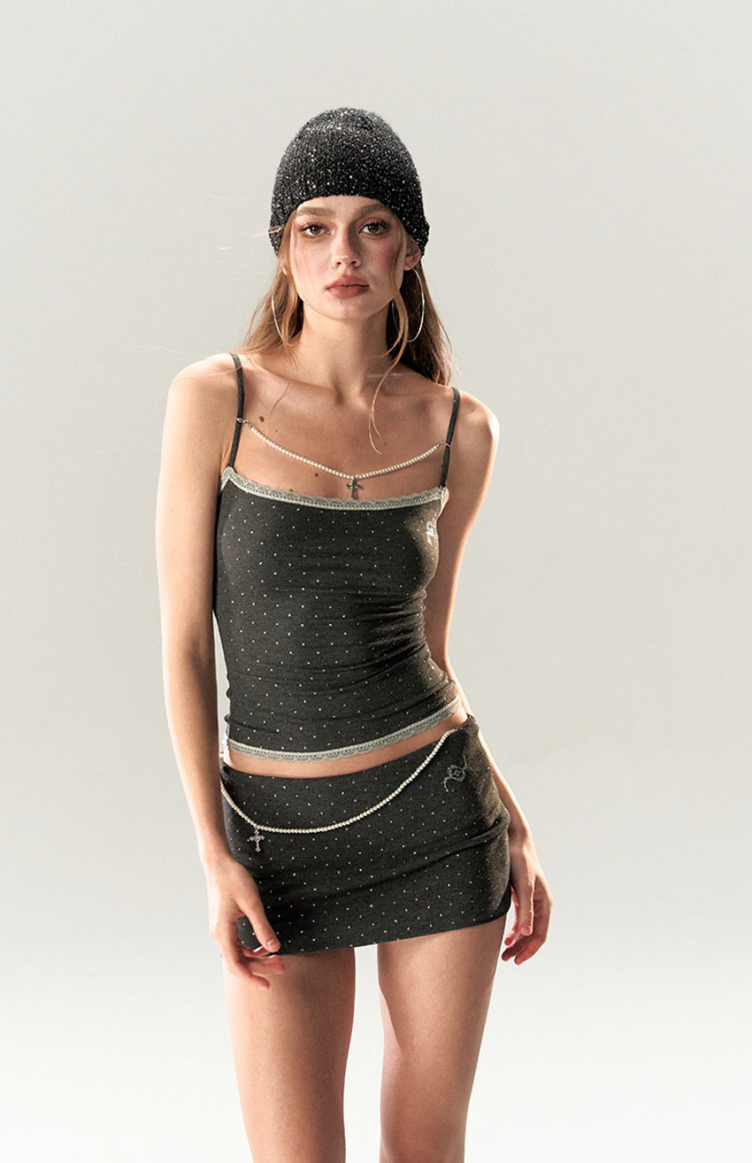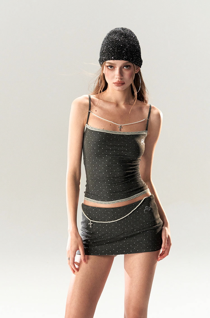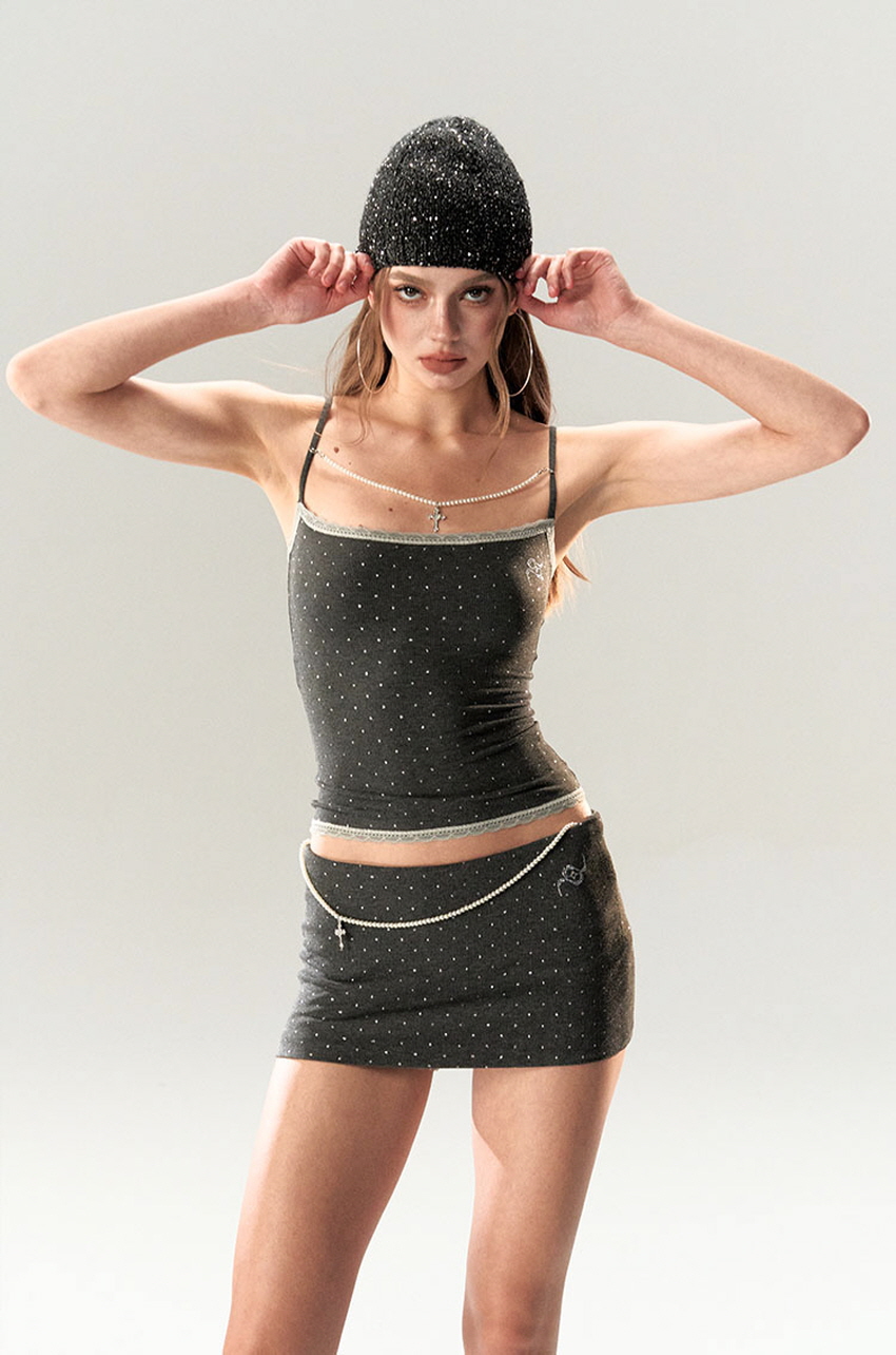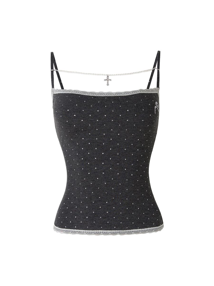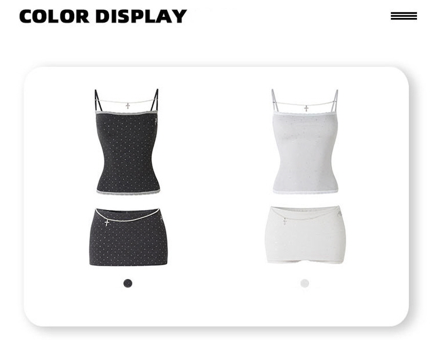 다이아몬드 도트 무늬 디테일에 미니레이스가 가미된 슬리브리스 셋트입니다.