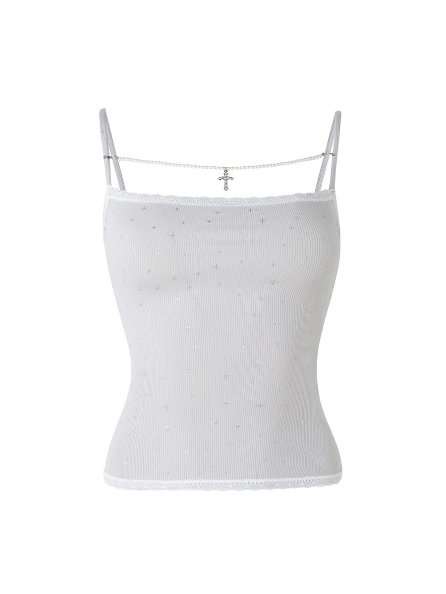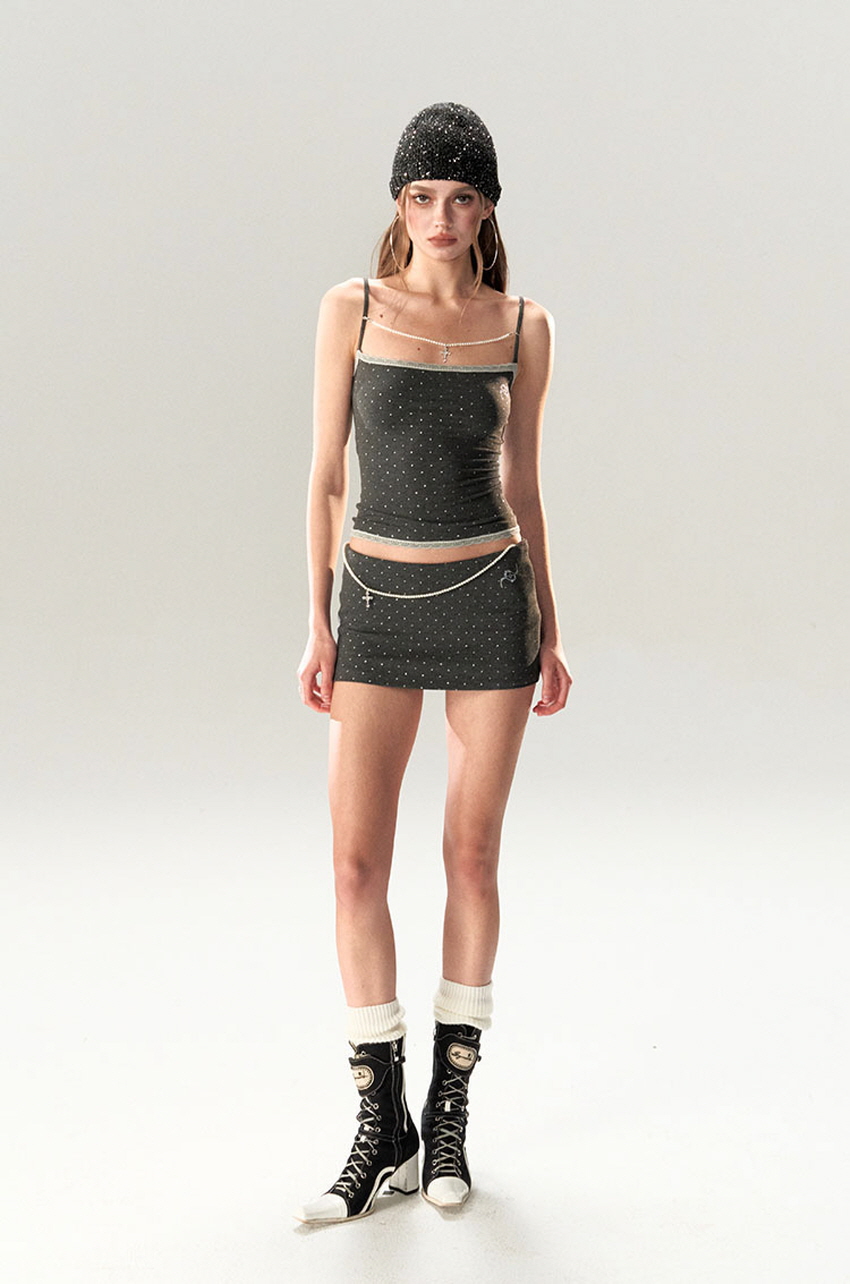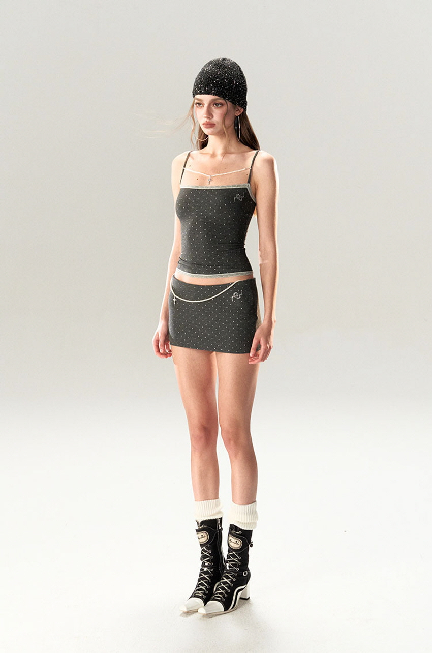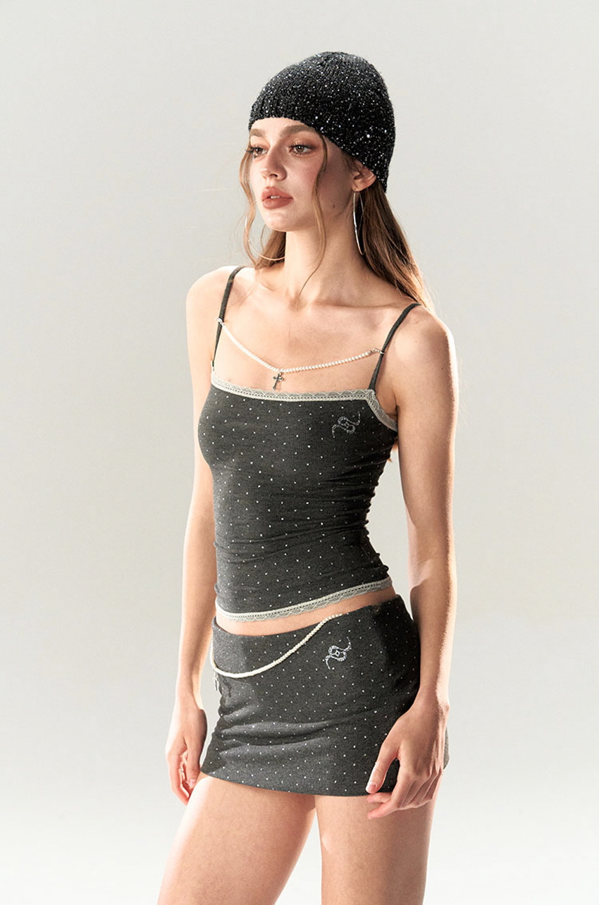 다이아몬드 도트 무늬 디테일에 미니레이스가 가미된 슬리브리스 셋트입니다.