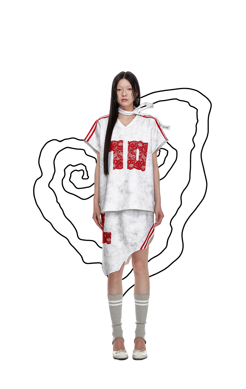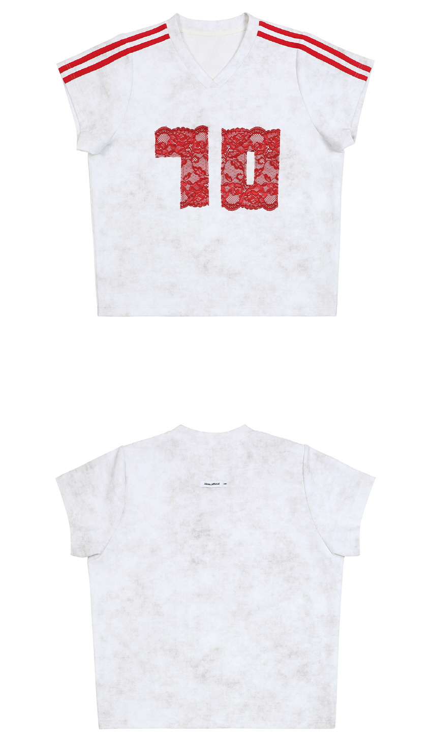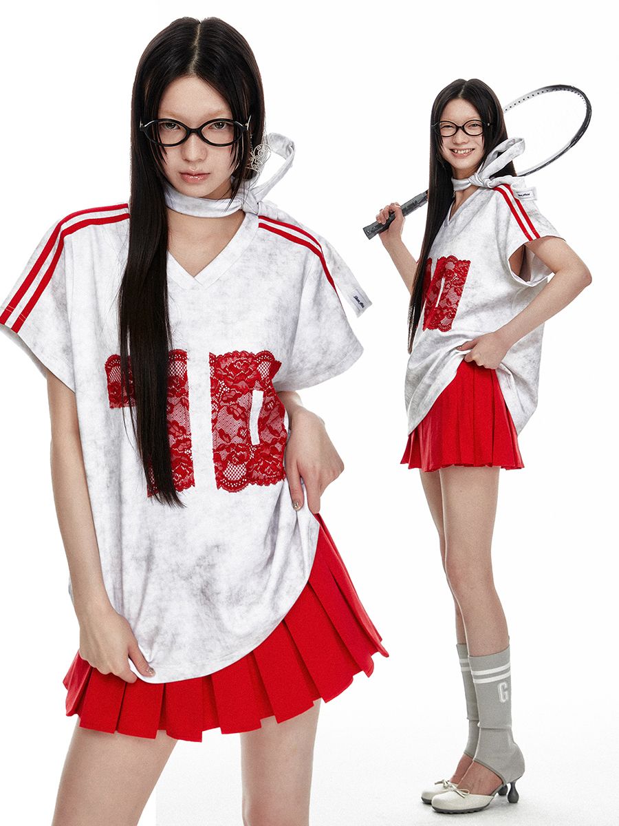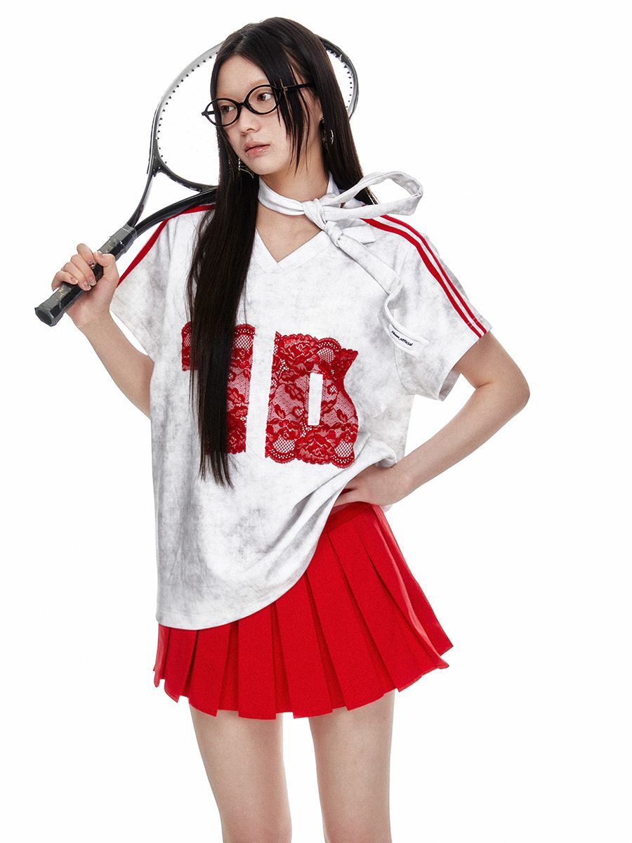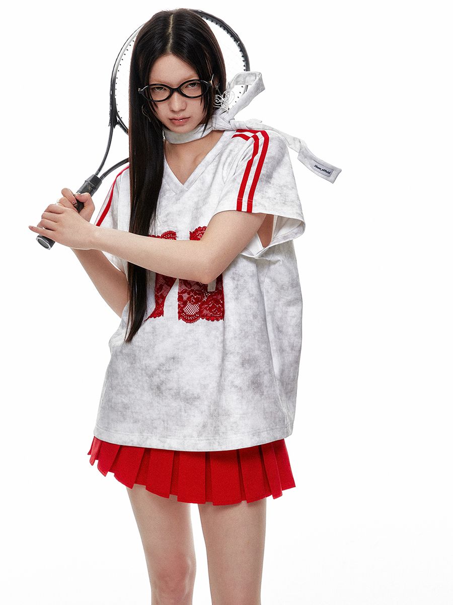 레트로풍의 캐주얼한 루즈핏의 브이넥 레이스 티셔츠 입니다.