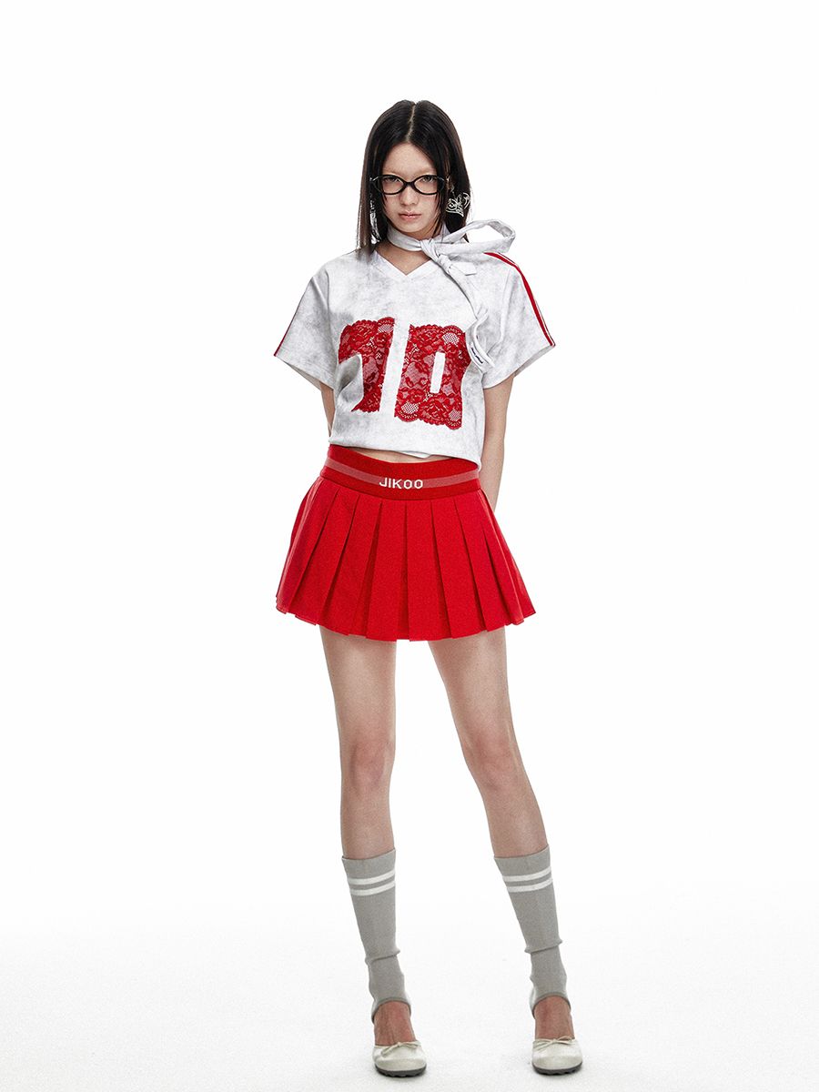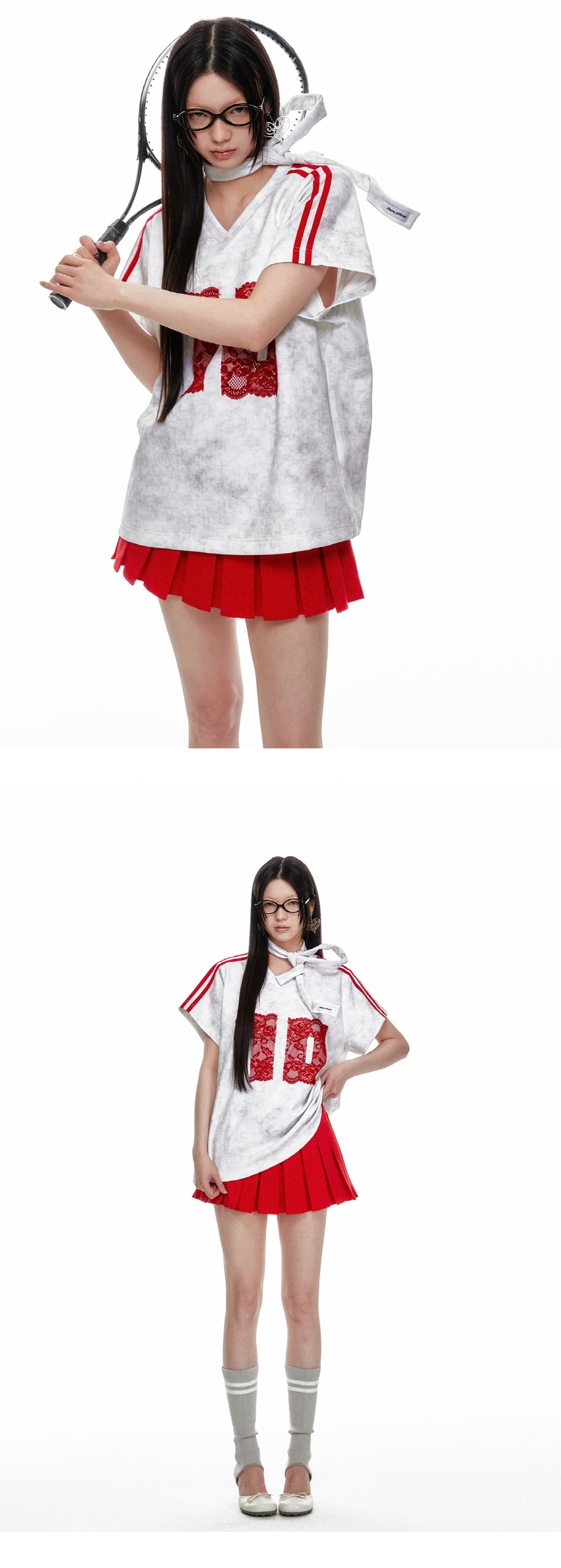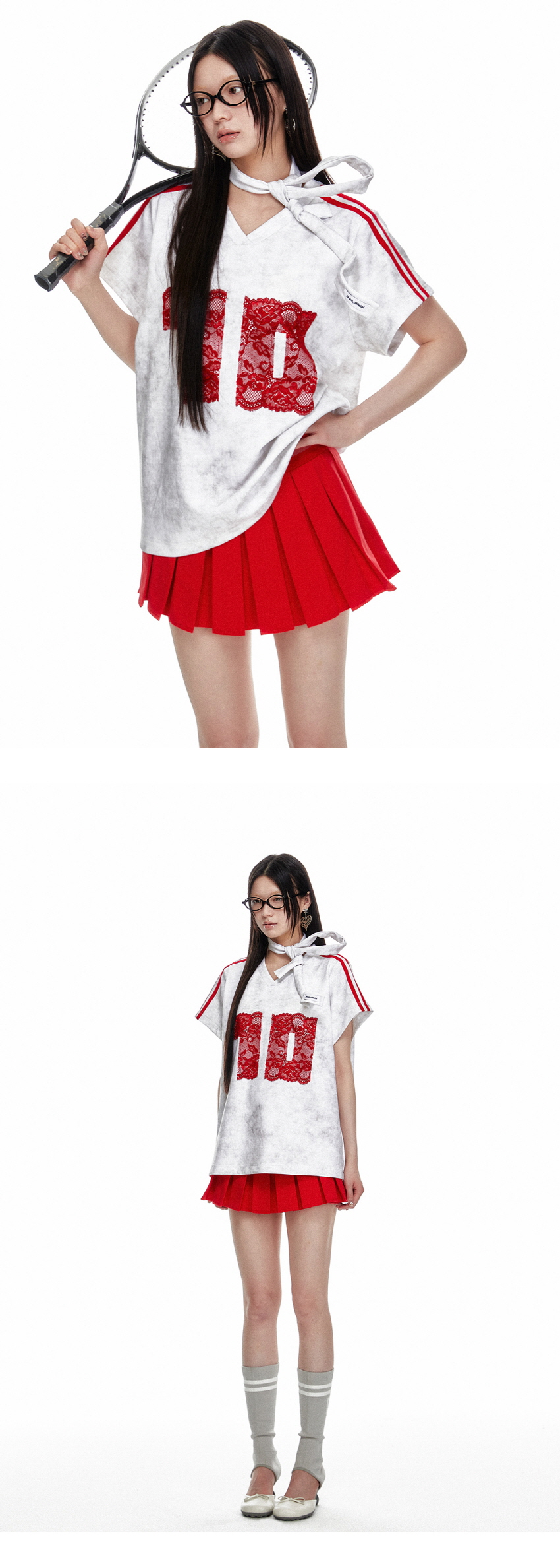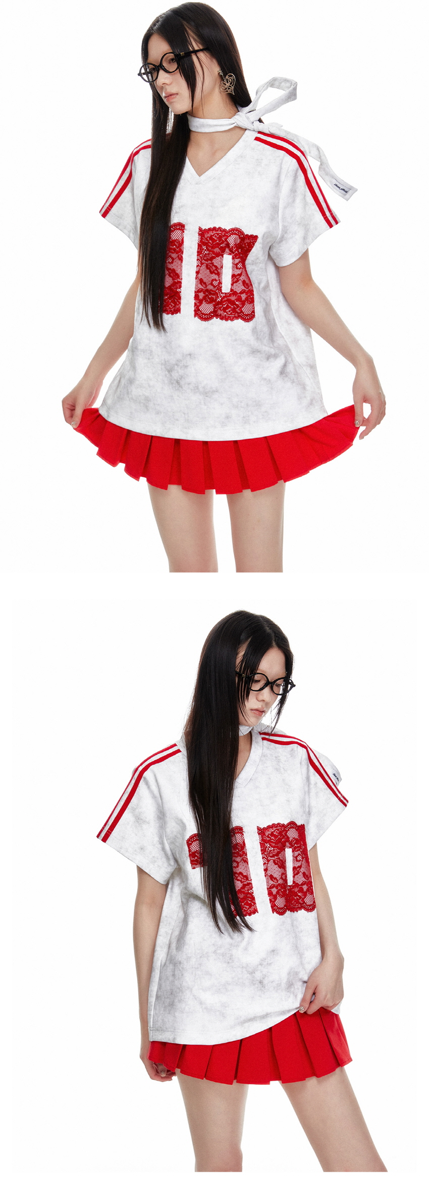 레트로풍의 캐주얼한 루즈핏의 브이넥 레이스 티셔츠 입니다.