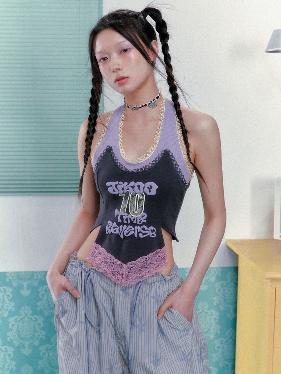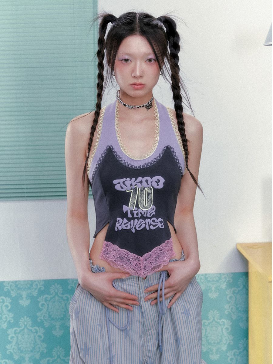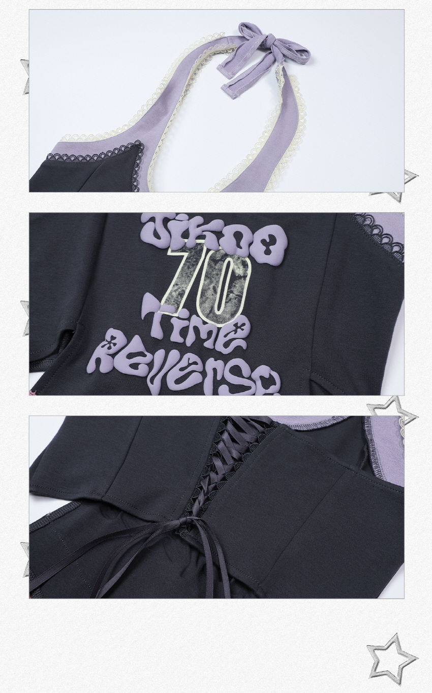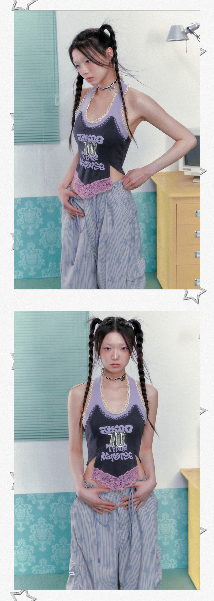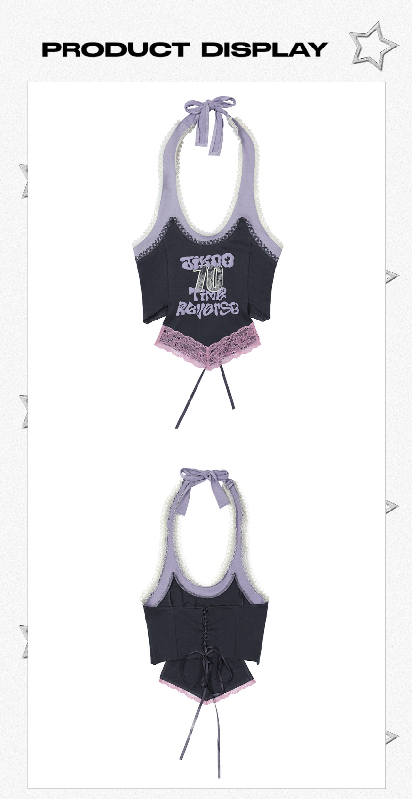옆라인 절개선과 레이스, 허리부분 스트랩을 포인트로 준 홀터넥 탑입니다.