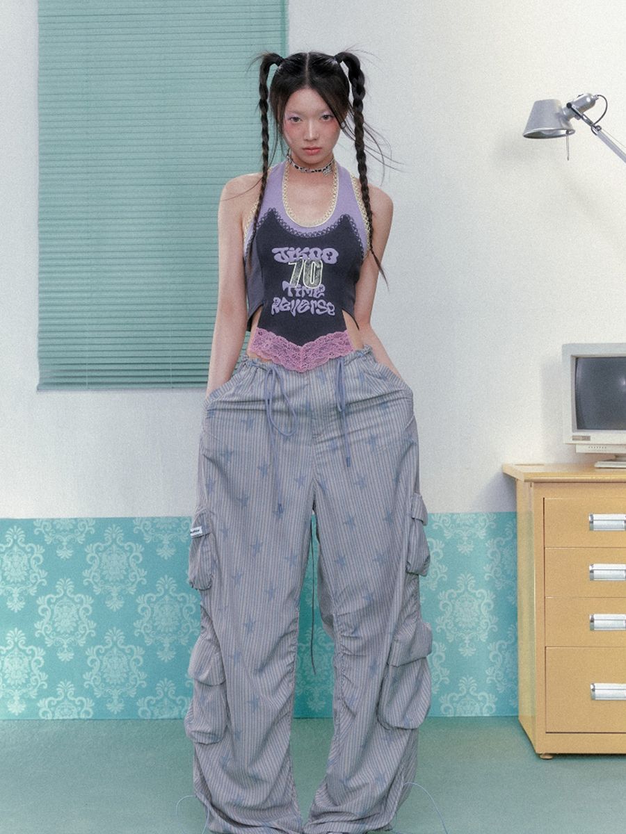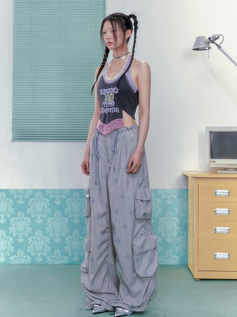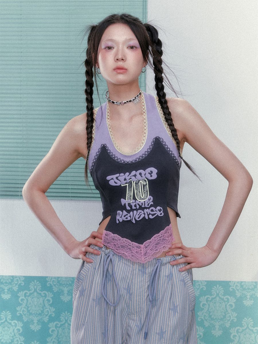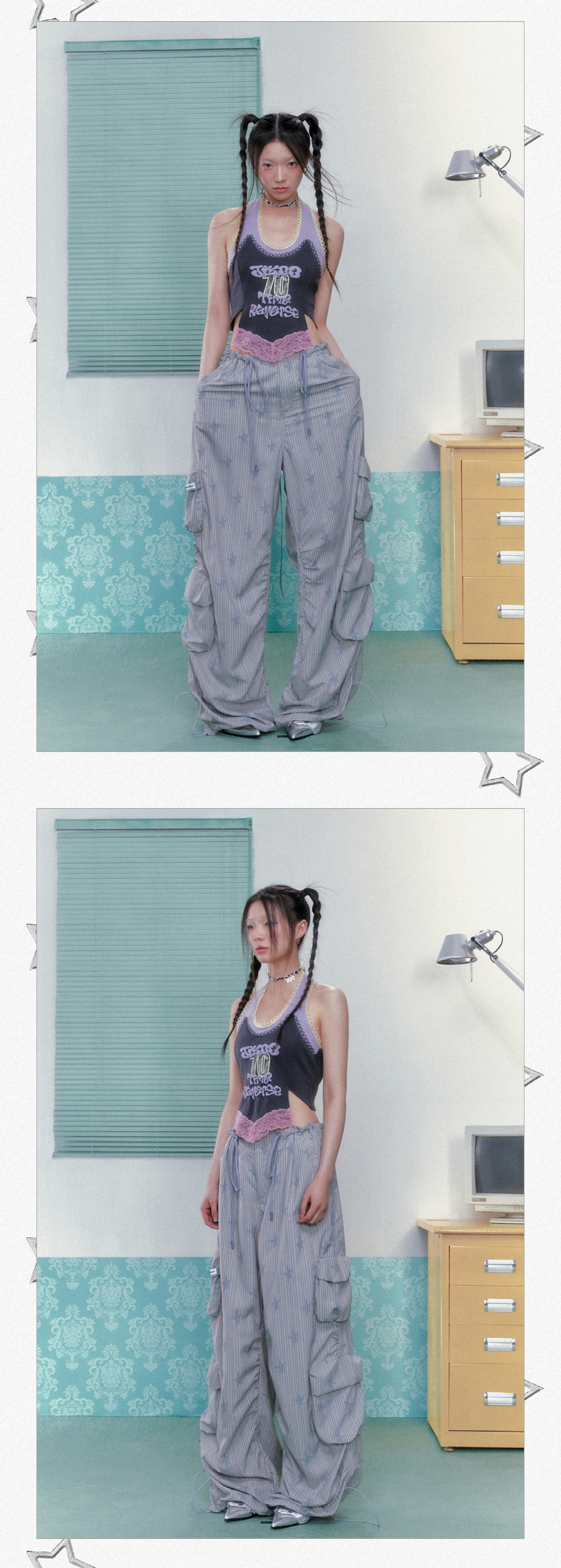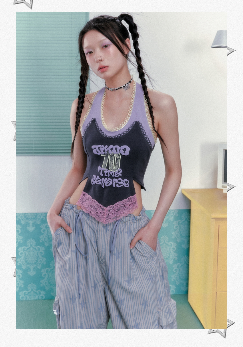 옆라인 절개선과 레이스, 허리부분 스트랩을 포인트로 준 홀터넥 탑입니다.
