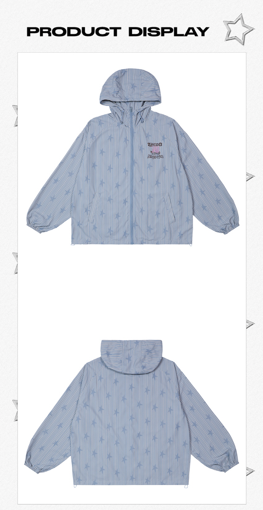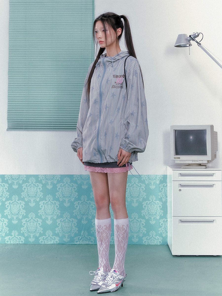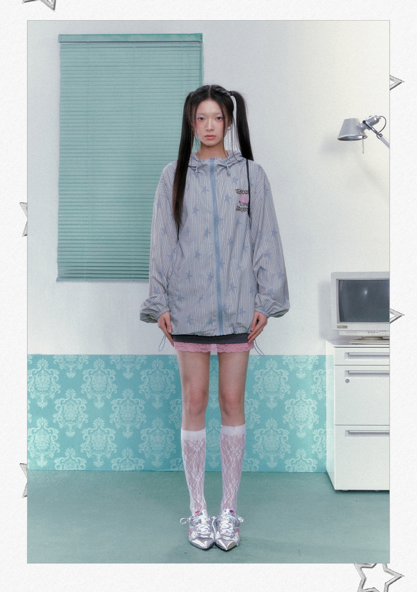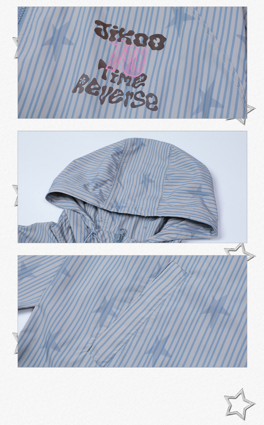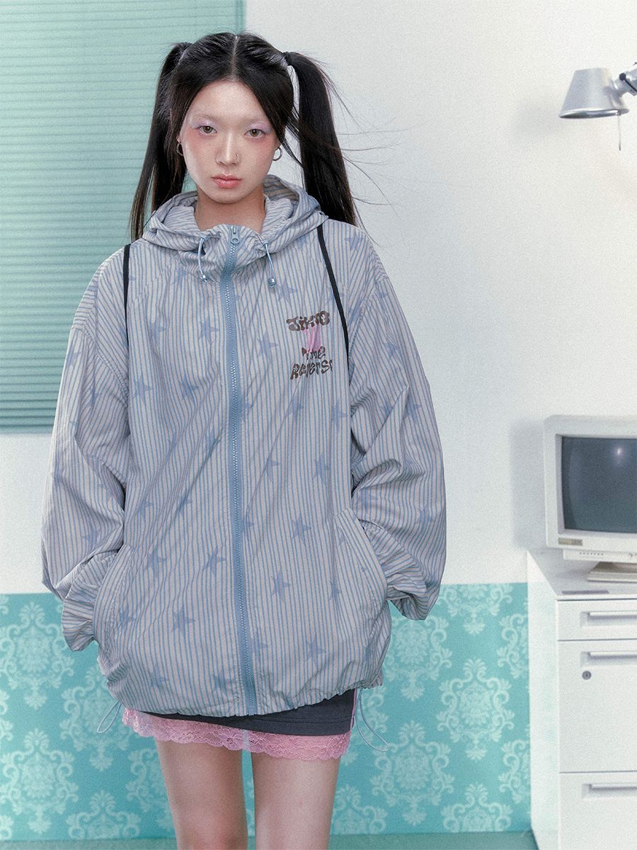 별 프린팅과 스트라이프로 포인트로 제작된 귀여운 윈드브레이커 후드 자켓입니다.