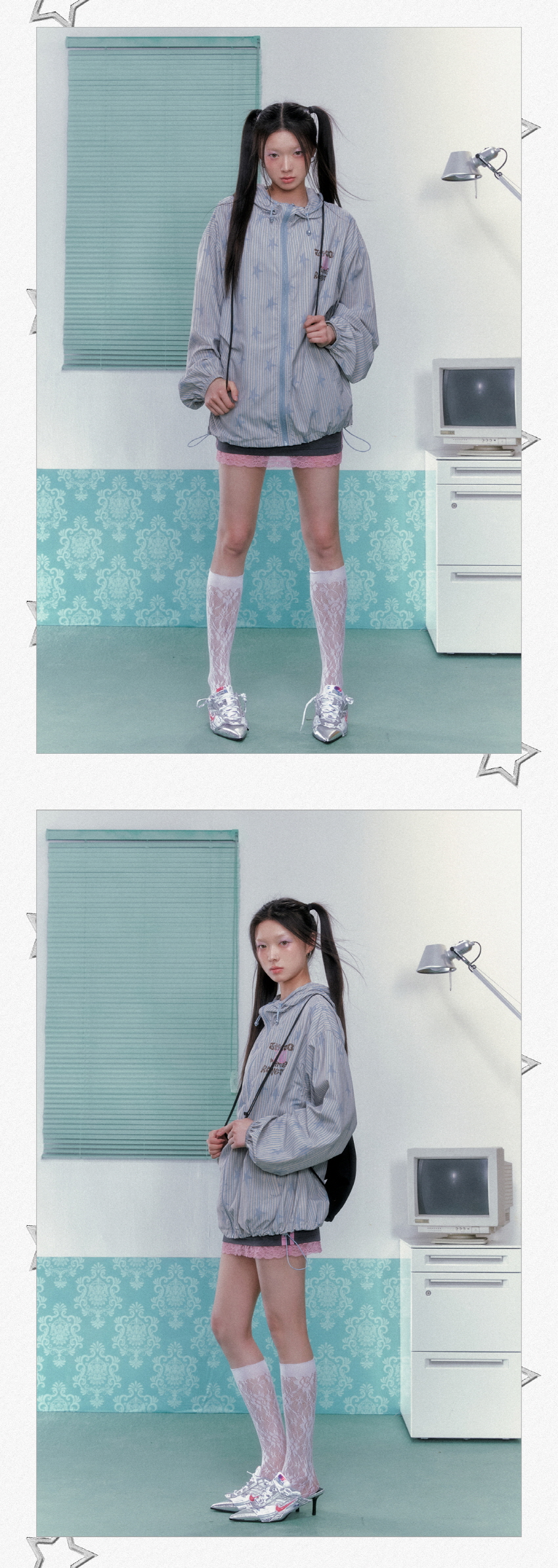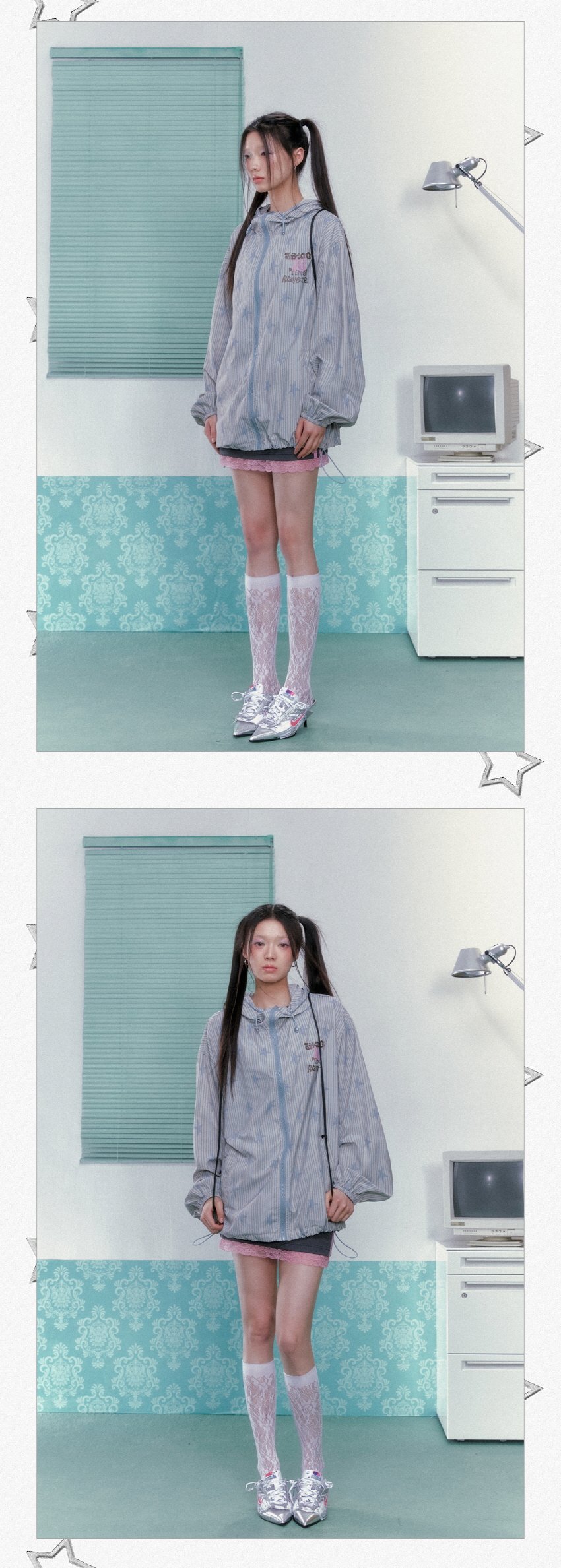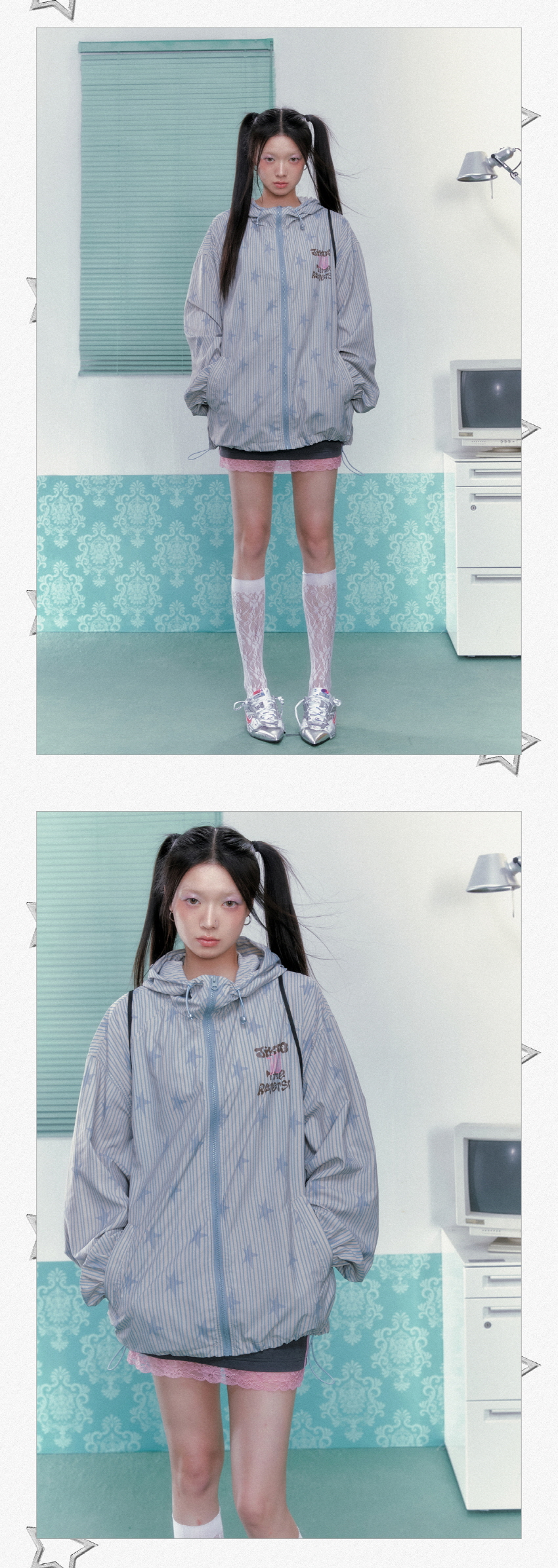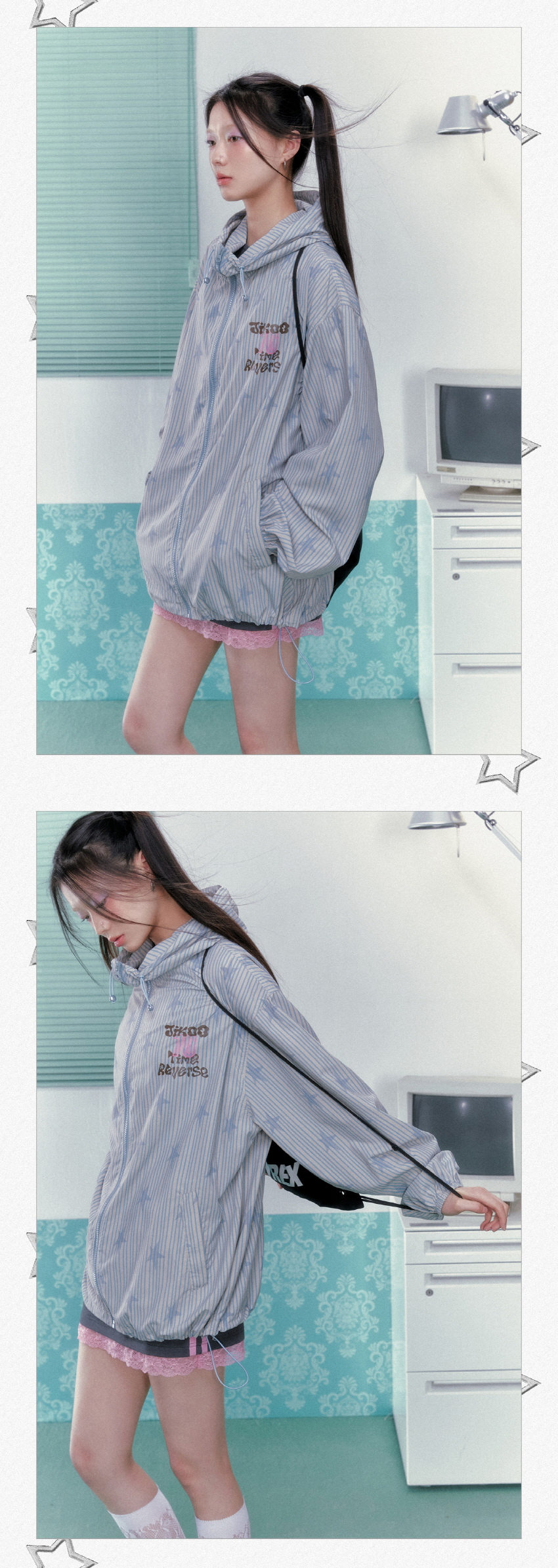 별 프린팅과 스트라이프로 포인트로 제작된 귀여운 윈드브레이커 후드 자켓입니다.