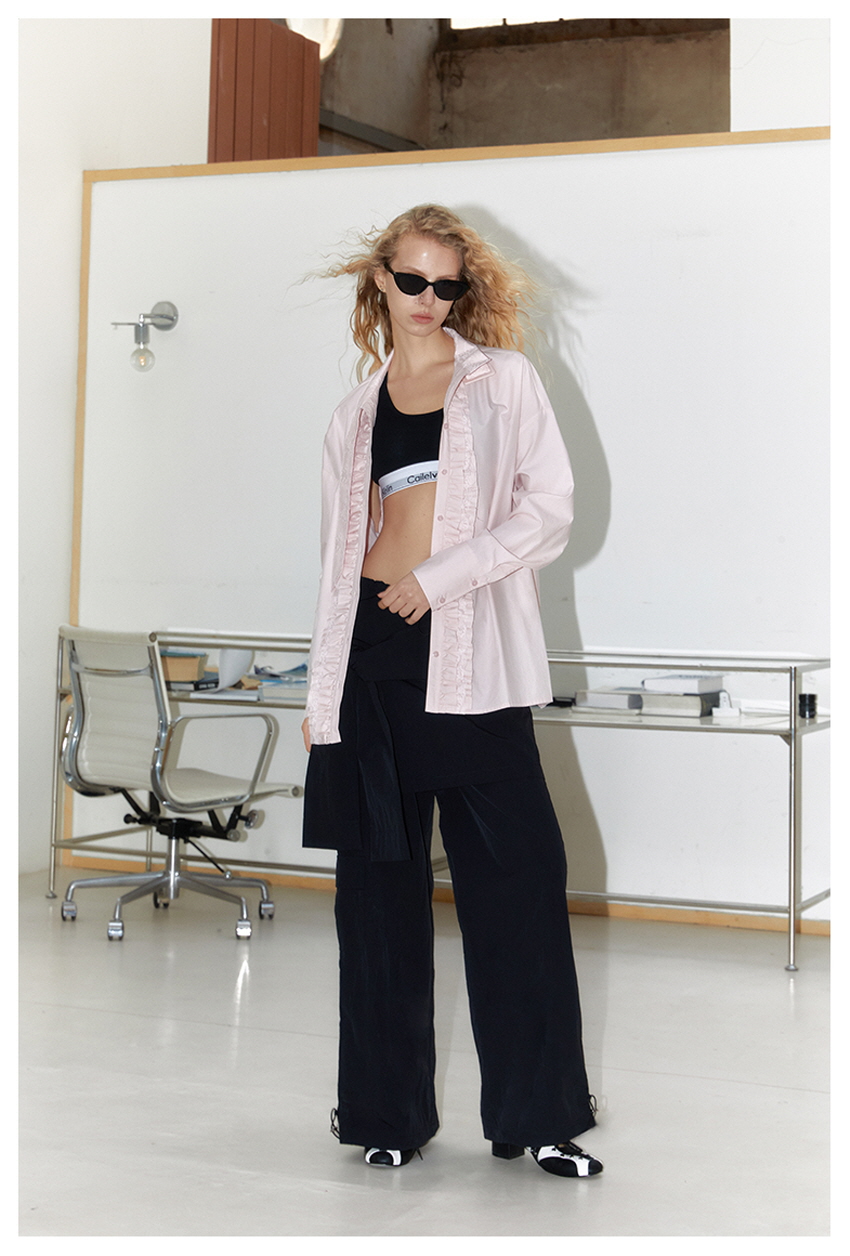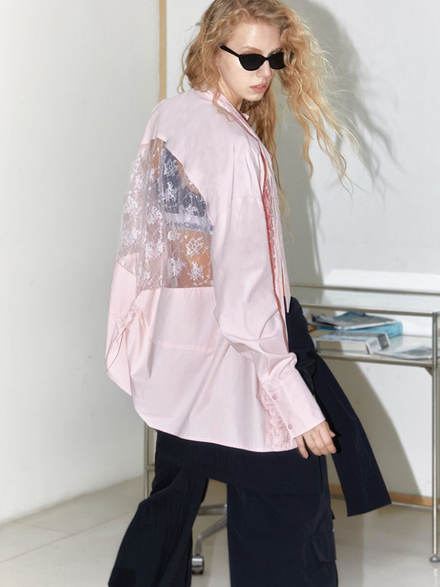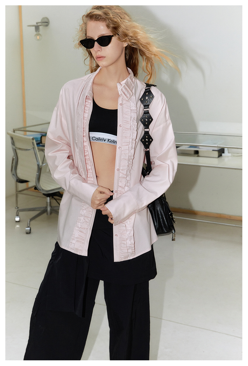 레이스 및 셔링 디테일과 백리스가 포인트인 유니크한 셔츠입니다.