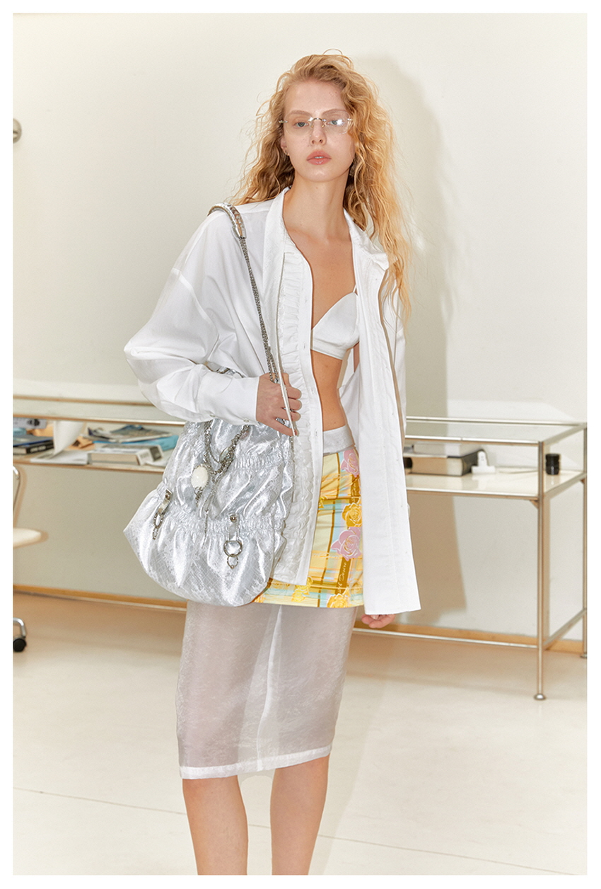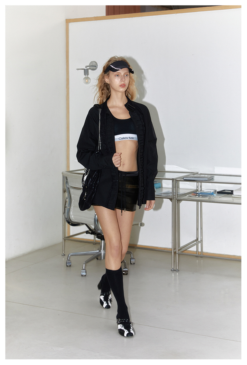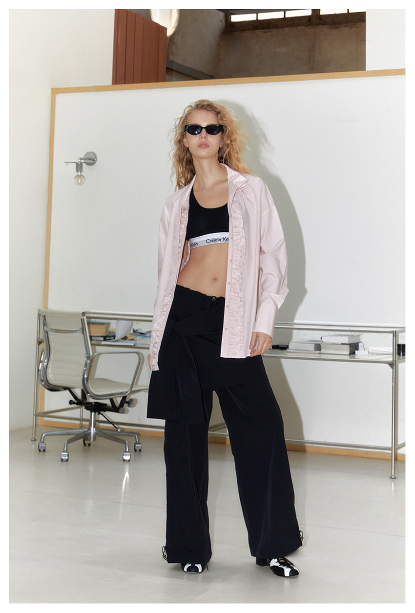 레이스 및 셔링 디테일과 백리스가 포인트인 유니크한 셔츠입니다.