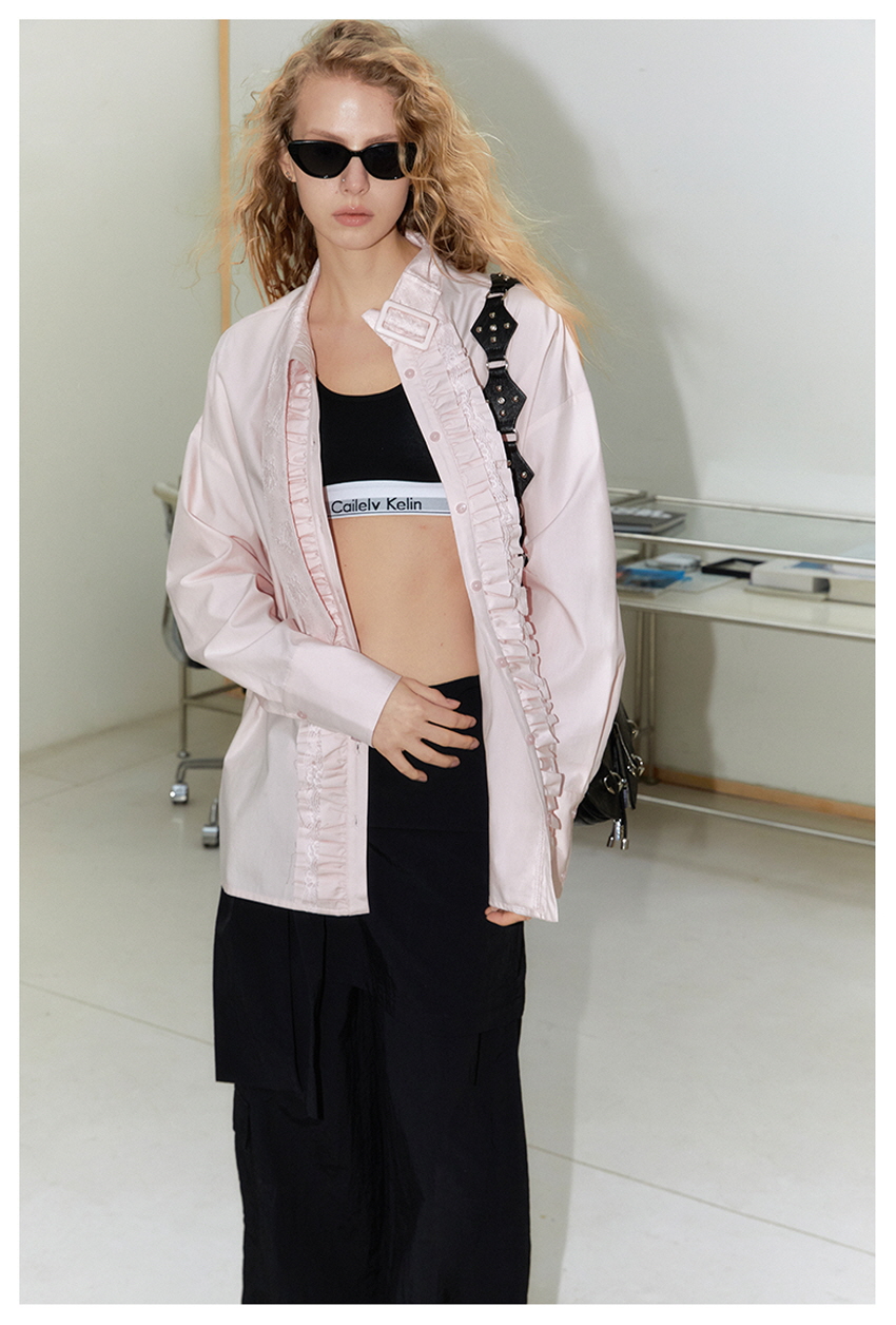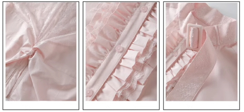 - 단추 옆 부분 셔링과 레이스 레이어드 디테일
