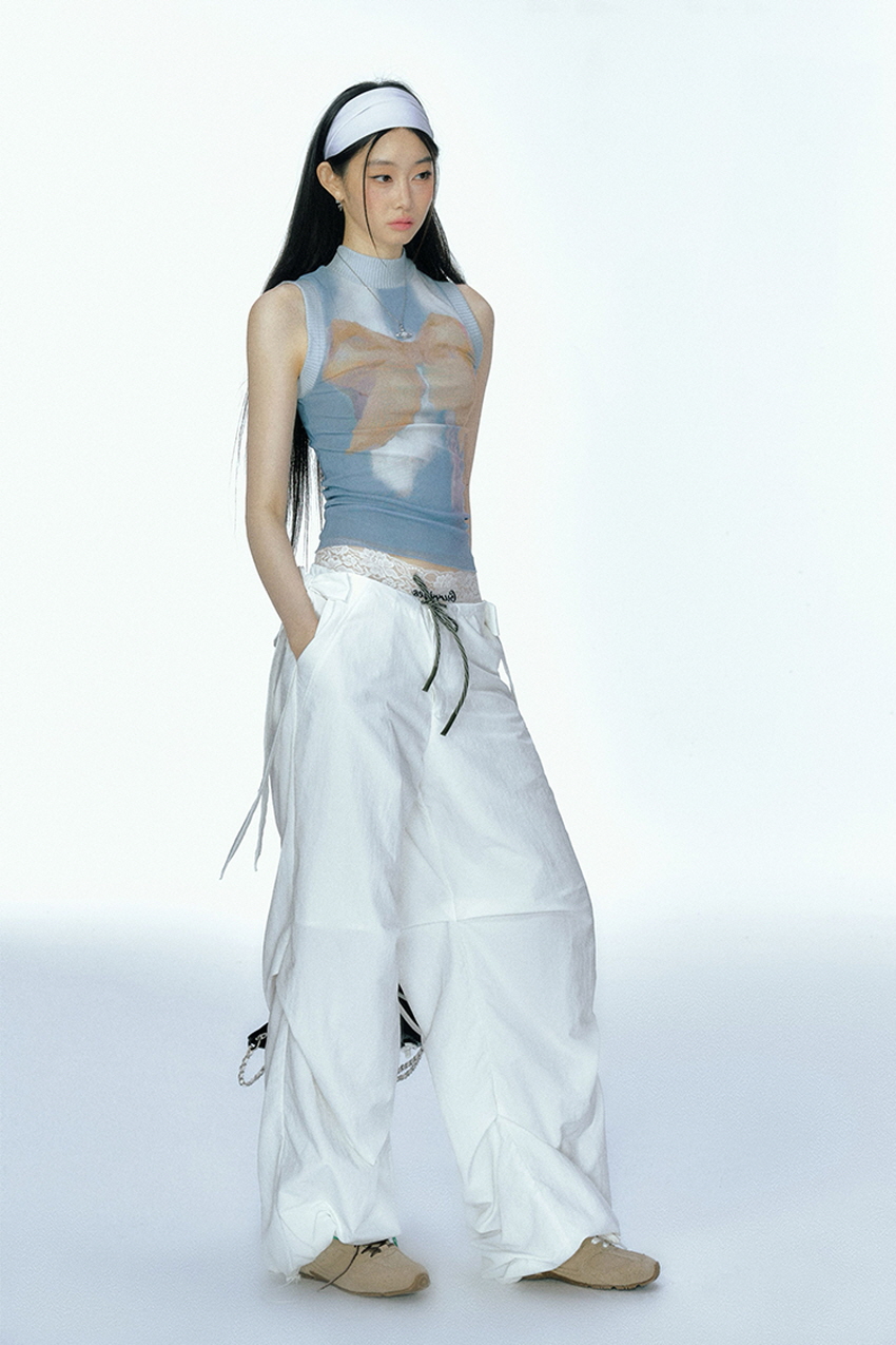 리본 장식이 붙어있어 귀여운 와이드 스포츠 팬츠입니다.