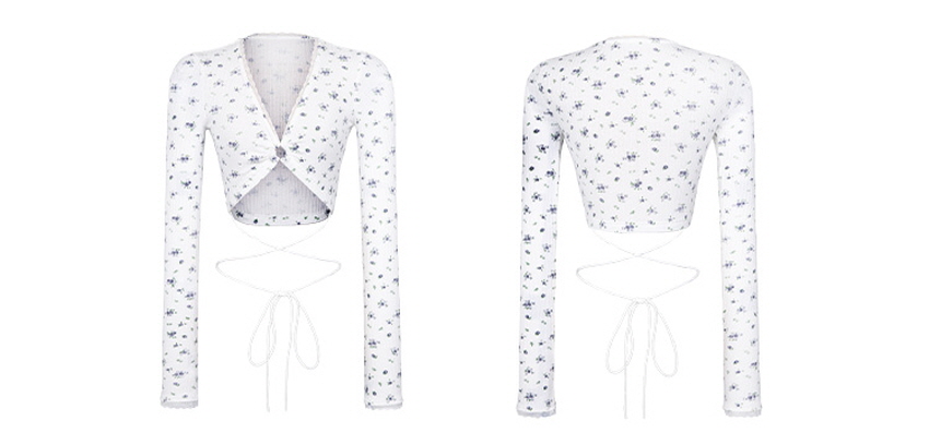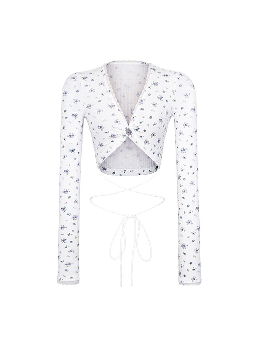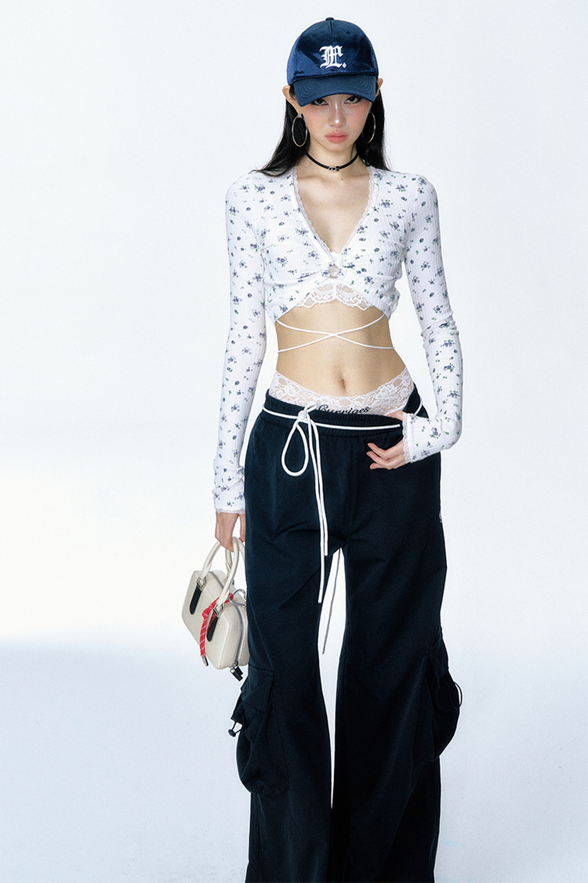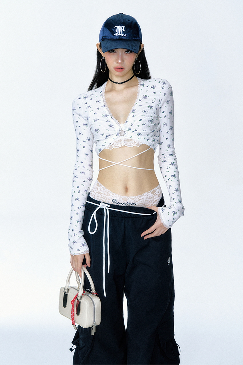 플라워 프린팅이 가미된 브이넥 레이스 크롭탑입니다.
