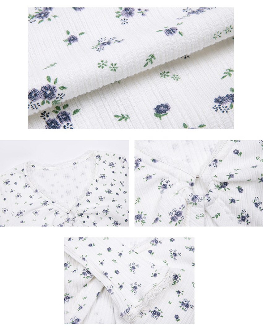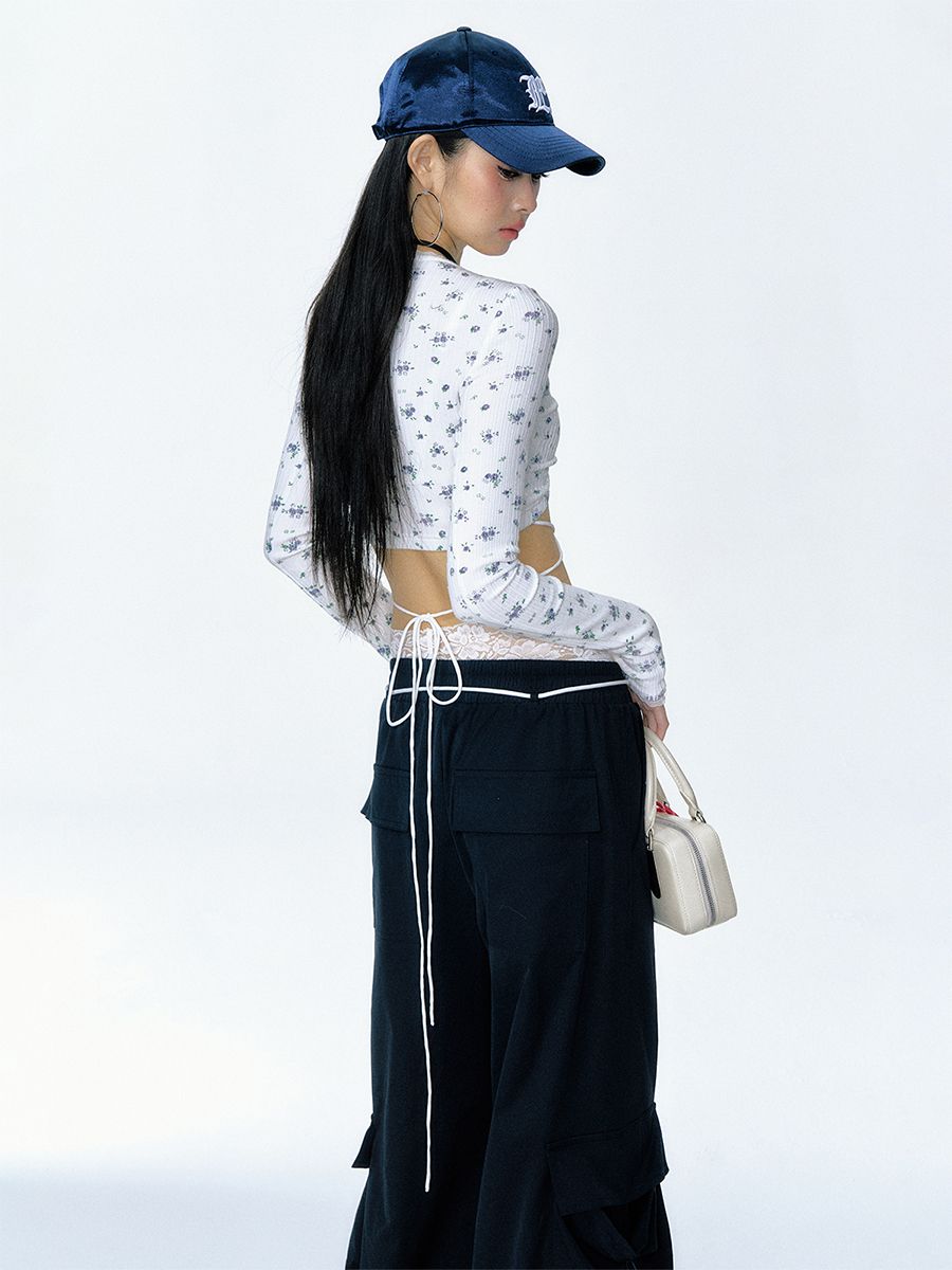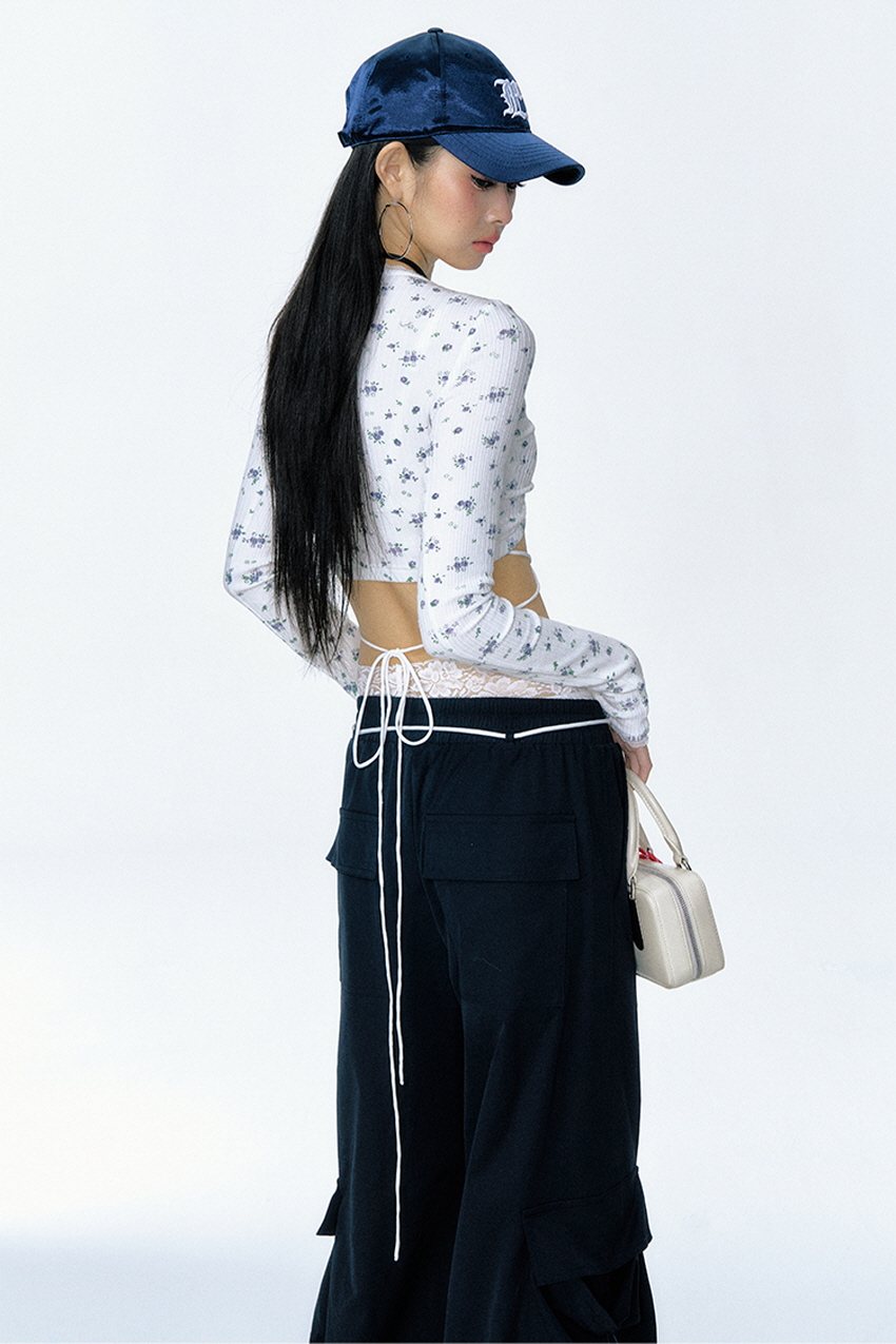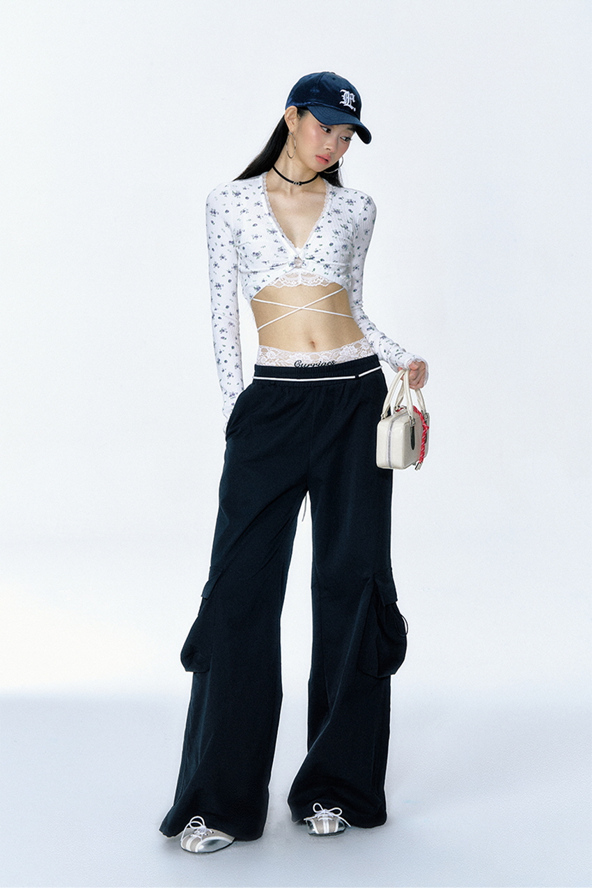 플라워 프린팅이 가미된 브이넥 레이스 크롭탑입니다.