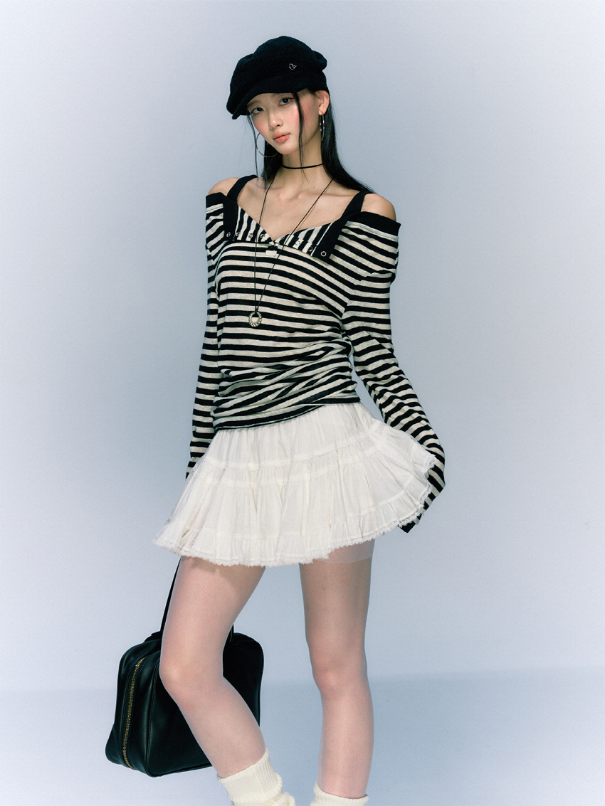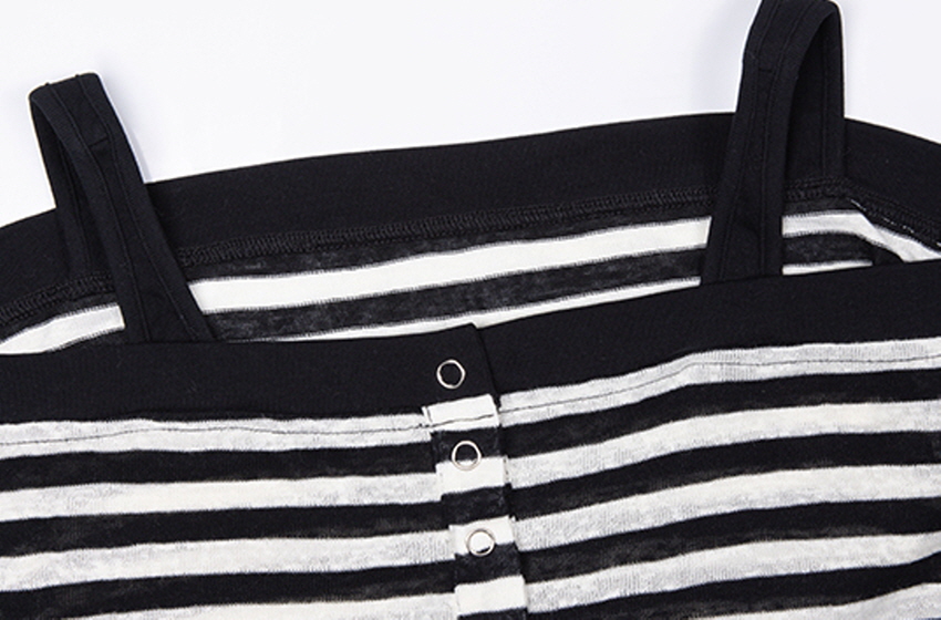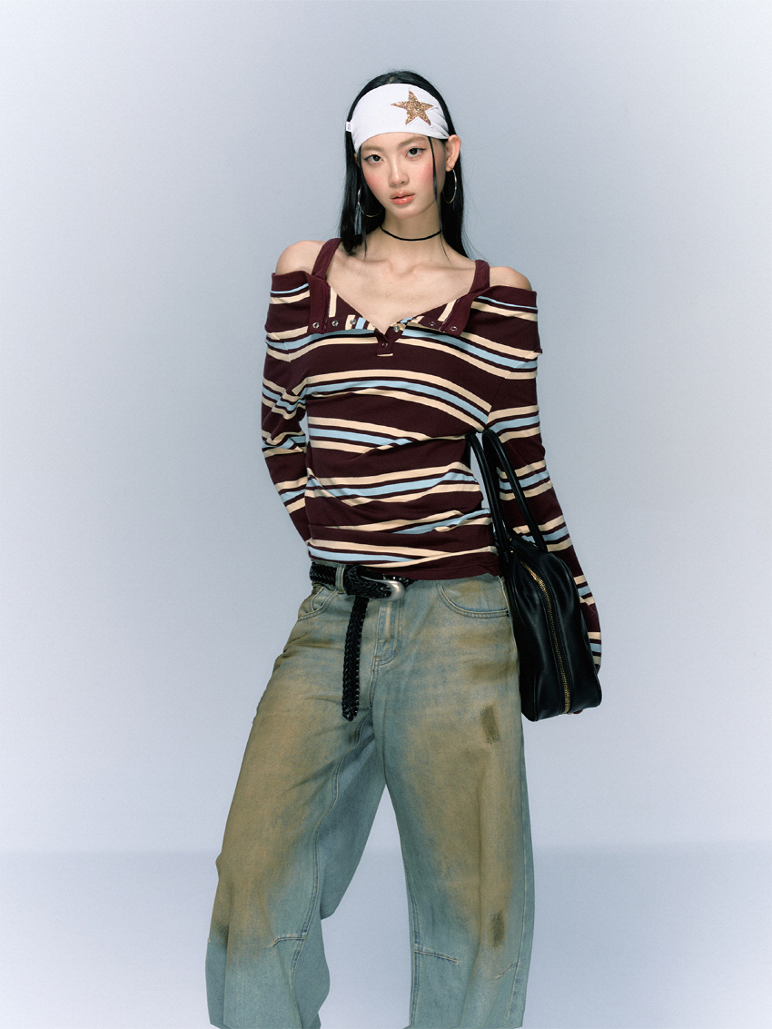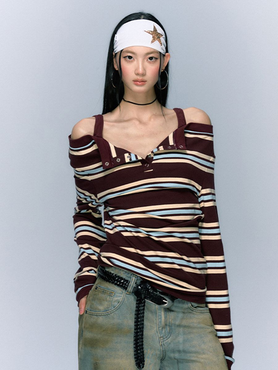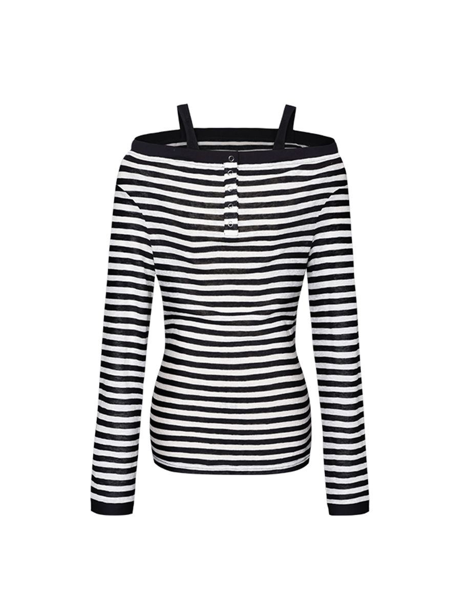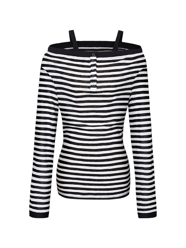 Striped Open Button OFF-Shoulder Top