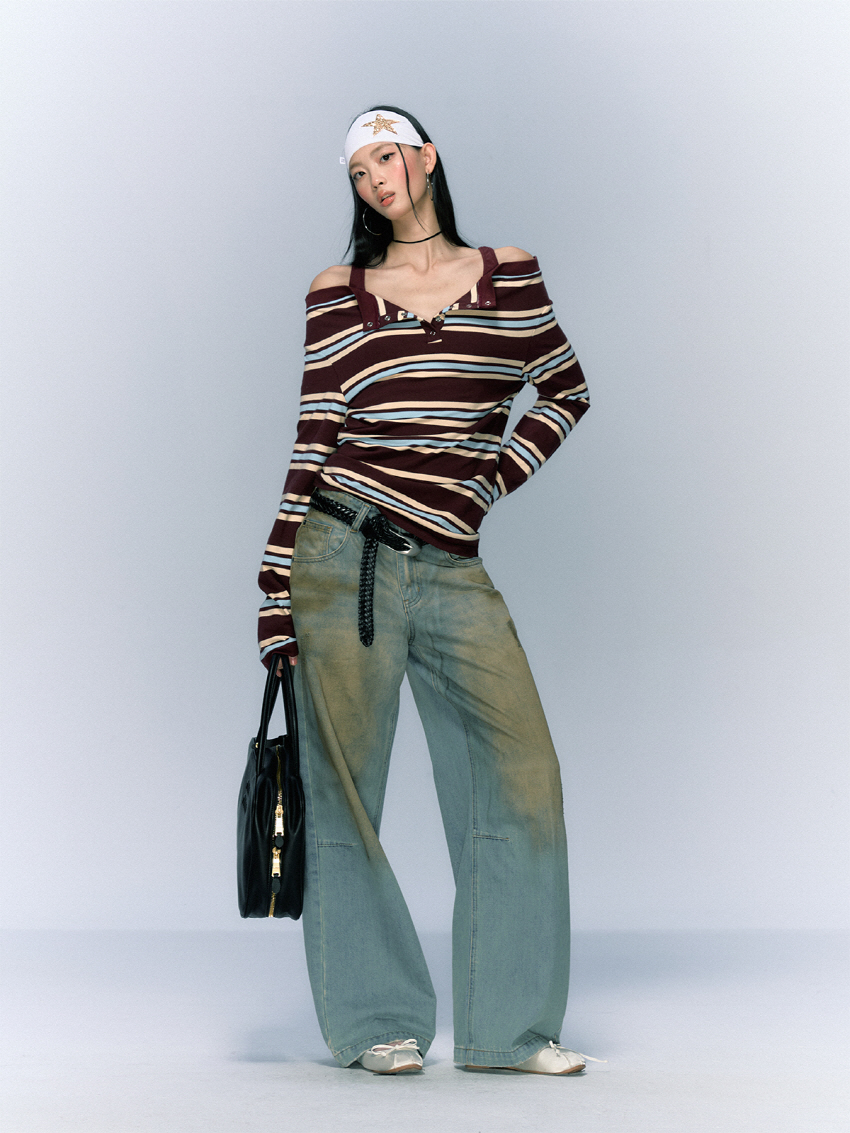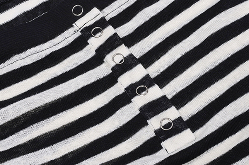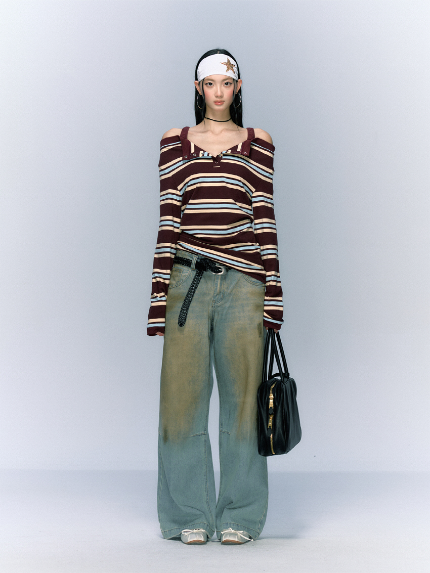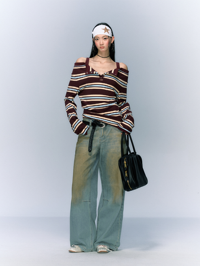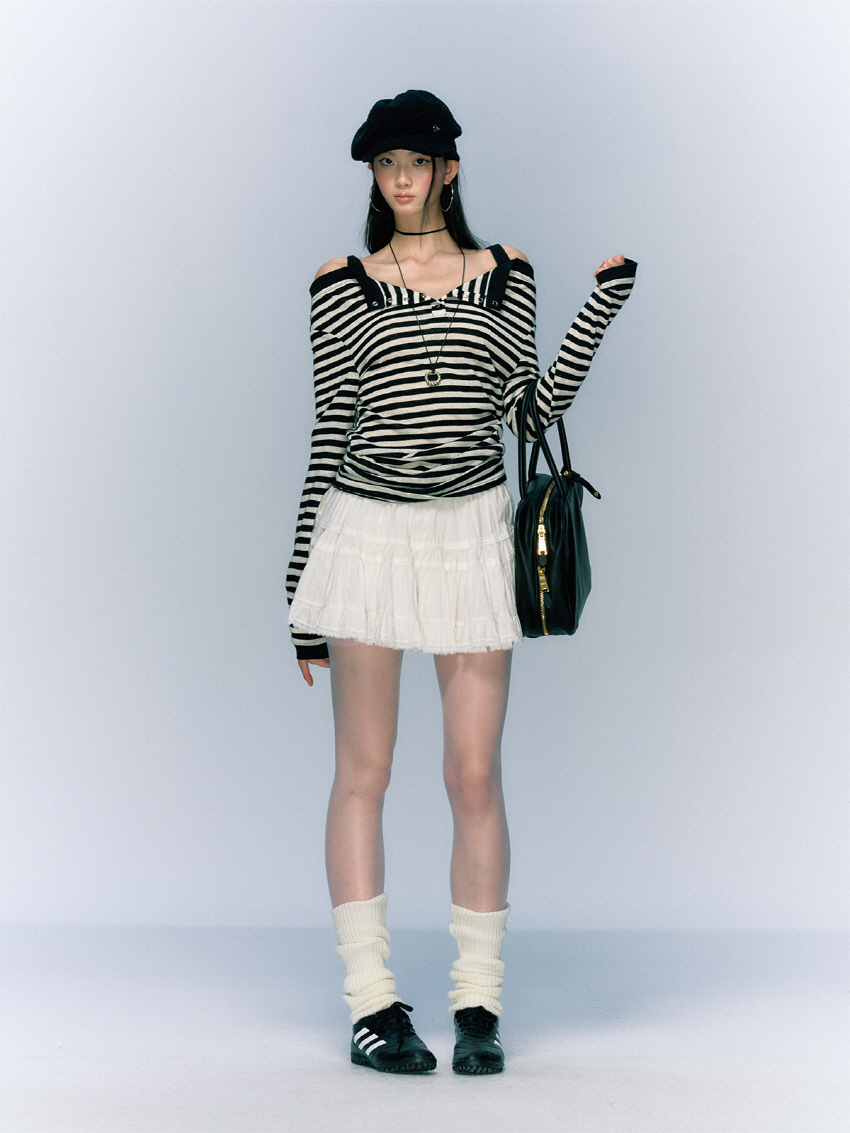 Striped Open Button OFF-Shoulder Top