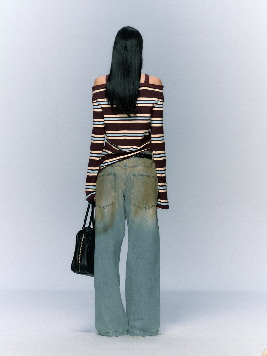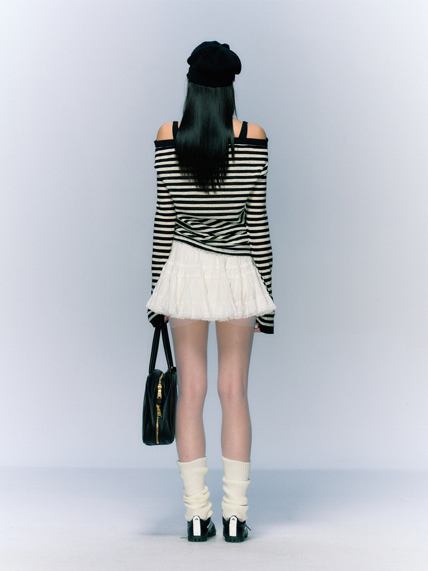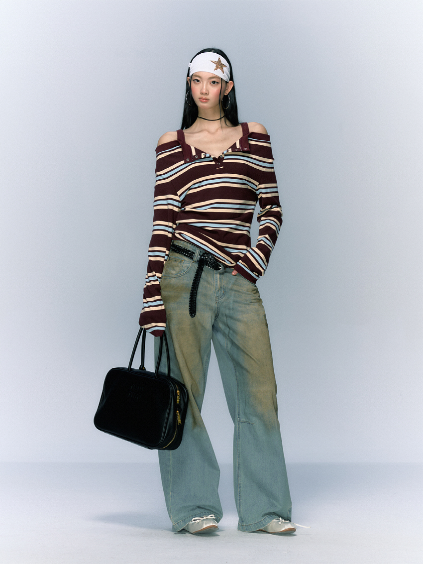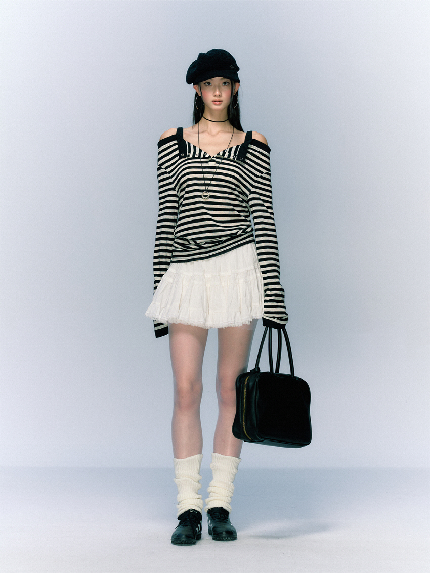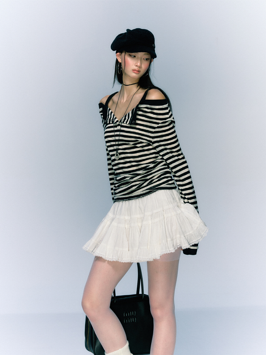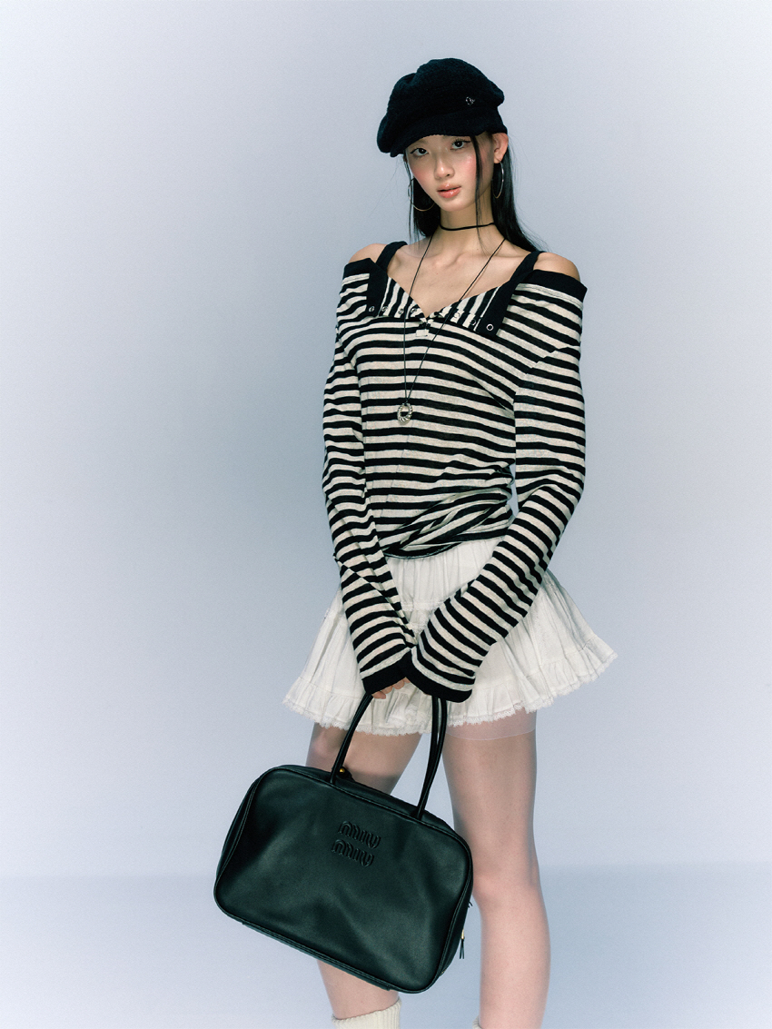 소프트한 착용감의 버튼 슬릿 스트라이프 오프숄더 티셔츠입니다.
