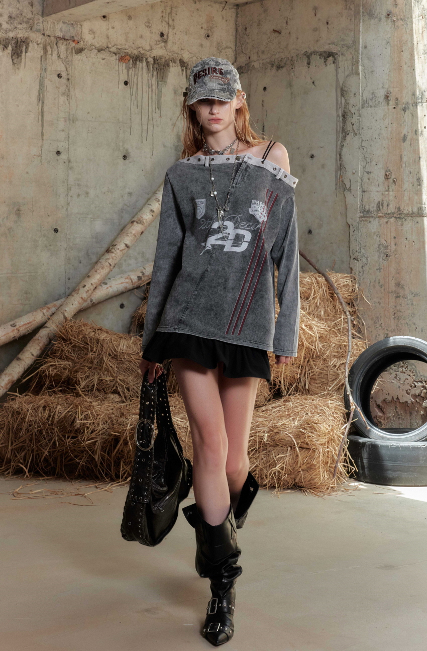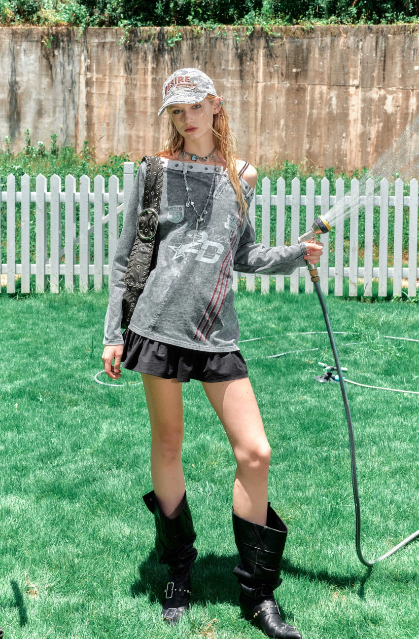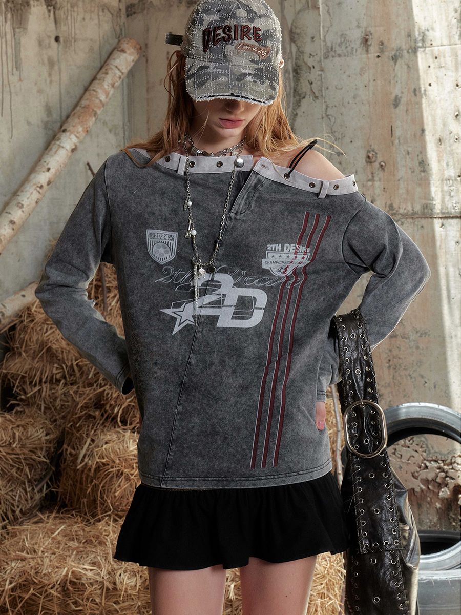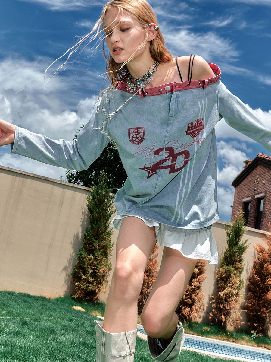 펀칭 넥라인과 염색된 소재가 빈티지한 느낌을 주고, 유행하는 스포츠 디자인이 포함된 오프숄더 디자인의 티셔츠입니다.