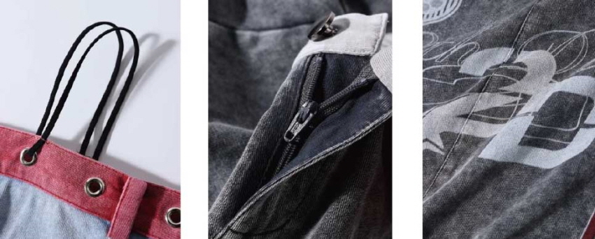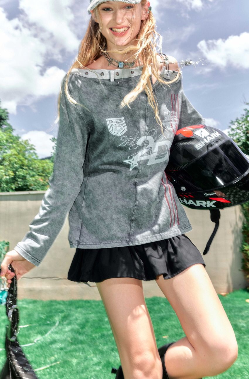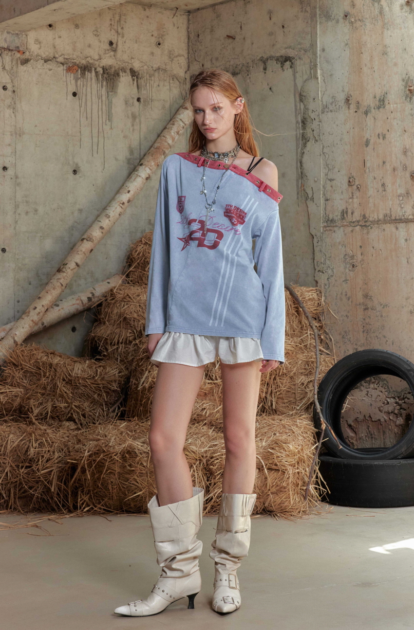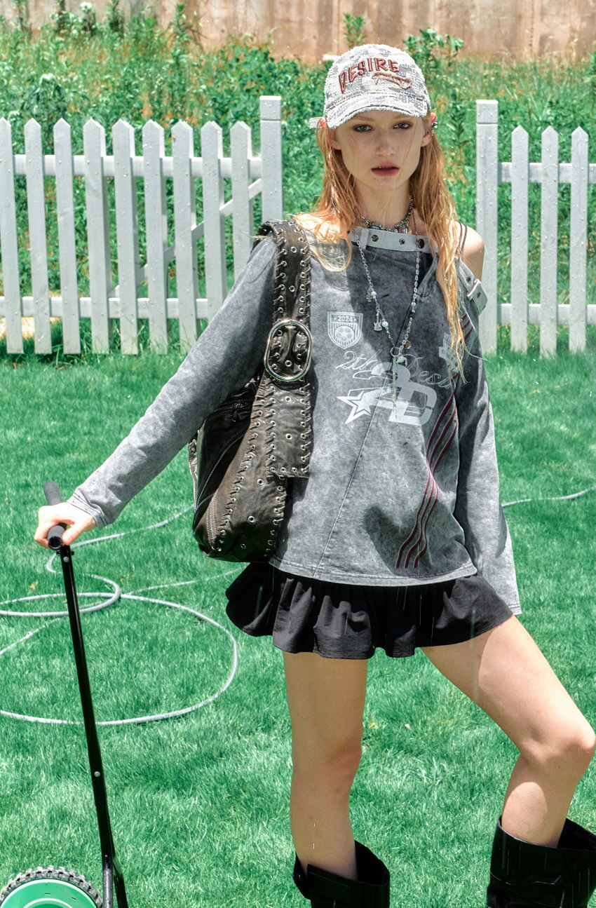 펀칭 넥라인과 염색된 소재가 빈티지한 느낌을 주고, 유행하는 스포츠 디자인이 포함된 오프숄더 디자인의 티셔츠입니다.