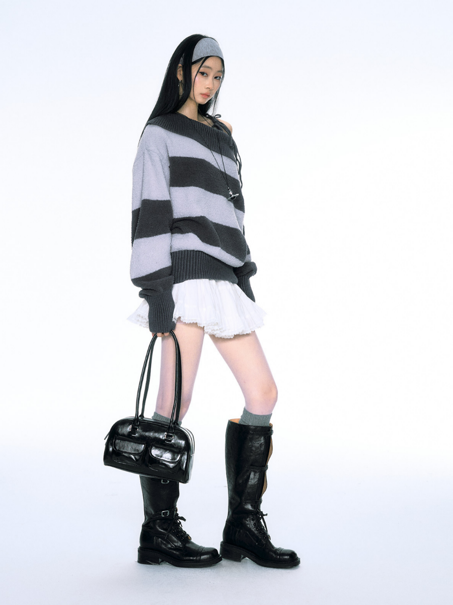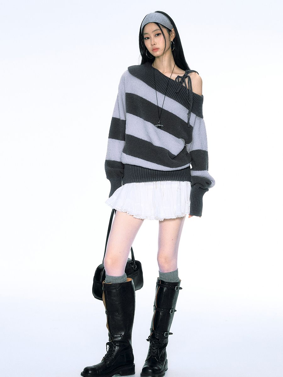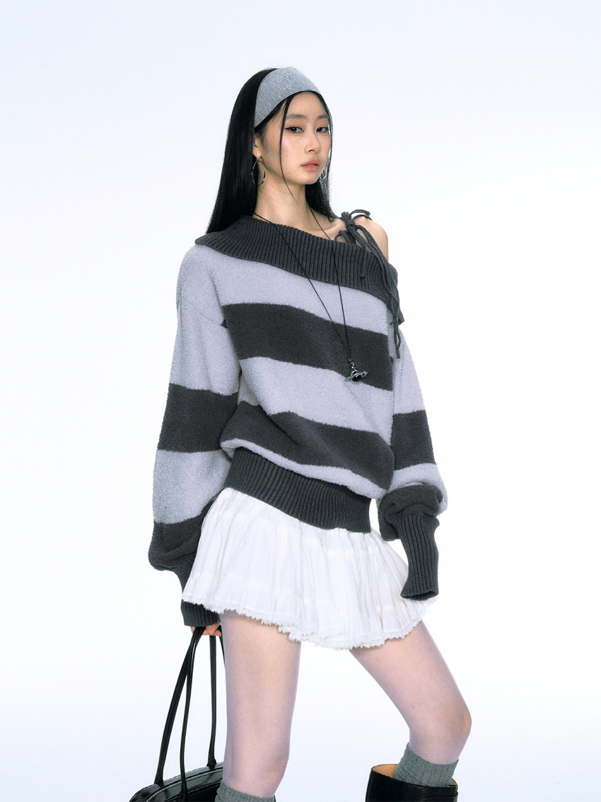 소프트한 벨벳 소재의 스트라이프 패턴 오프숄더 니트입니다.