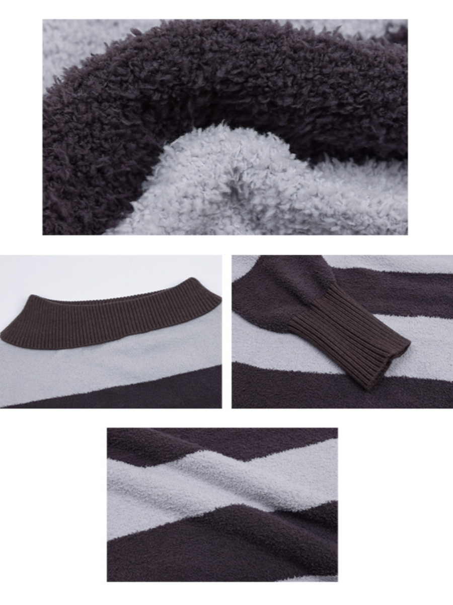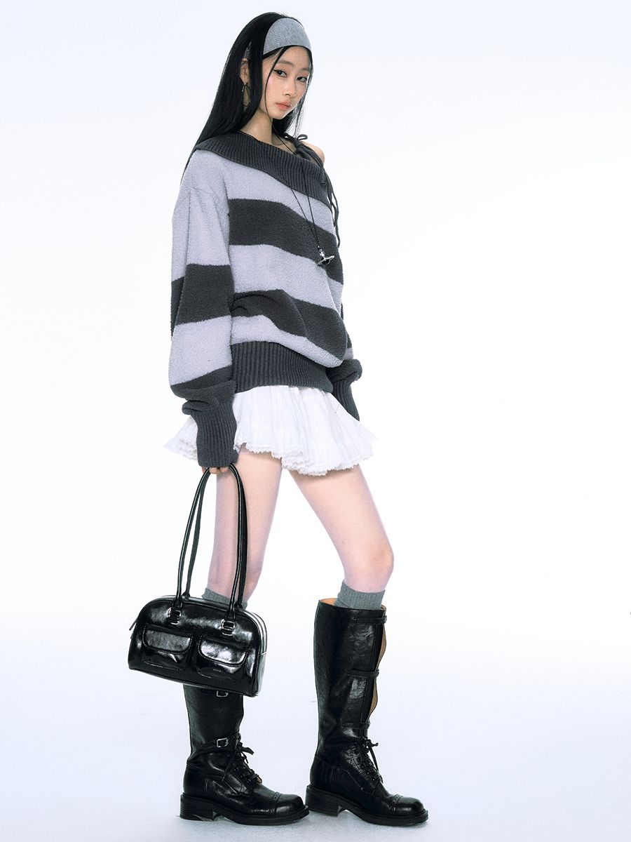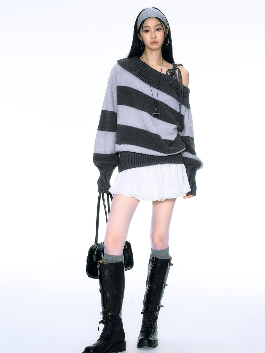 소프트한 벨벳 소재의 스트라이프 패턴 오프숄더 니트입니다.