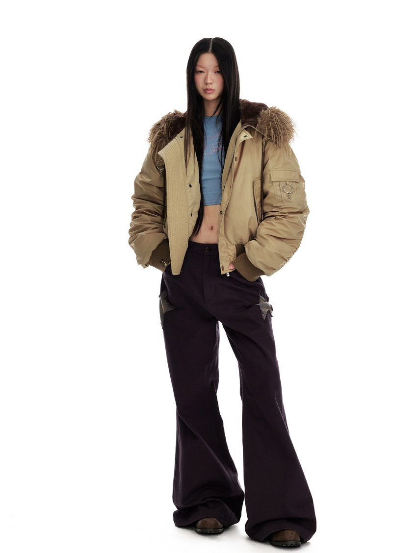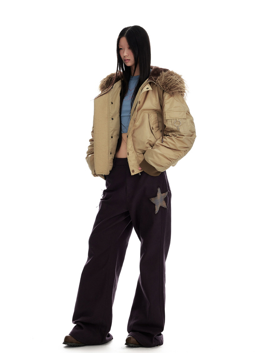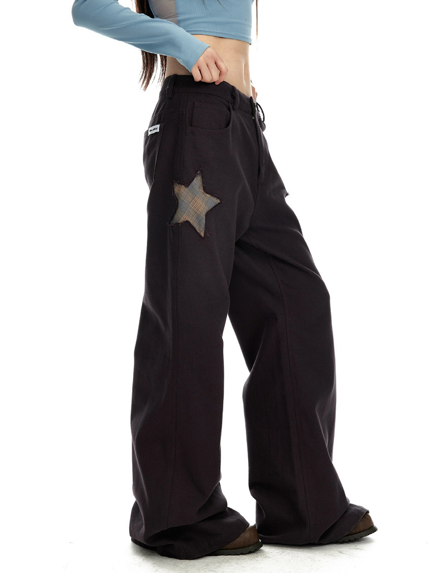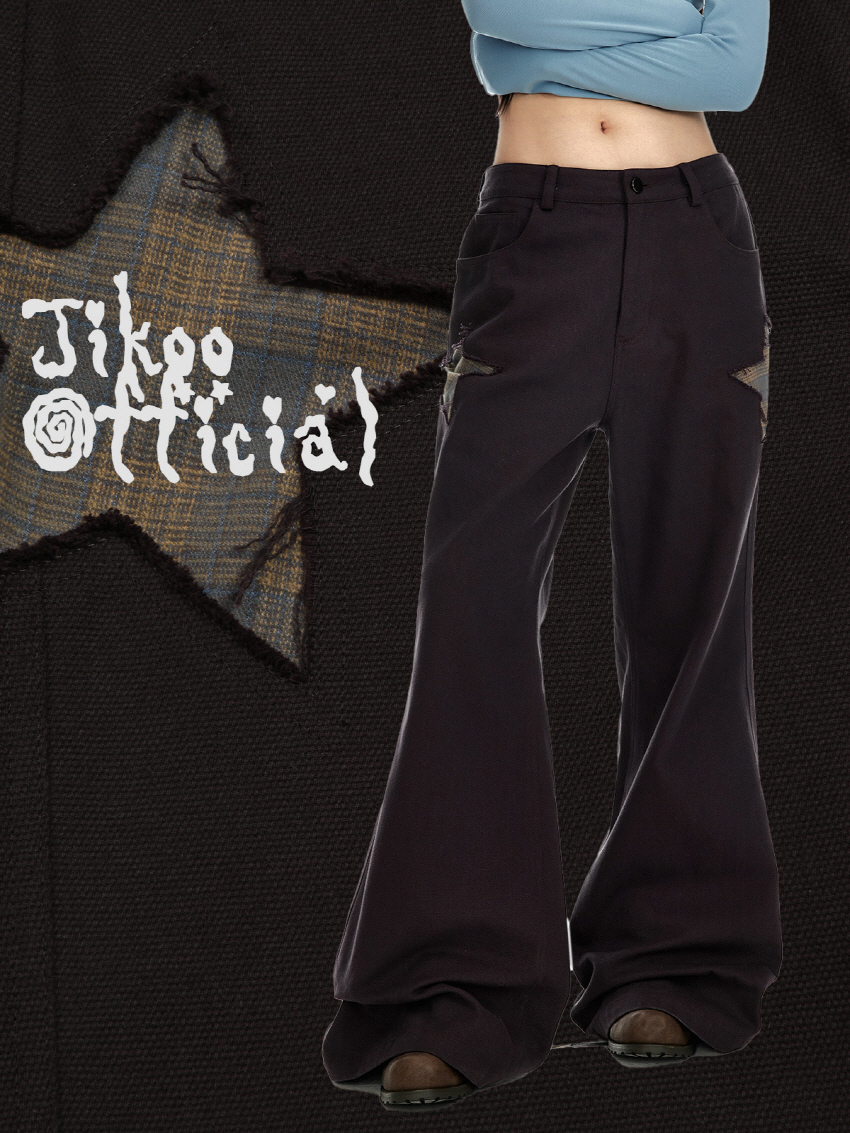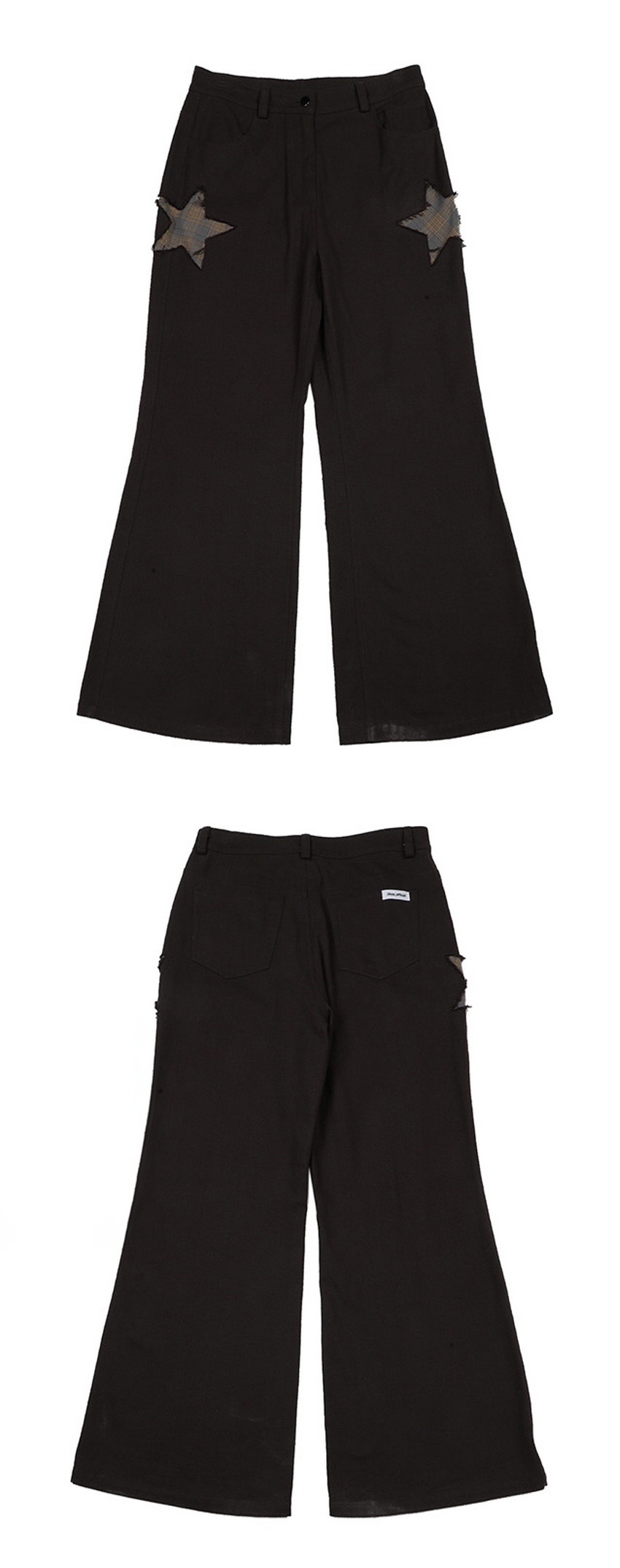 양쪽 측면의 별모양 패치워크 디테일이 돋보이는 와이드 부츠컷 팬츠 입니다.