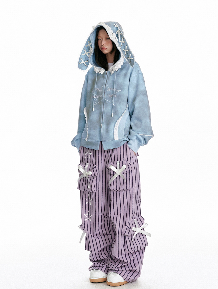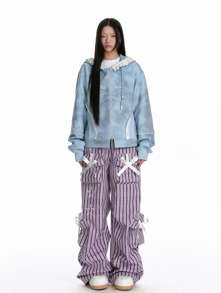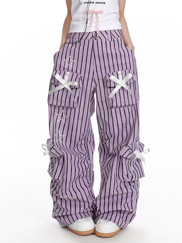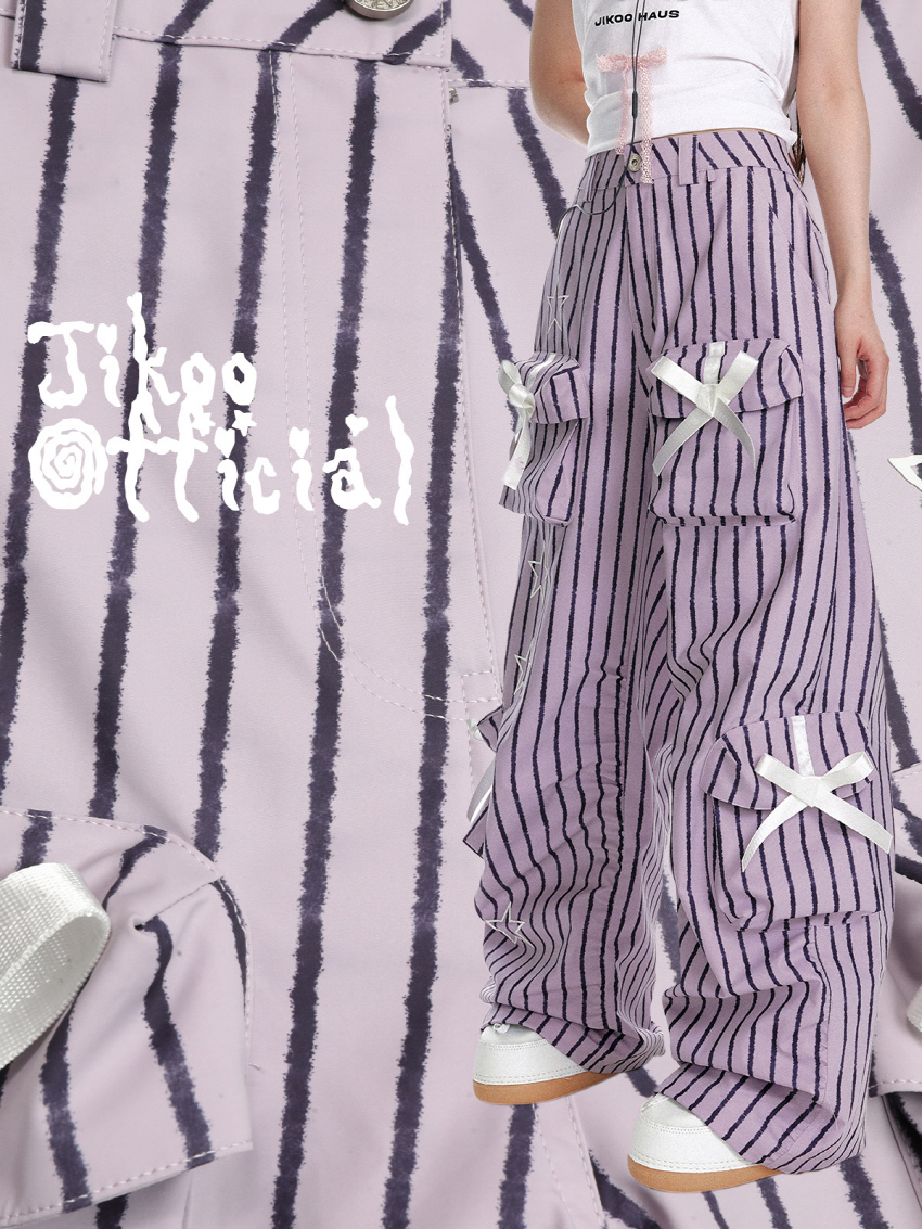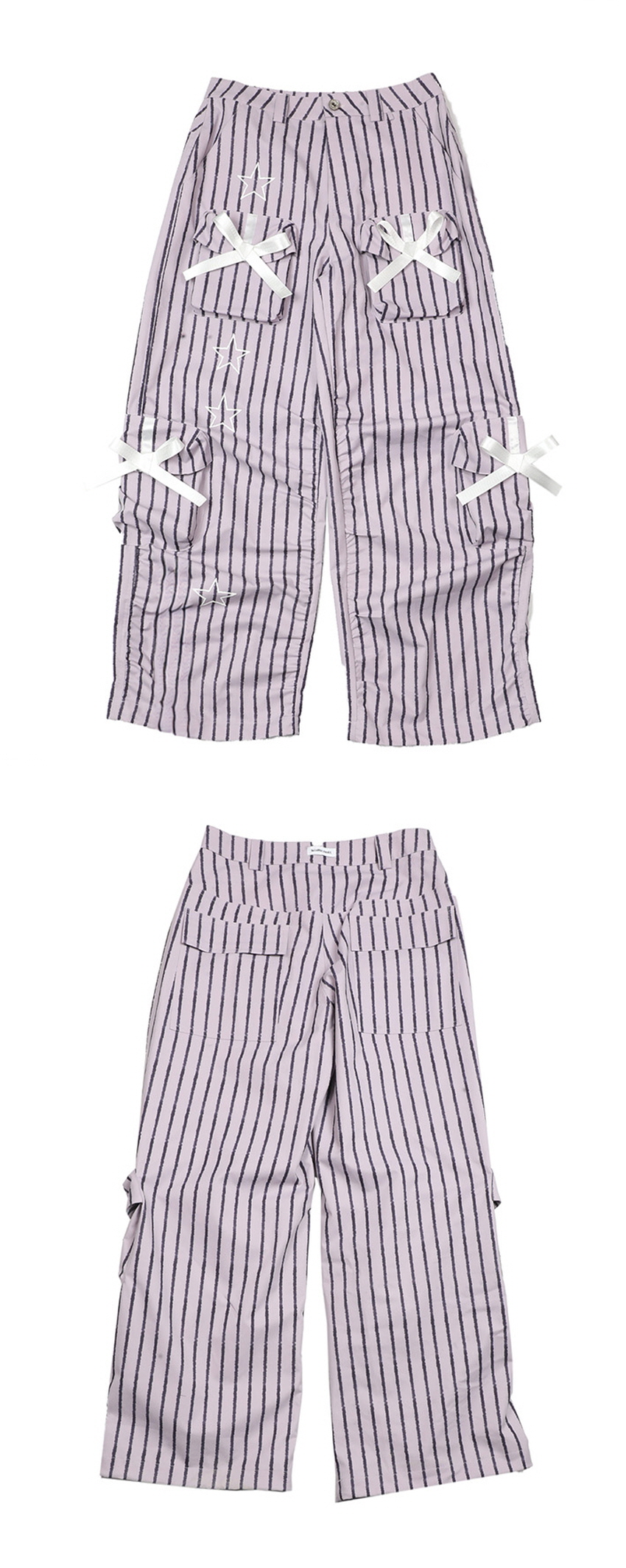 귀여운 리본이 포인트인 캐주얼한 무드의 파라슈트 스트라이프 팬츠입니다.