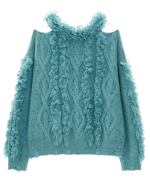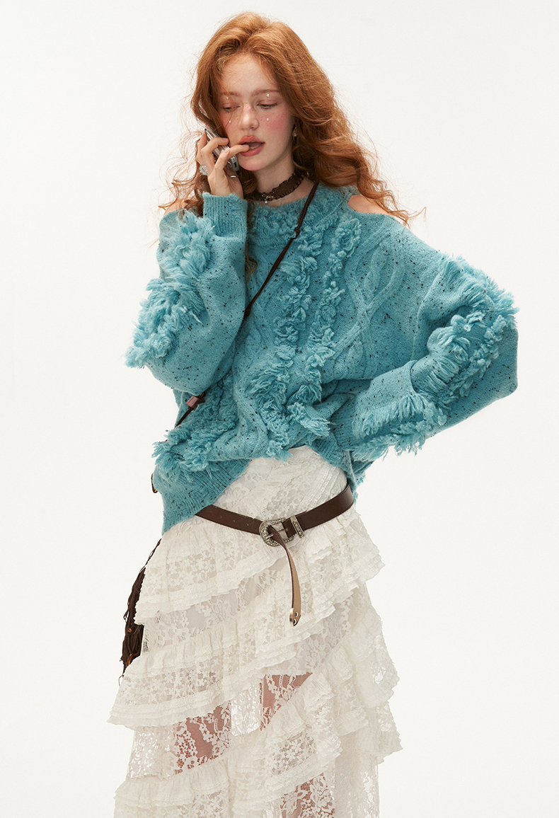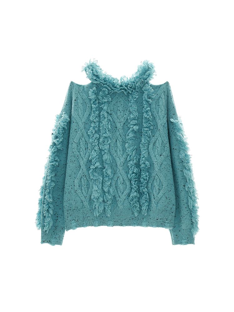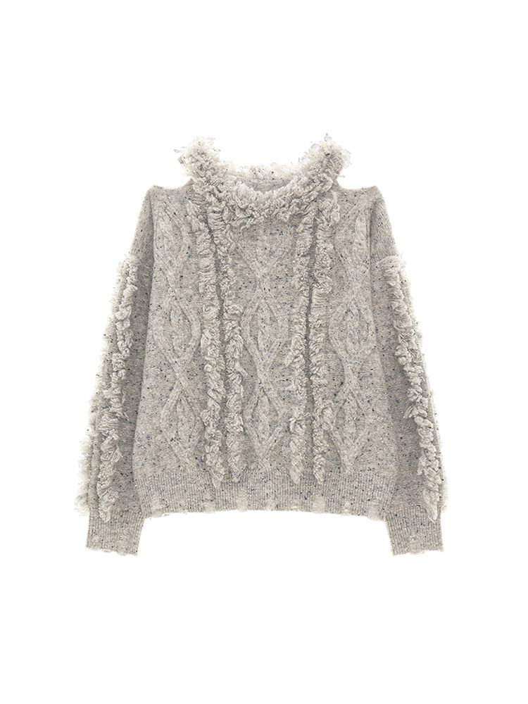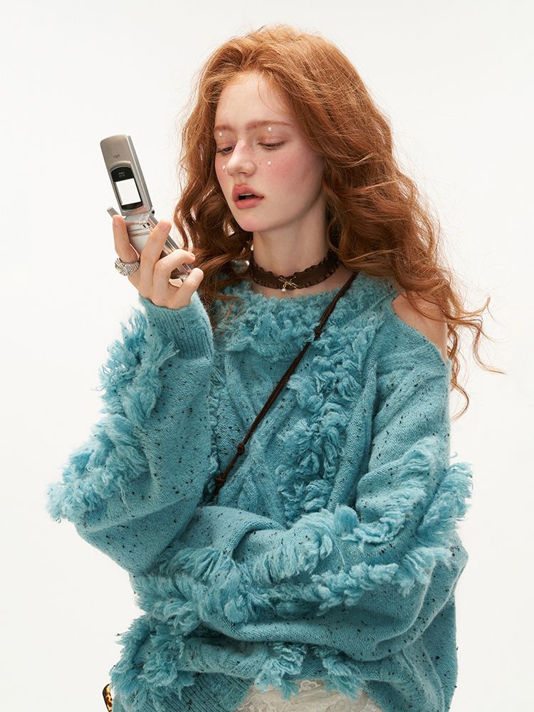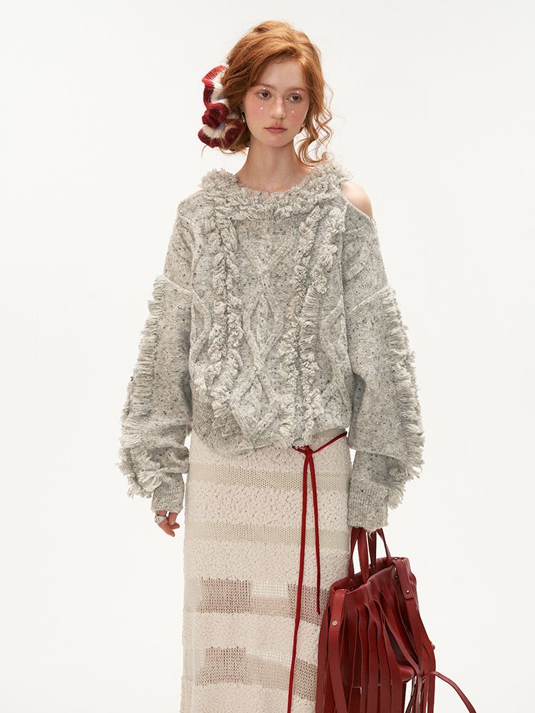 Cut-out Shoulder Loose Fringe Knit Top
