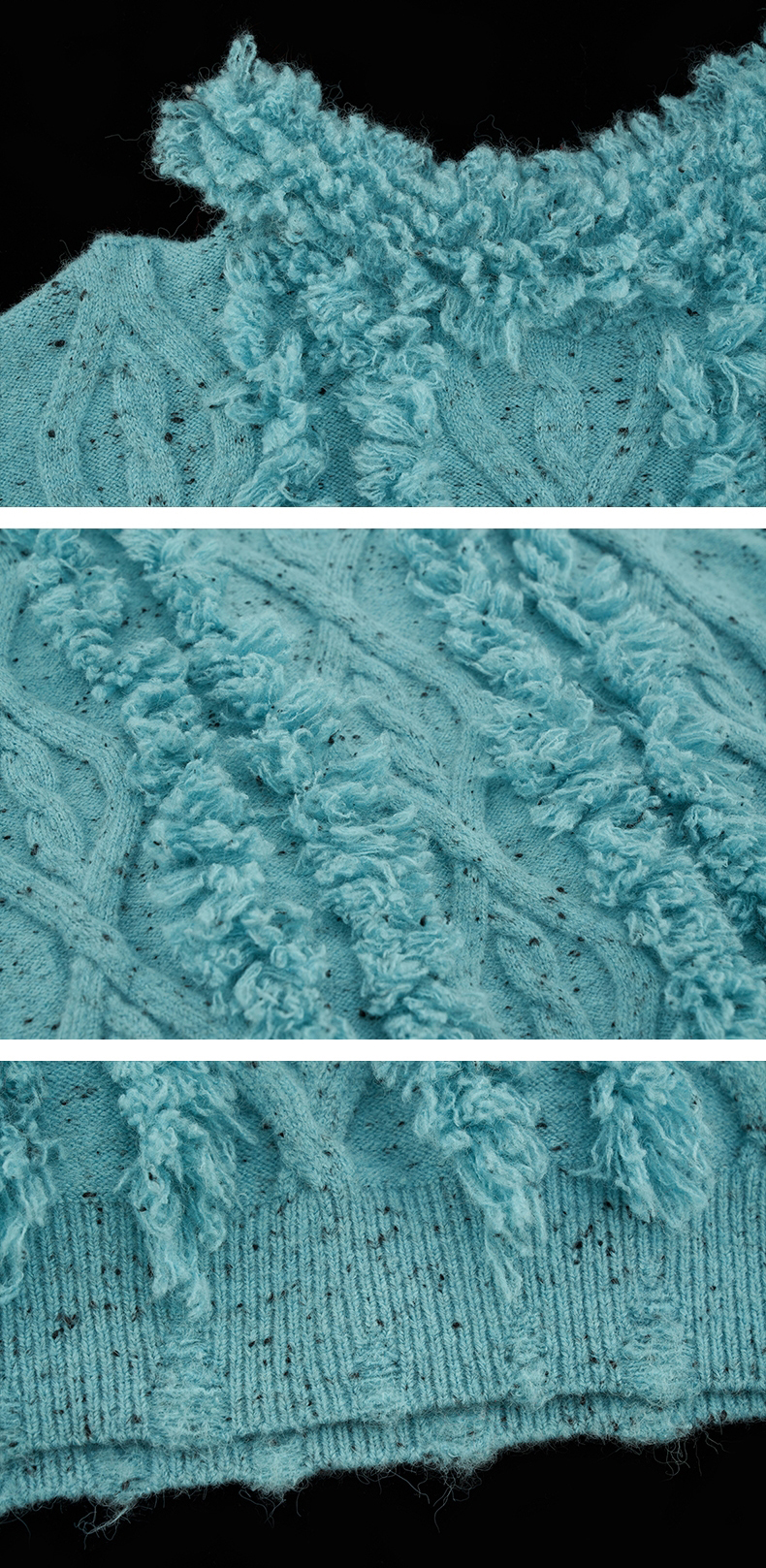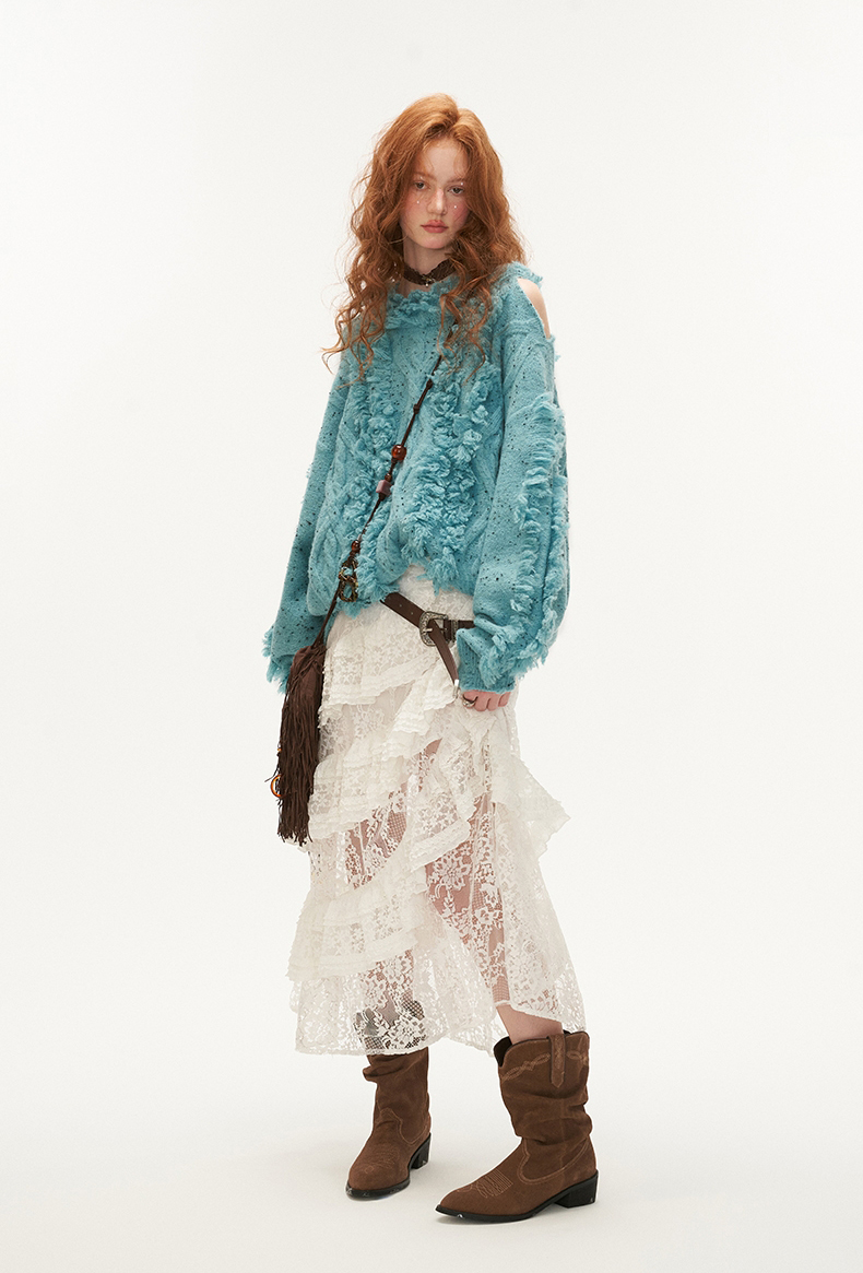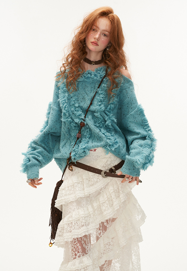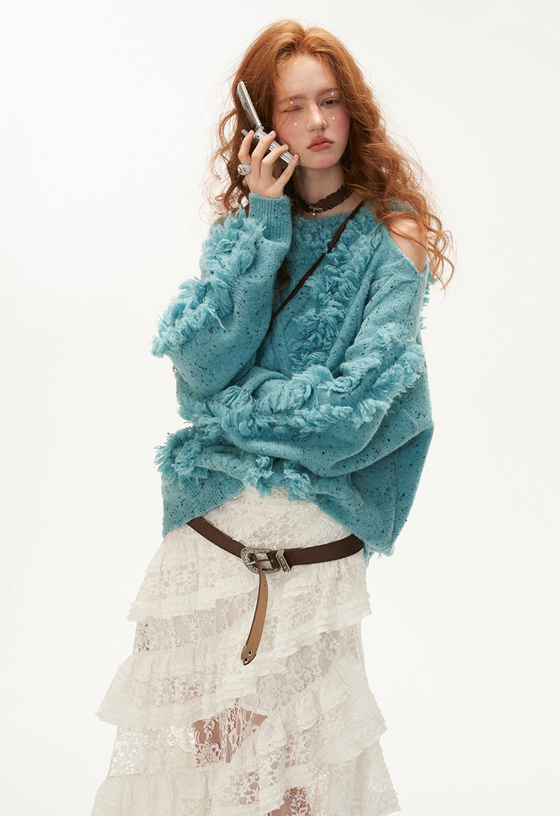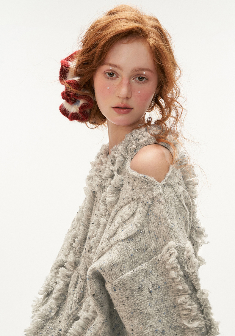 Cut-out Shoulder Loose Fringe Knit Top