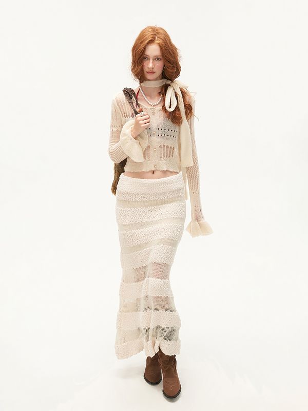 유니크한 무드의 프린지와 컷 아웃 디자인의 니트 탑입니다.