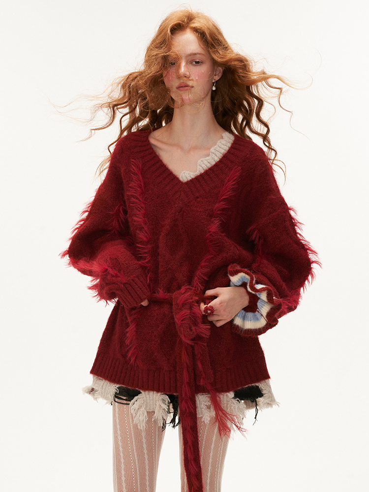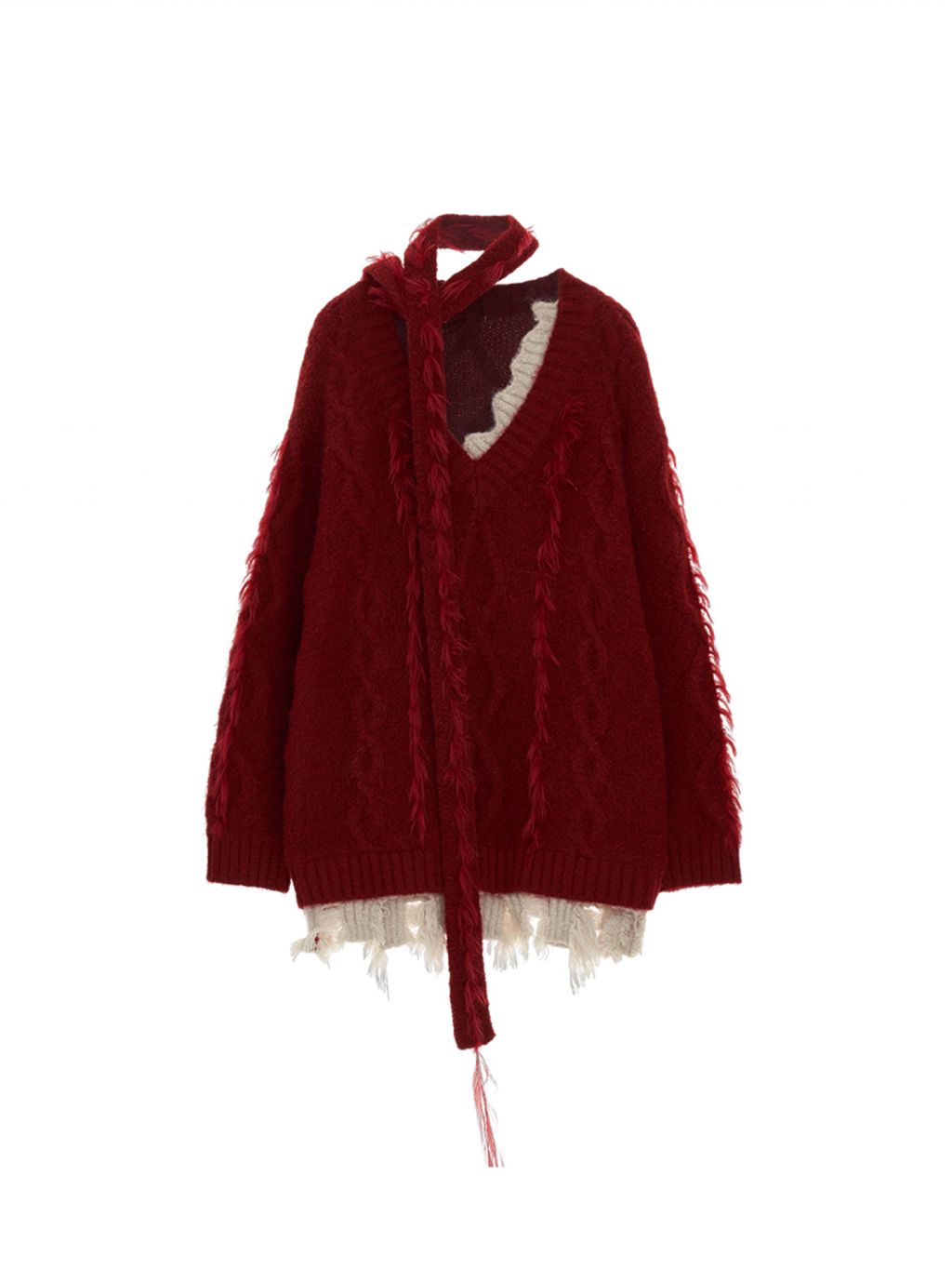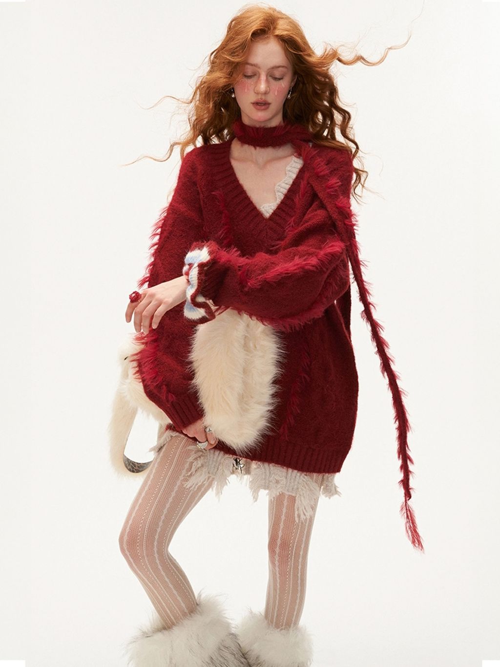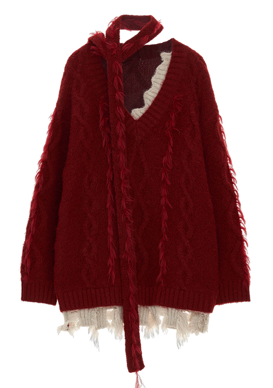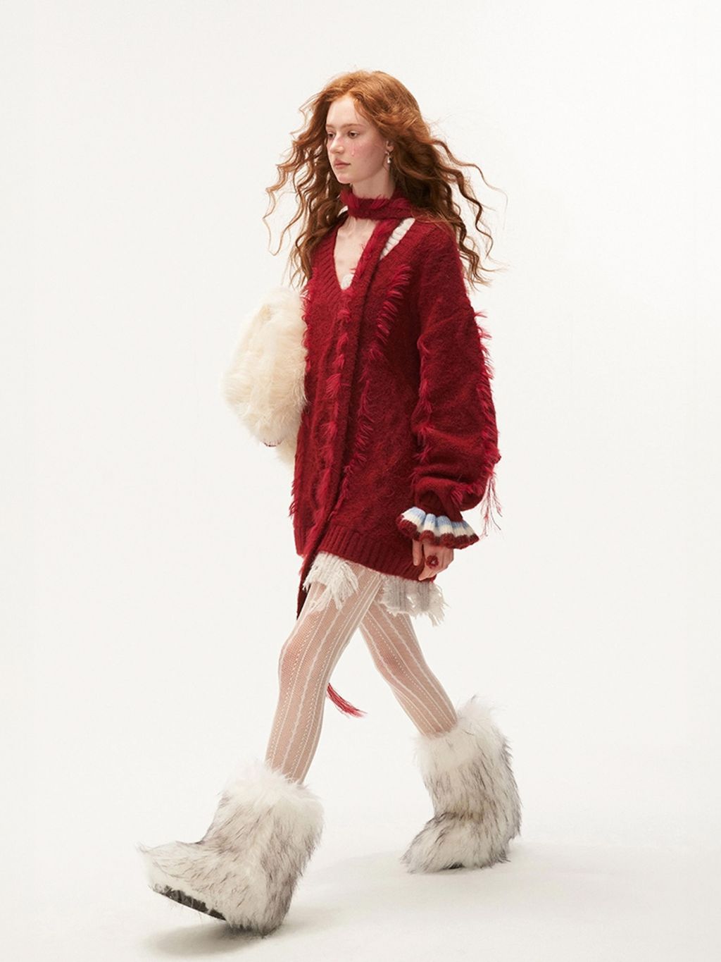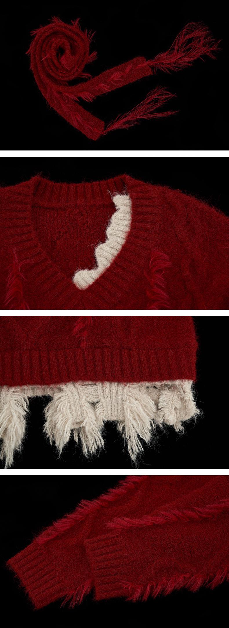 Red Faux-2Piece Fringe Sweater & Scarf Set