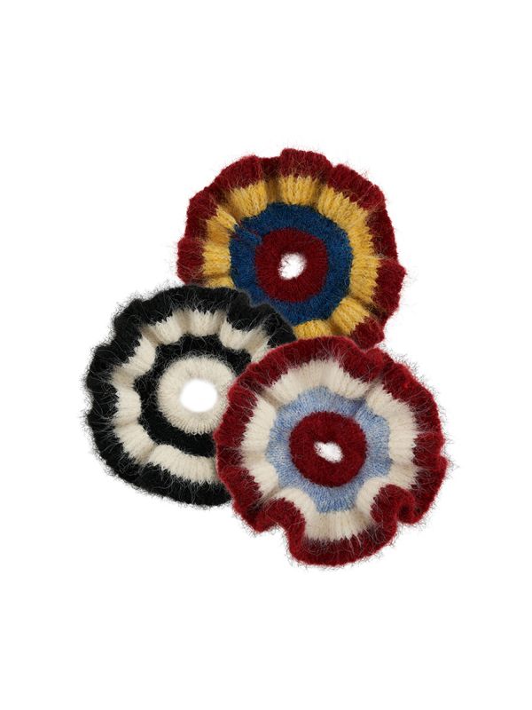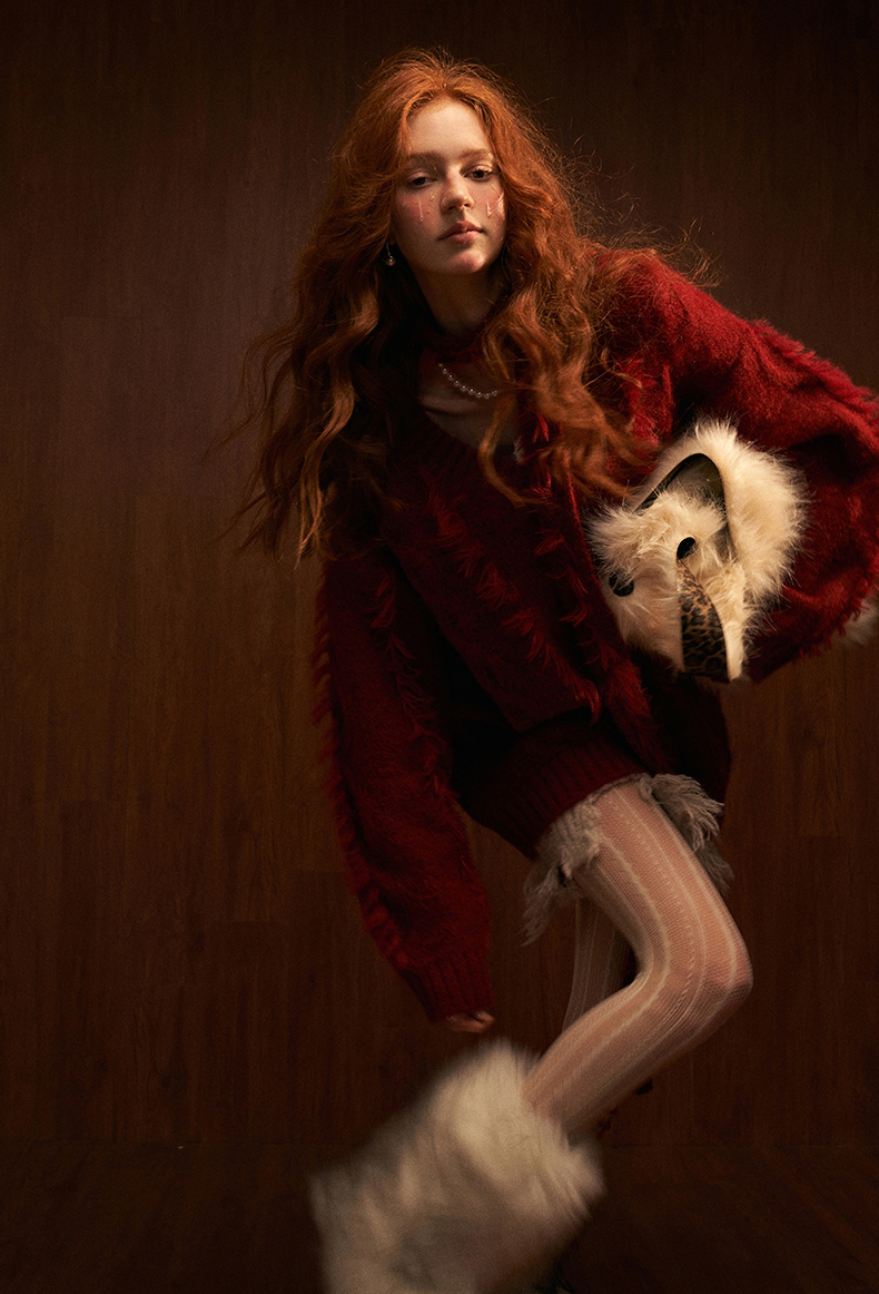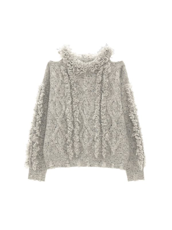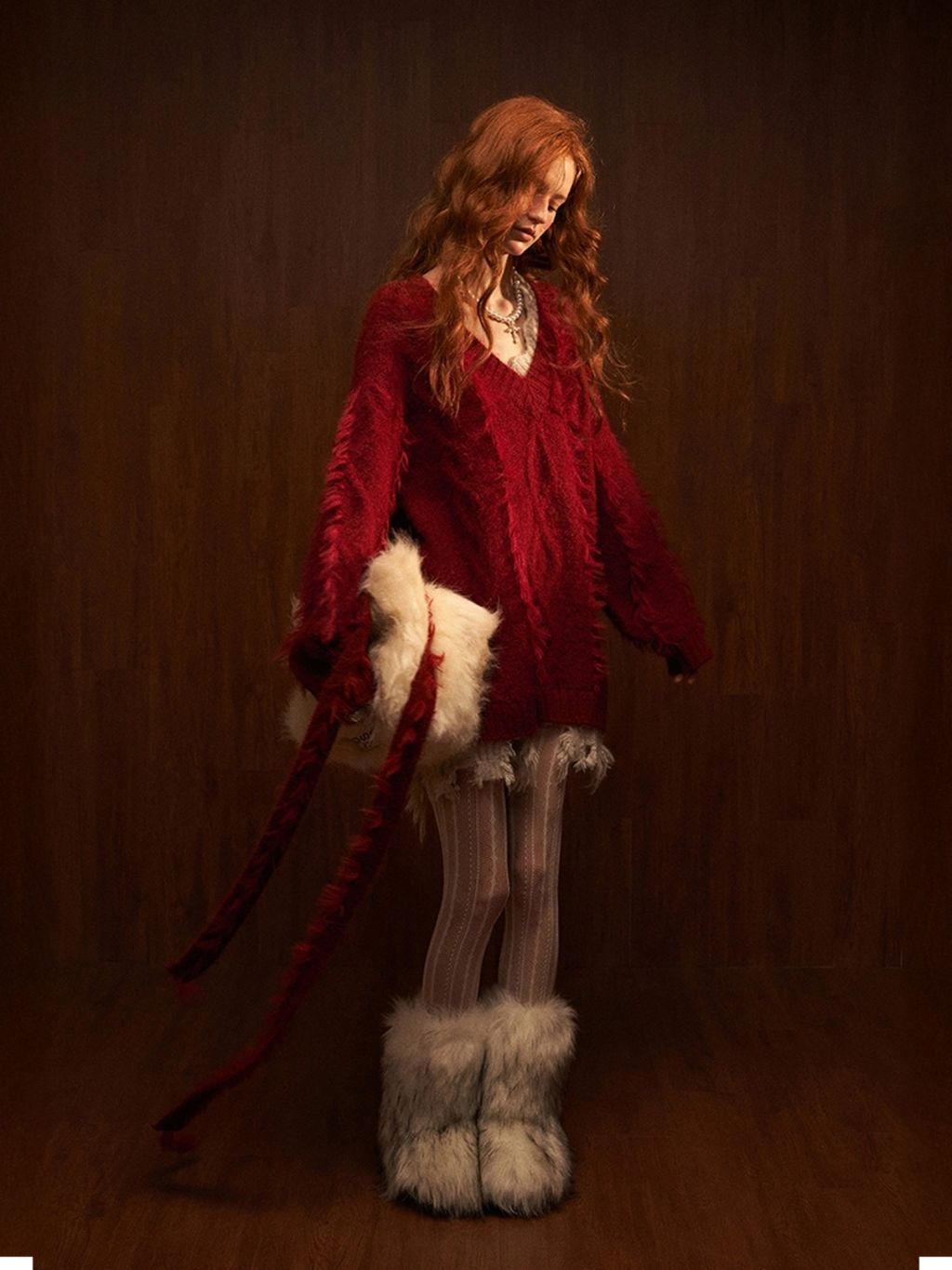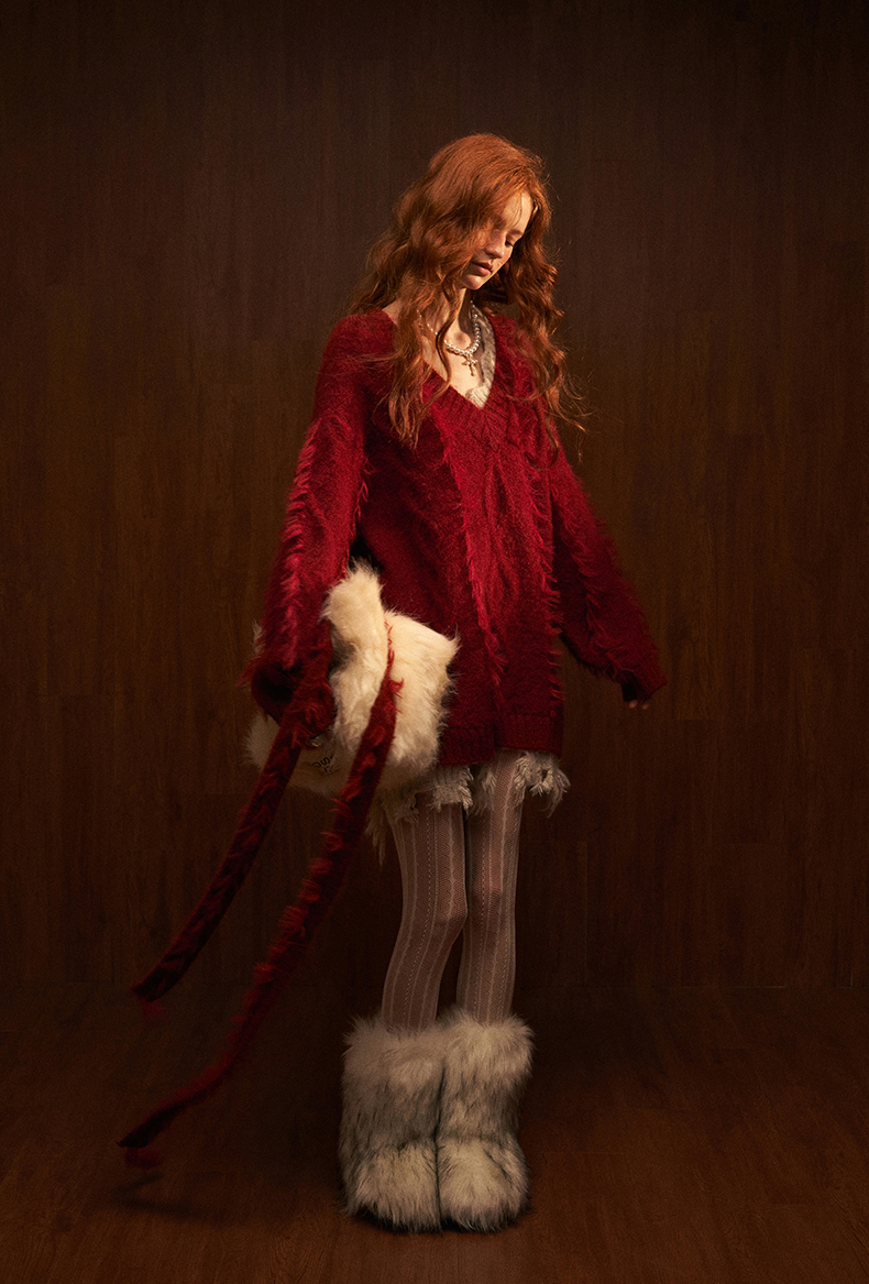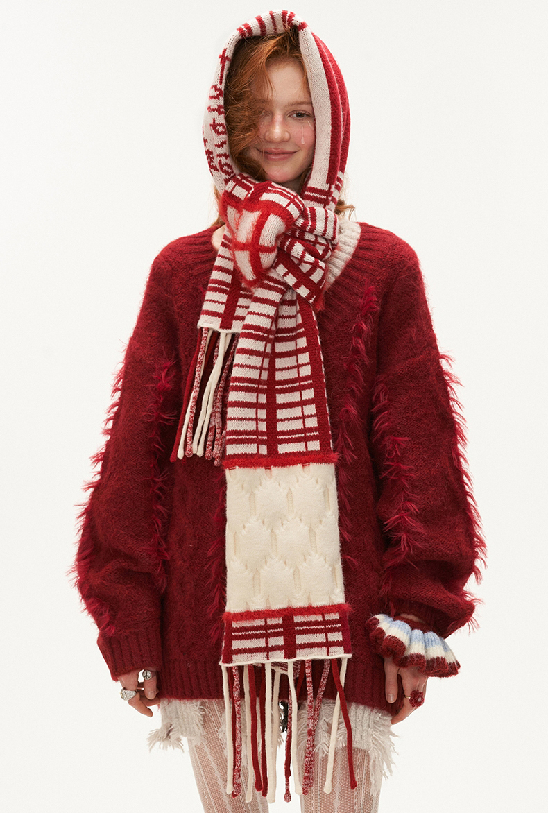 프린지 디테일의 스웨터와 미니 스카프 세트입니다.