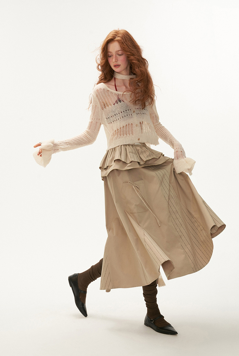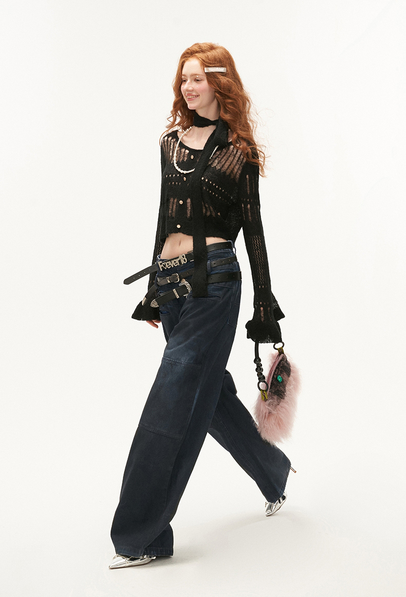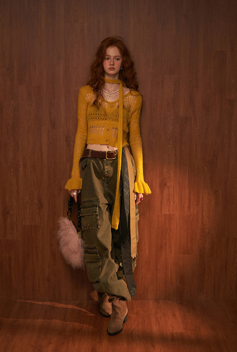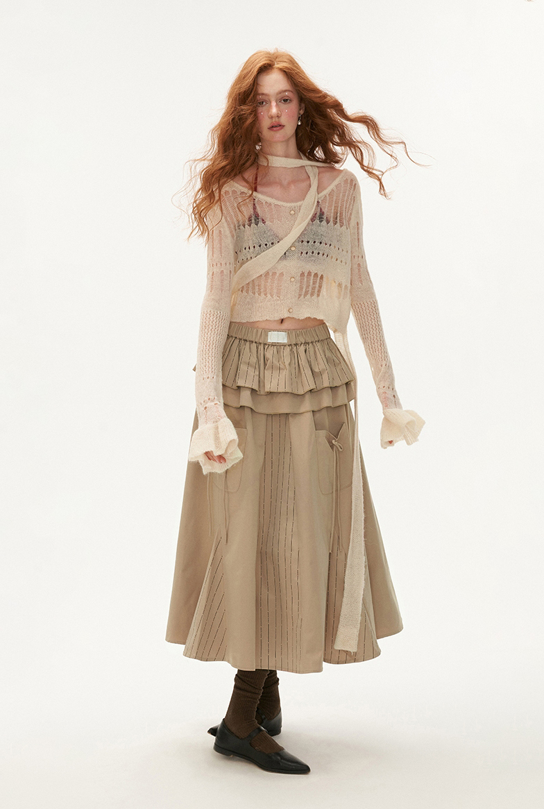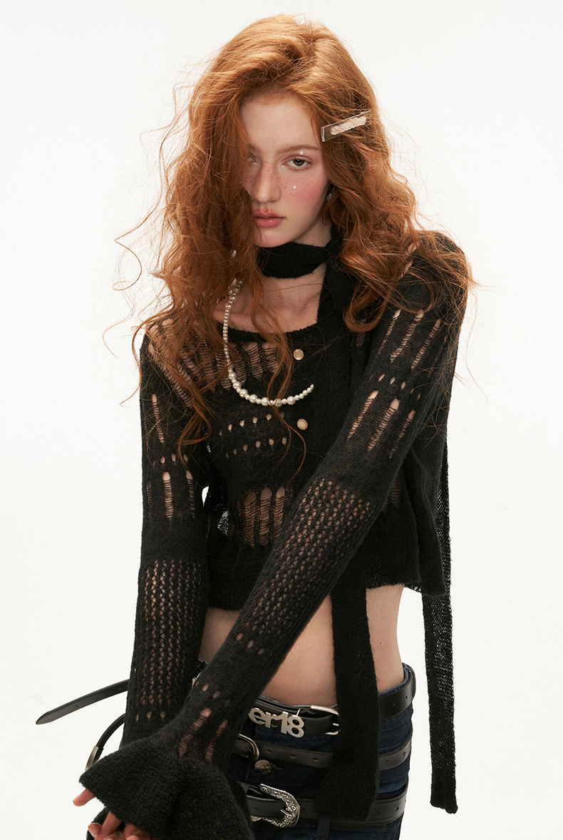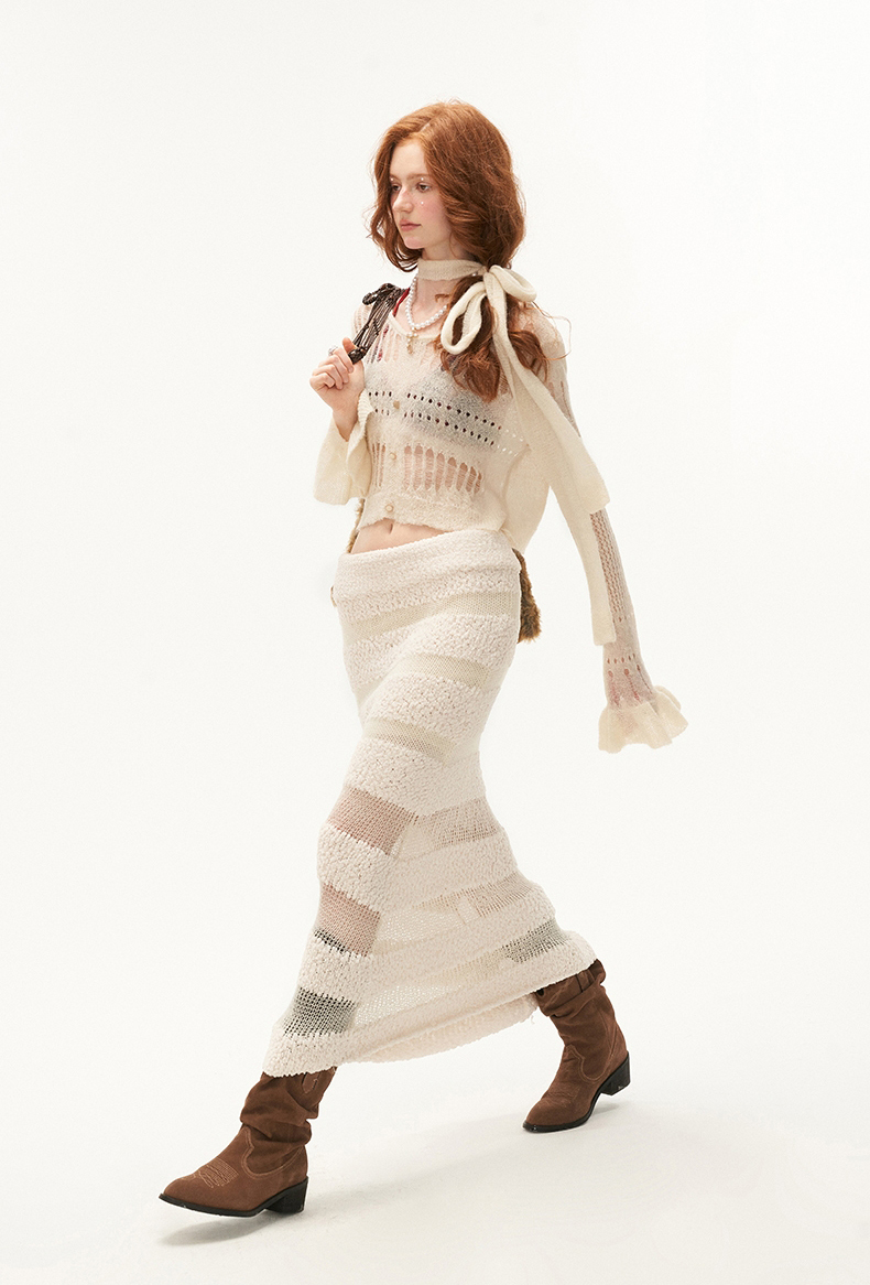 See-Through Knit Striped Knit Sweater & Scarf Set