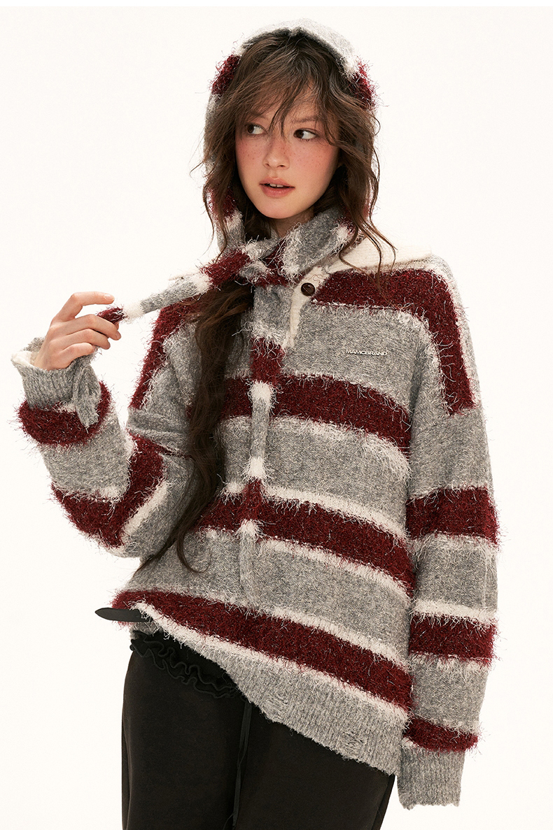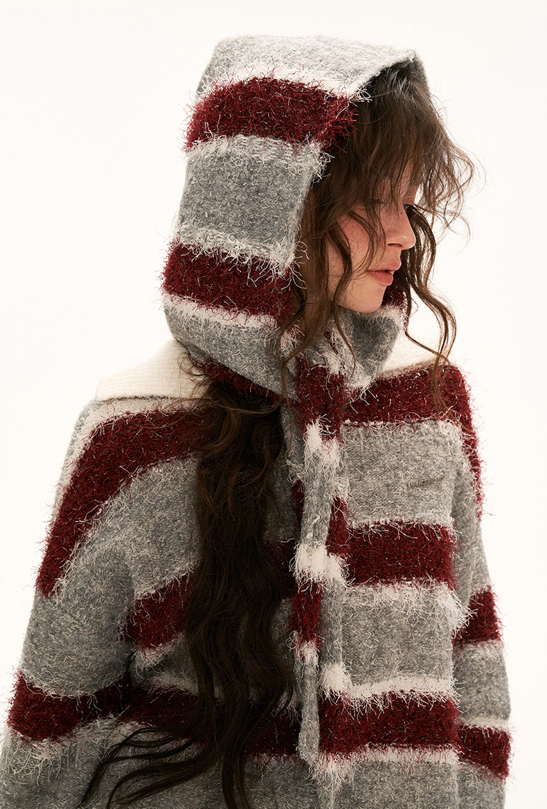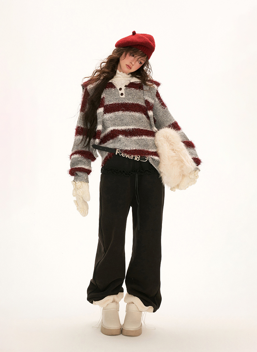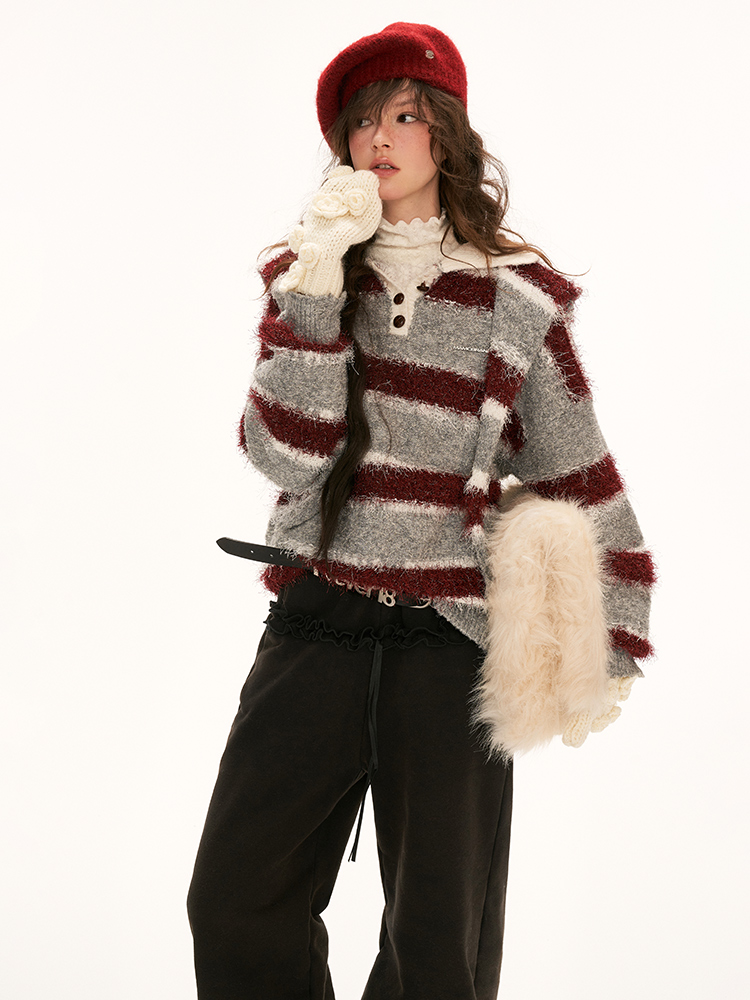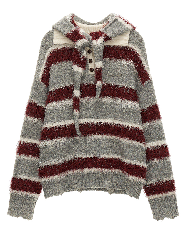 플러피한 원단의 스트라이프 폴로 스웨터입니다.