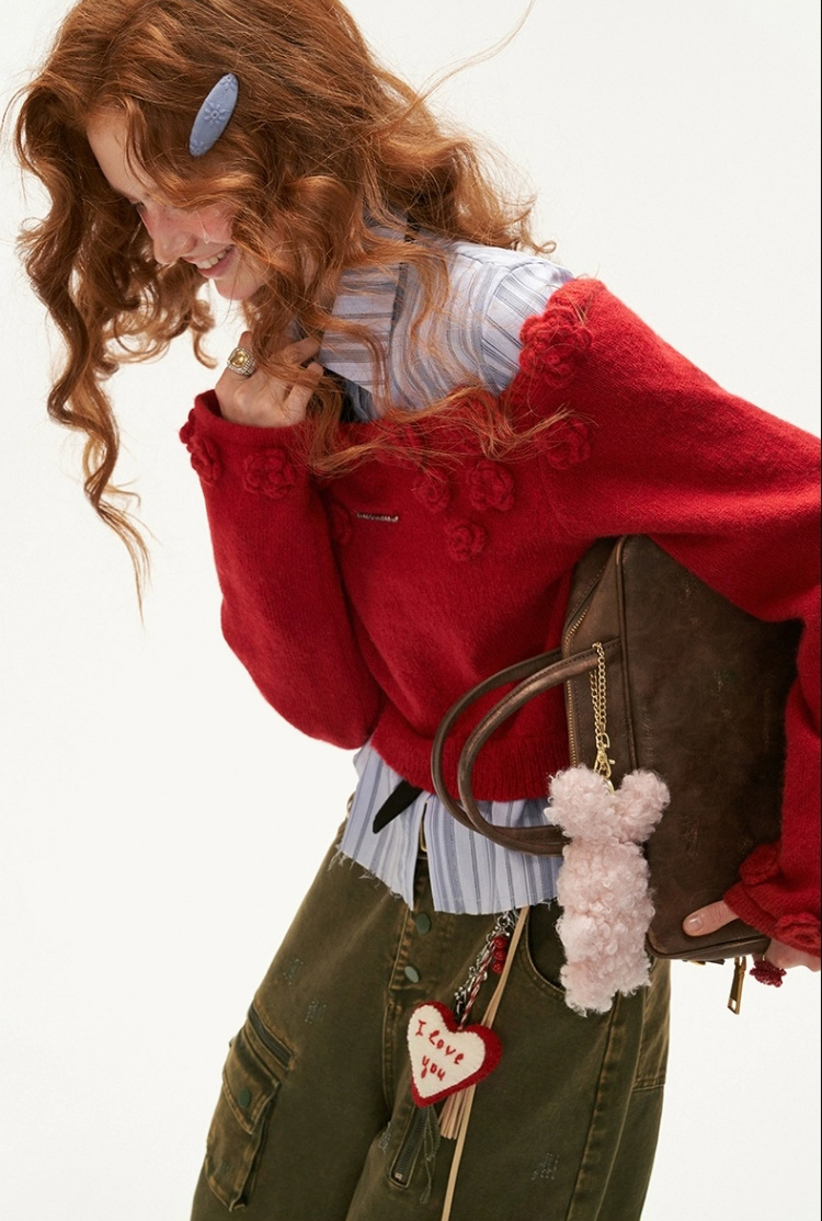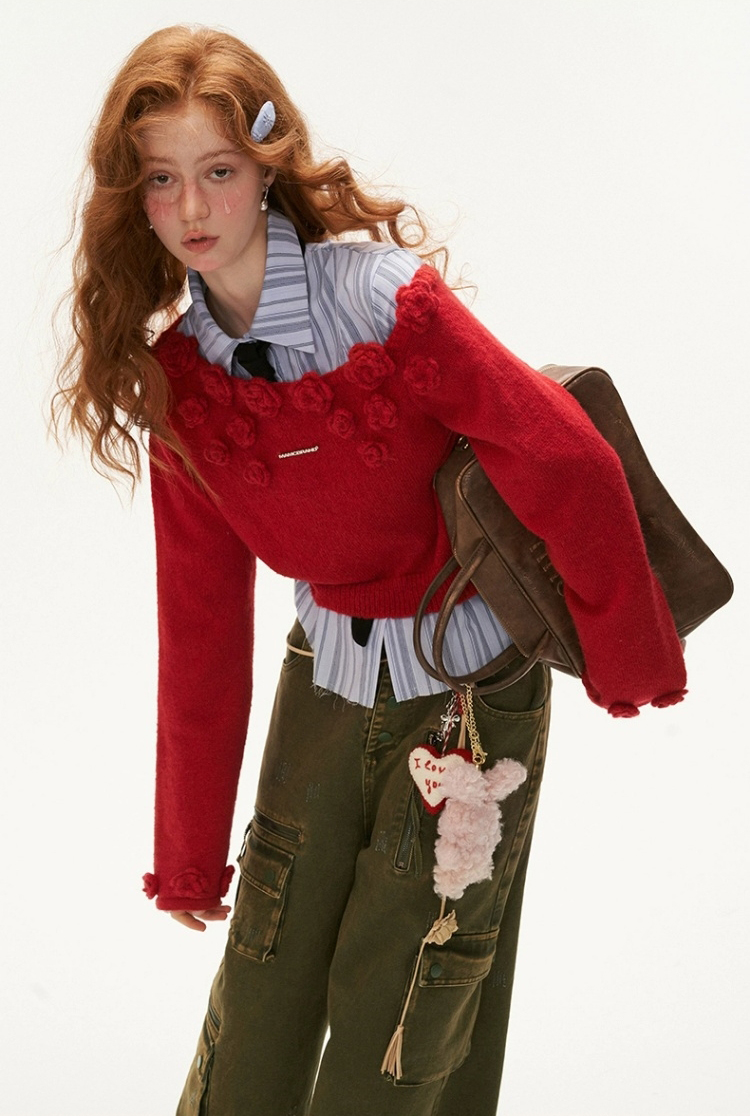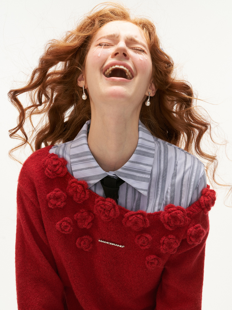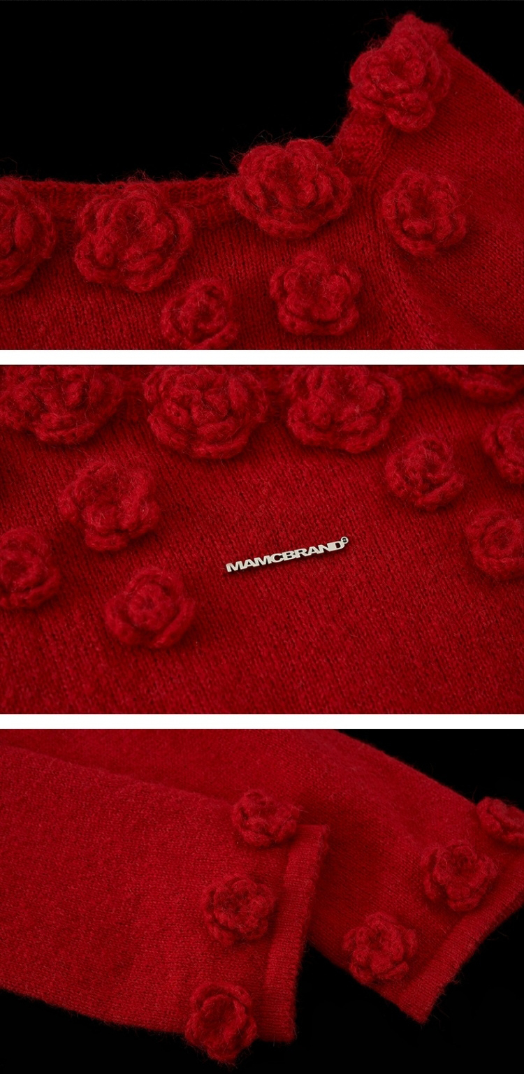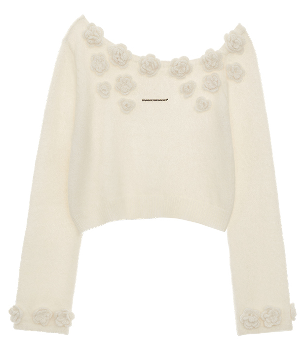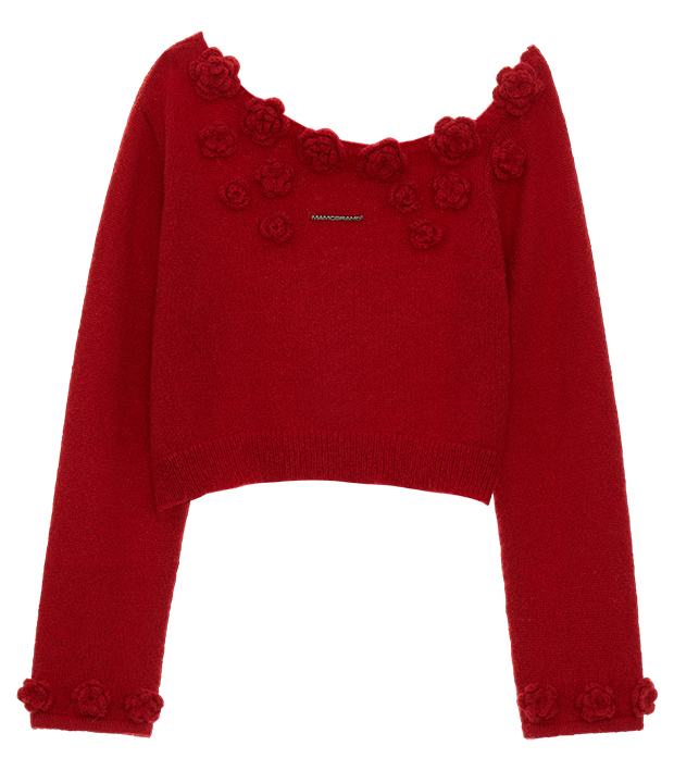 니트 로즈 장식 포인트가 돋보이는 오프숄더 스웨터입니다.