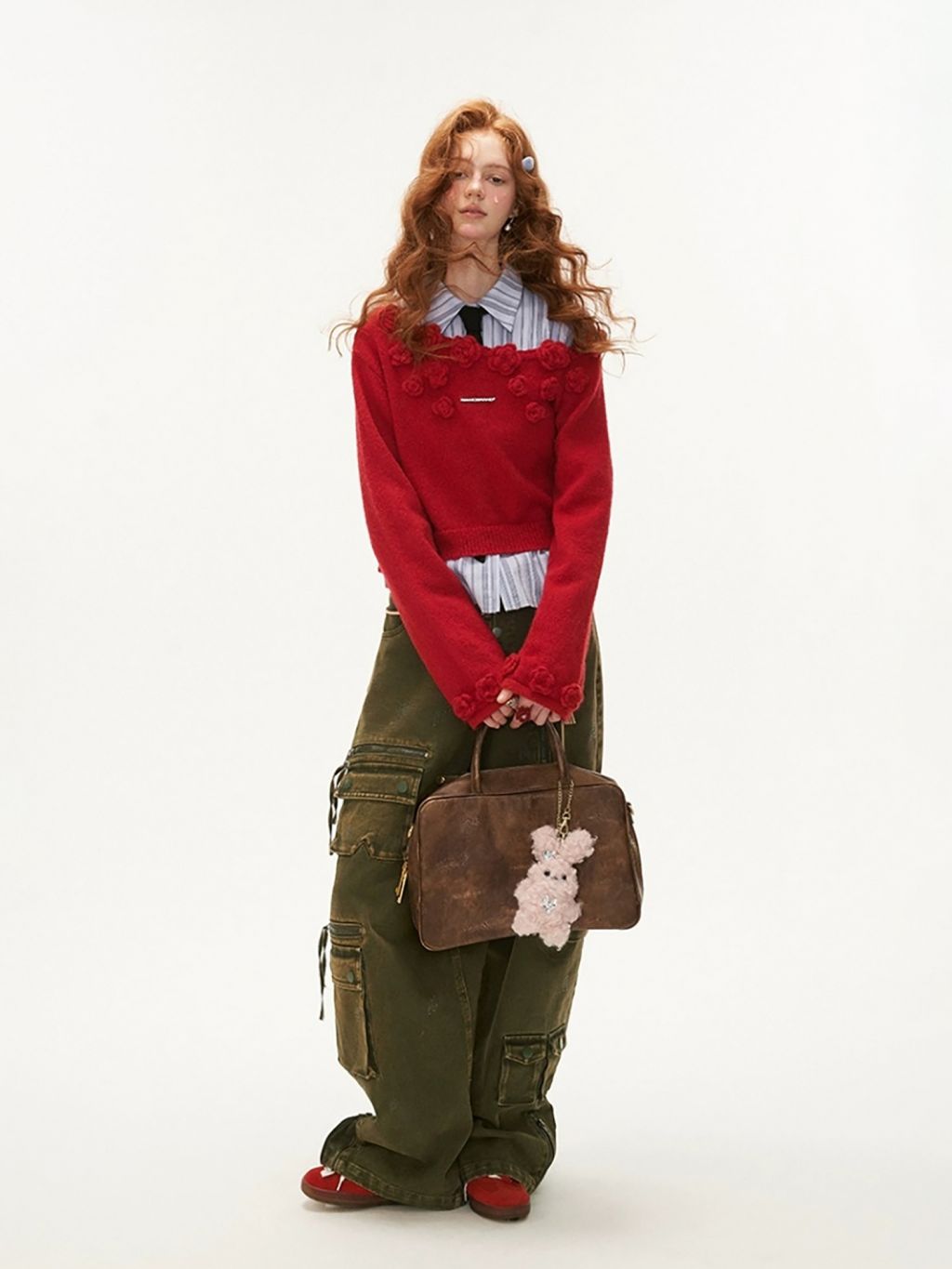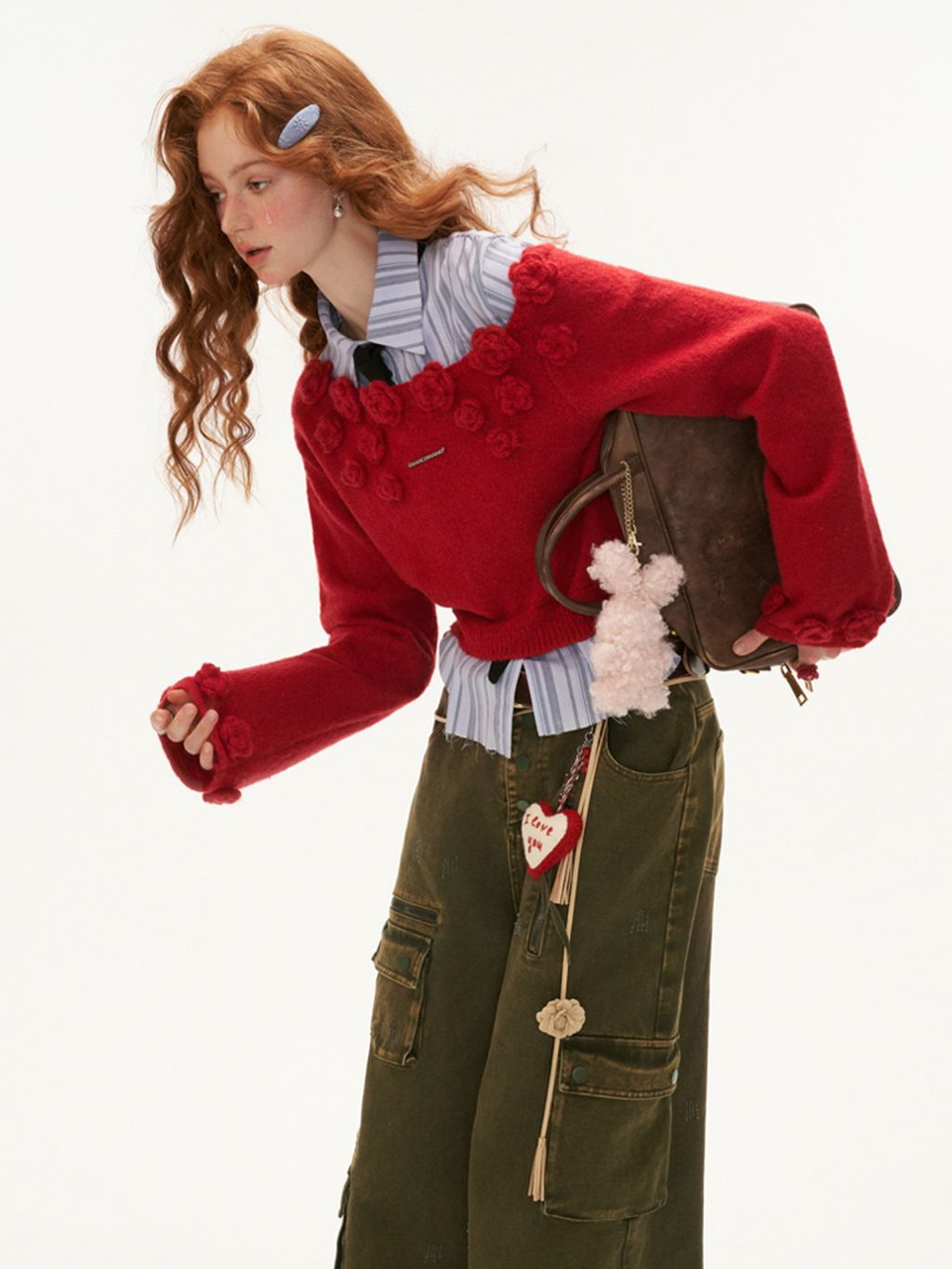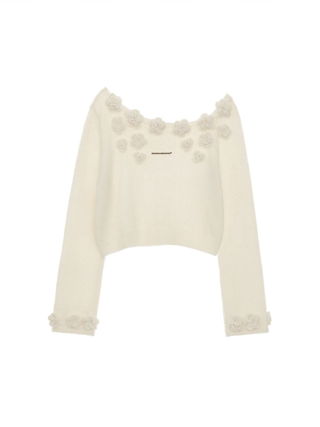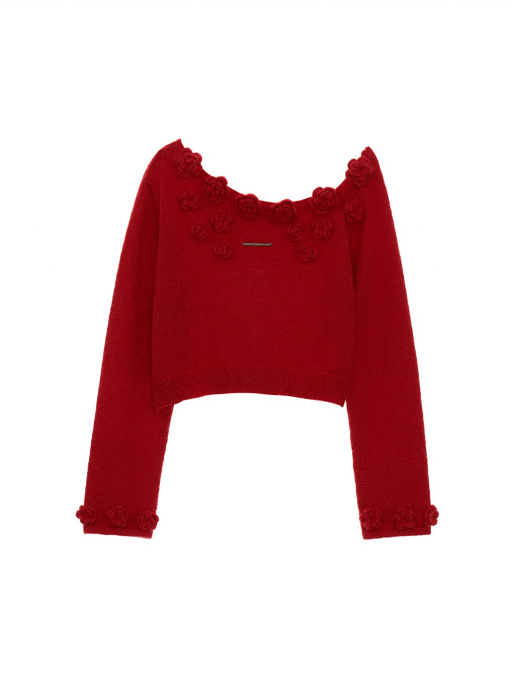니트 로즈 장식 포인트가 돋보이는 오프숄더 스웨터입니다.