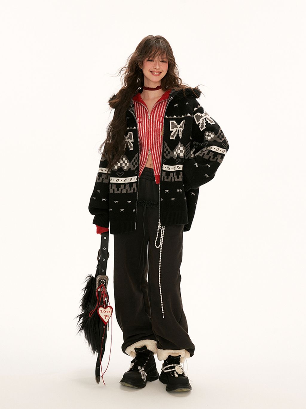 리본 패턴과 배색 플리스 원단으로 포인트를 준 스웻 팬츠입니다.