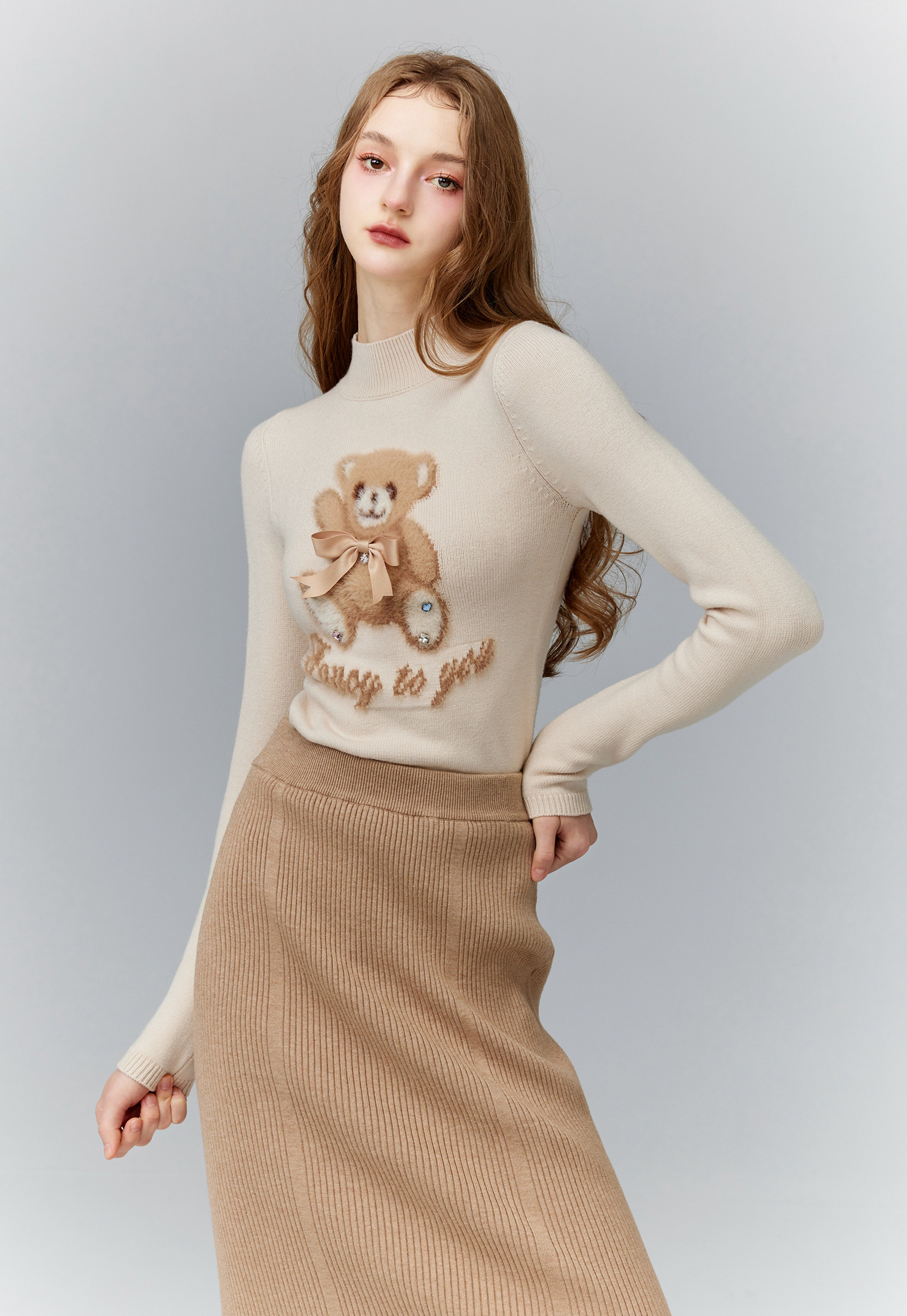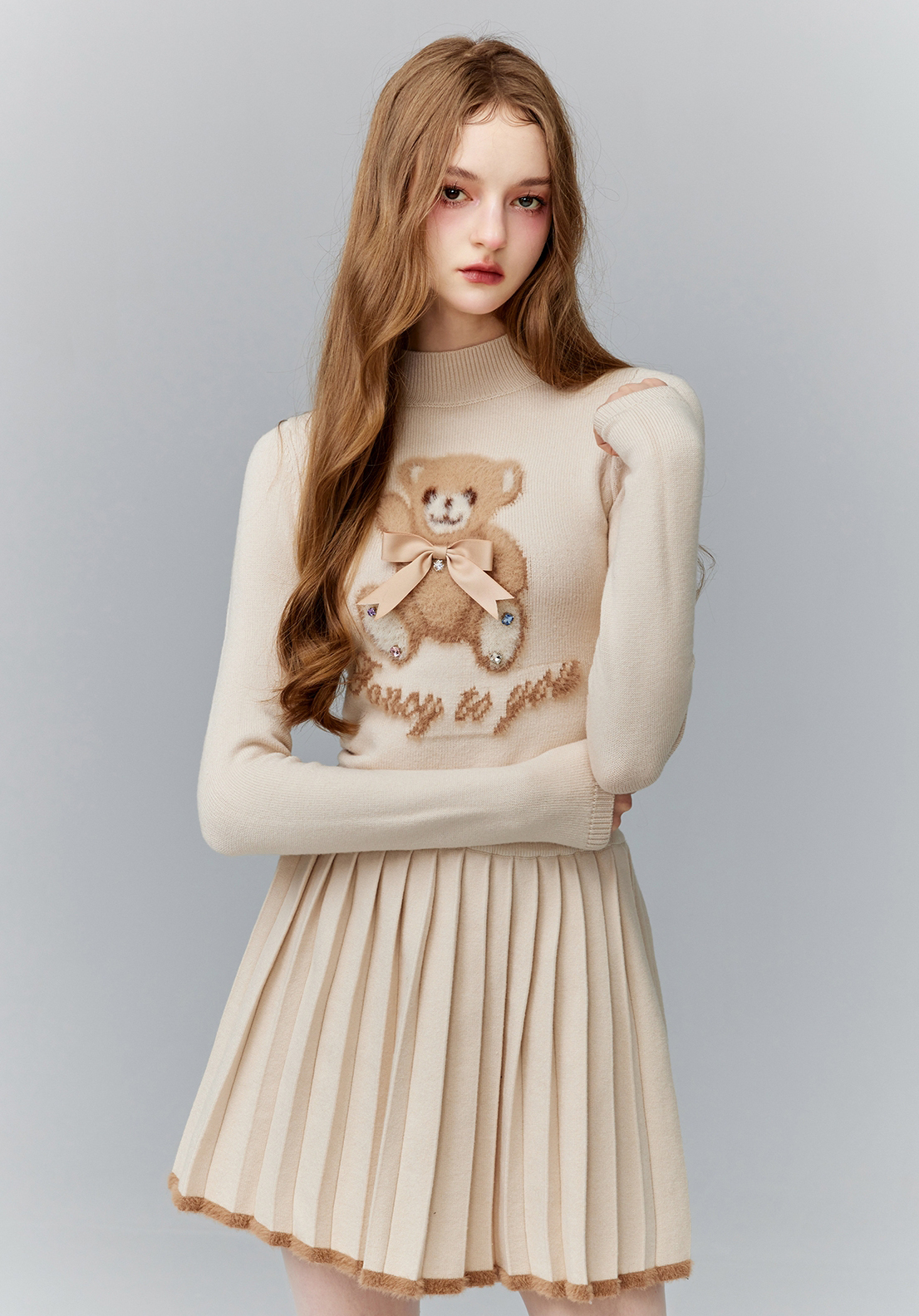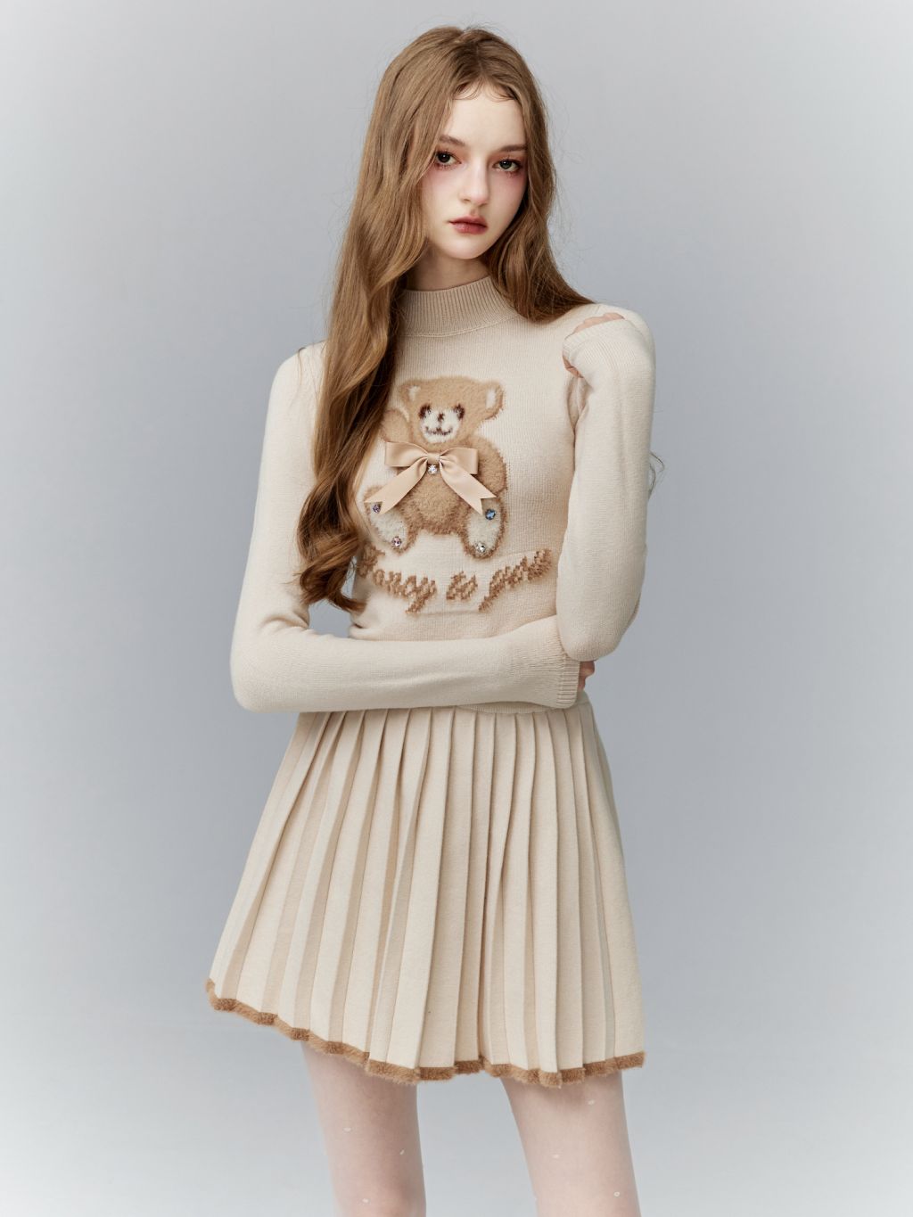 테디베어 패턴이 포인트되는 스웨터 스커트 셋업입니다.