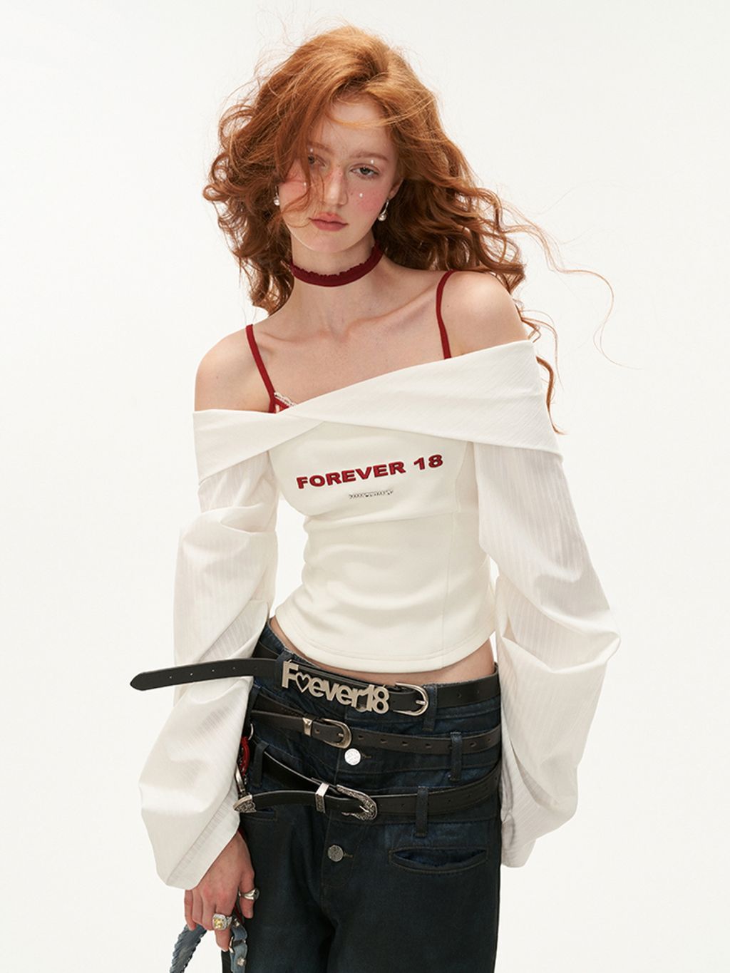 Slant Off-Shoulder White Shirt & Bra Set